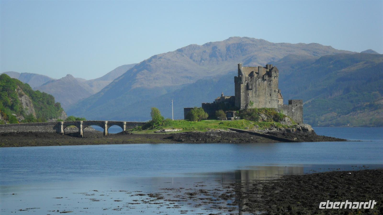 Später, immer noch bei herrlichstem Wetter, fuhren wir zum Eilean Donan Castle, zweifellos eine der schönsten und typischsten Burgen Schottlands. Rein theoretisch ist sie auch eine der bekanntesten, denn sie wird oft als Filmkulisse genutzt. Teile von „Braveheart“ mit Mel Gibson und der „Highlander“-Trilogie mit Christopher Lambert in der Hauptrolle sind hier gedreht worden. hier gedreht worden. Eine kleine Führung durch das im 20 Jh. restaurierte Schloß ließ einiges über die Romantik schottischer Clansitze erahnen. Nicht weit vom Castle erreichten wir unser heutiges Tagesziel - das direkt am Ufer gelegenen „Kyle of Lochalsh Hotel“. Wir checkten ein und genossen das Abendessen, bei dem sogar Fasanenbrust in der Auswahl stand.