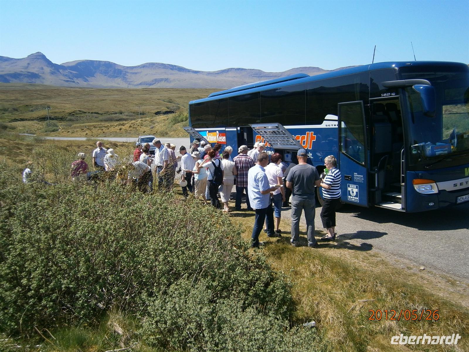 Immer noch war das Wetter einsame Spitze, fast zu warm für Schottland. Wieder ging es über die relativ neue Betonbrücke, die die Insel Skye mit dem „Festland“ verbindet, ins Inselinnere. Nach kurzem Stopp in Broadford, einem typischen Inseldörfchen mit kurzem Strandspaziergang (und etwas Zeit zum Einkauf für mich, da wir zu Mittag eine kleine Überraschung vorhatten) ging es weiter in die Inselhauptstadt Portree. Die kleine Hafenstadt mit ihrem Marktplatz, vor allem aber ihren buntbemalten Hausern rund um die Hafenbucht ist ein oft und gern gezeigtes Fotomotiv. Bei strahlendem Sonnenschein hatten wir genügend Zeit, das Städtchen ganz gut kennenzulernen - von seinem kleinen historischen Marktkreuz bis zum Aussichtspunkt über den Hafen. Nach Aufenthalt hier brachte uns der Bus entlang dem Storr-Gebirge zum Aussichtspunkt mit der Felsnadel „Old Man of Storr“. Dieser seltsam geformte Felsen ragt etwa fünfzig Meter hoch schräg aus dem Mittelgebirge heraus und gehört zu den beliebtesten Fotomotiven der malerischen Hebrideninsel. Danach ging es weiter zur Steilküste von Skye. Hier legten wir eine kleine Klippenwanderung mit anschließender Mittagspause direkt an den „Lealt Falls“ ein. Während unsere Gäste den kurzen Wanderweg zur pittoresken Klippenszenerie hinausliefen, bereiteten Busfahrer Bernd und ich die Mittagsüberraschung vor: ein landestypisches Picknick mit Cider, dem gern getrunkenen moussierenden Apfelwein, frischen Brötchen, Schinken Käse, Kohlsalat und einigem mehr. Daran, dass alles alle wurde und die Reisenden sich immer wieder begeistert äußerten, konnten wir erkennen, dass es eine gute Idee gewesen war!