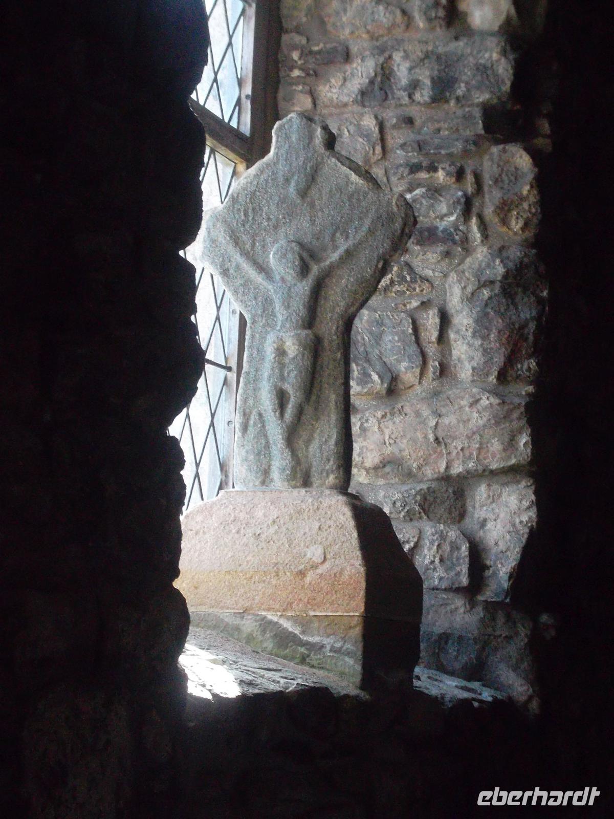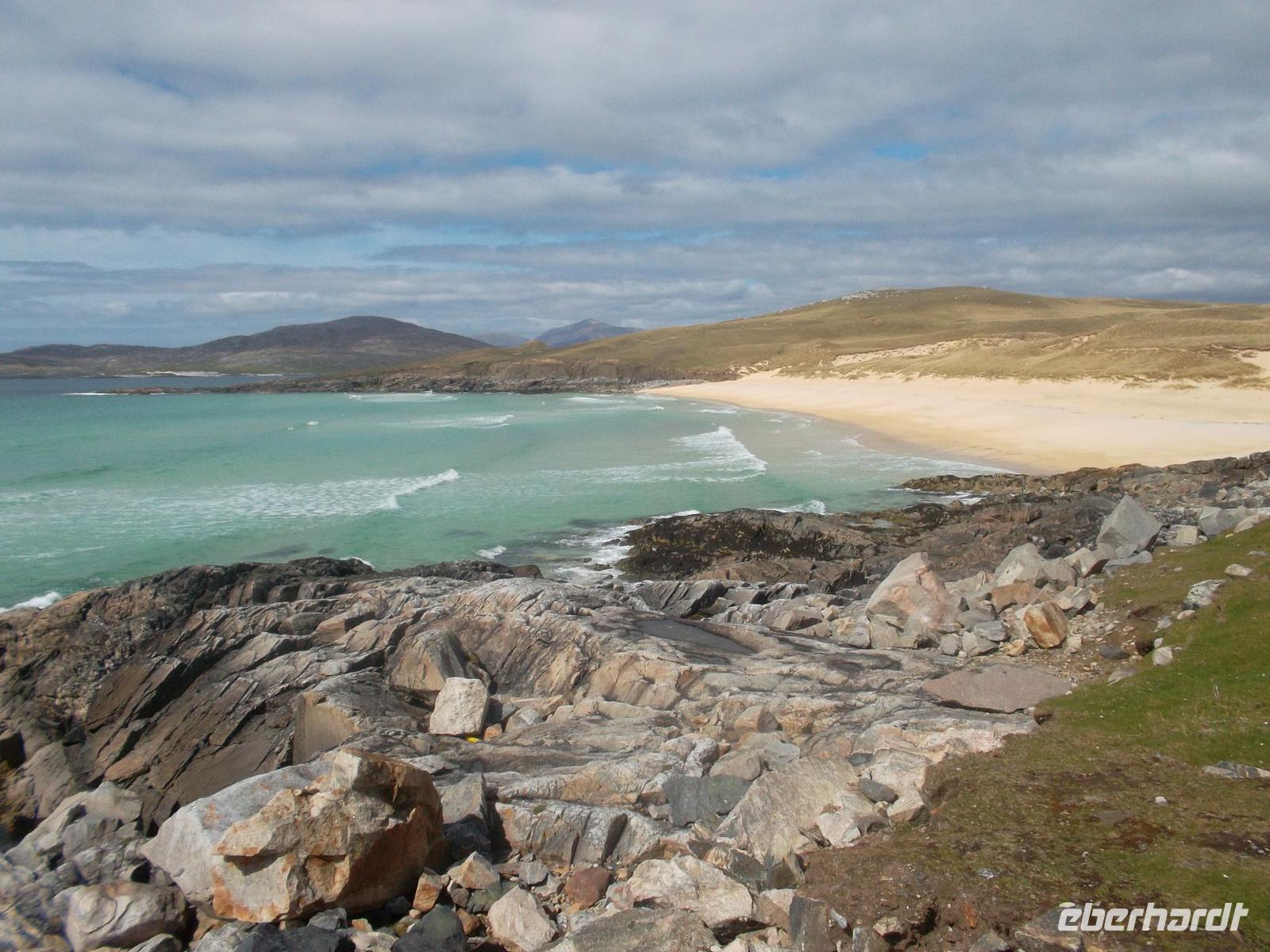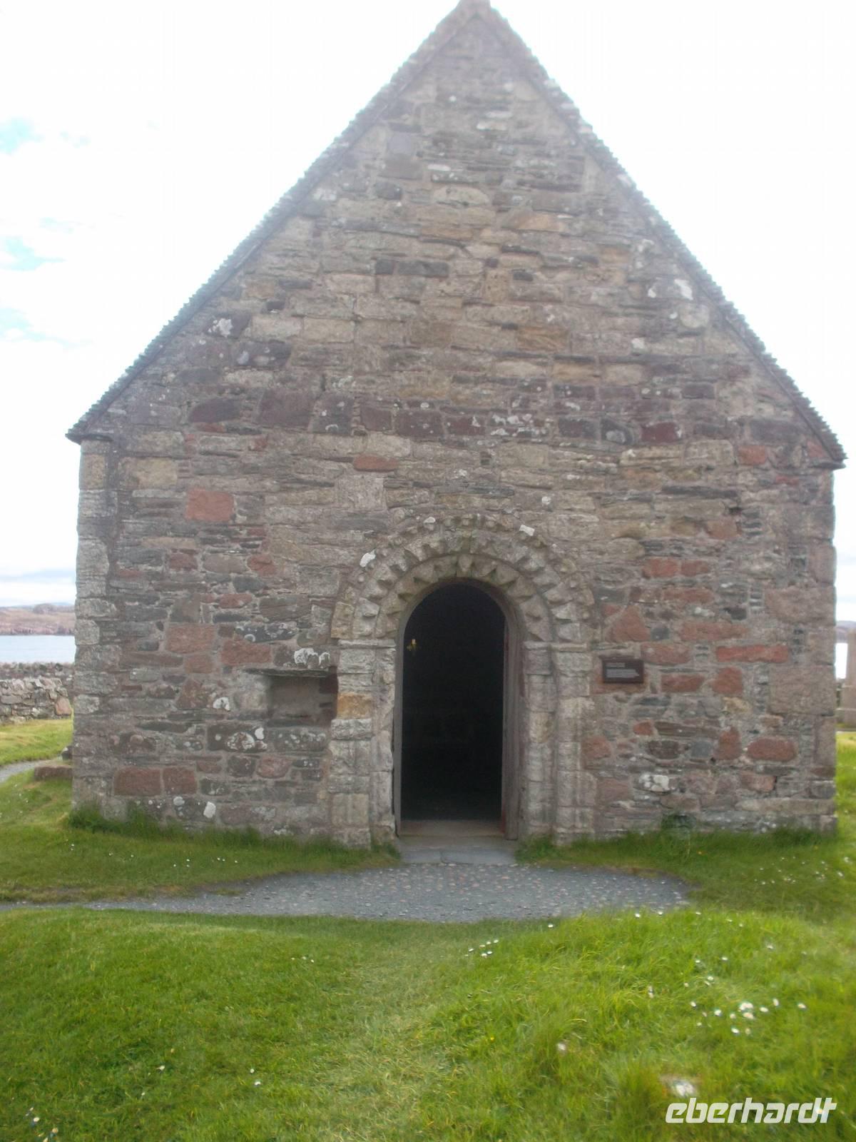Die Nachbarinsel Harris war unser nächstes Ziel - eine dünnbesiedelte Insel, bekannt für Schafzucht und die festen Harris-Tweed-Stoffe, für verblüffend schöne Sandstrände mit schneeweißem Sand und kristallklarem türkisblauen Wasser und für ihre zerklüftete Felsenwildnis. Nach einer Durchfahrt durch die Insel mit statteten wir der Kirche von Rogadhal noch einen Besuch ab. Die an der Südspitze von Harris gelegene Wehrkirche wird den Templern zugeschrieben, später wurde sie umgebaut und enthält heute als Besonderheiten ein skulpturiertes Grabmal und eine besonders seltene Fensterfigur des gekreuzigten Jesus - ein Sakralbau mit geheimnisvoller Aura!
