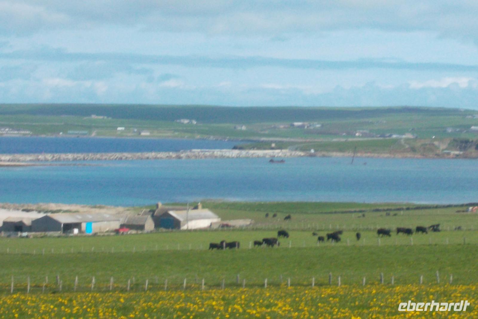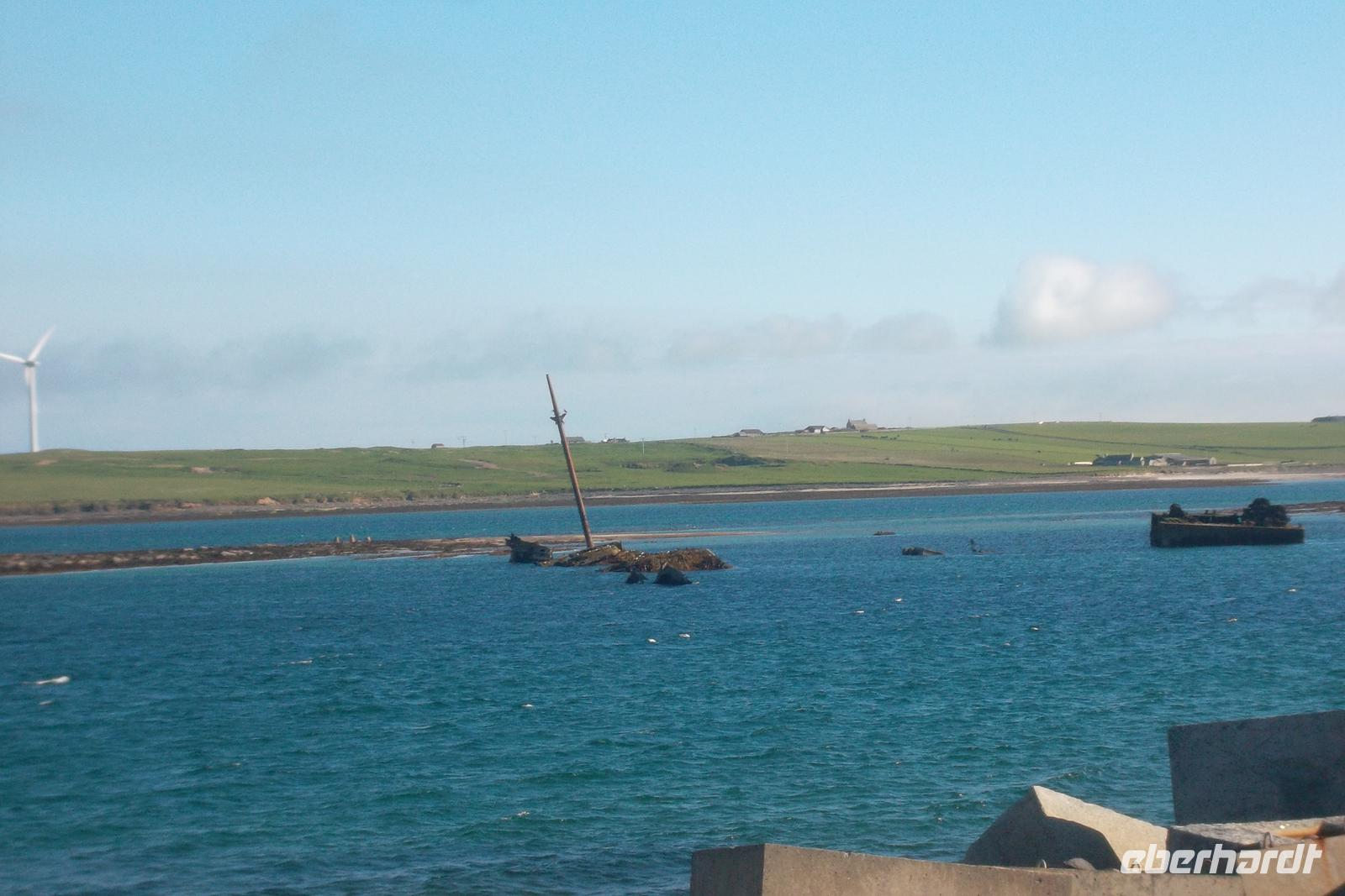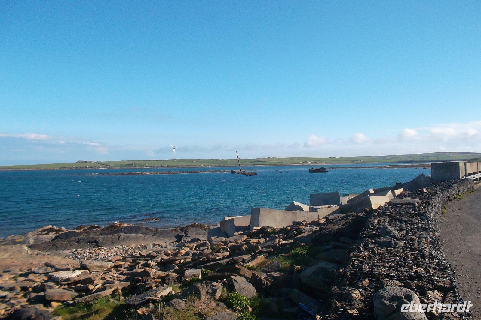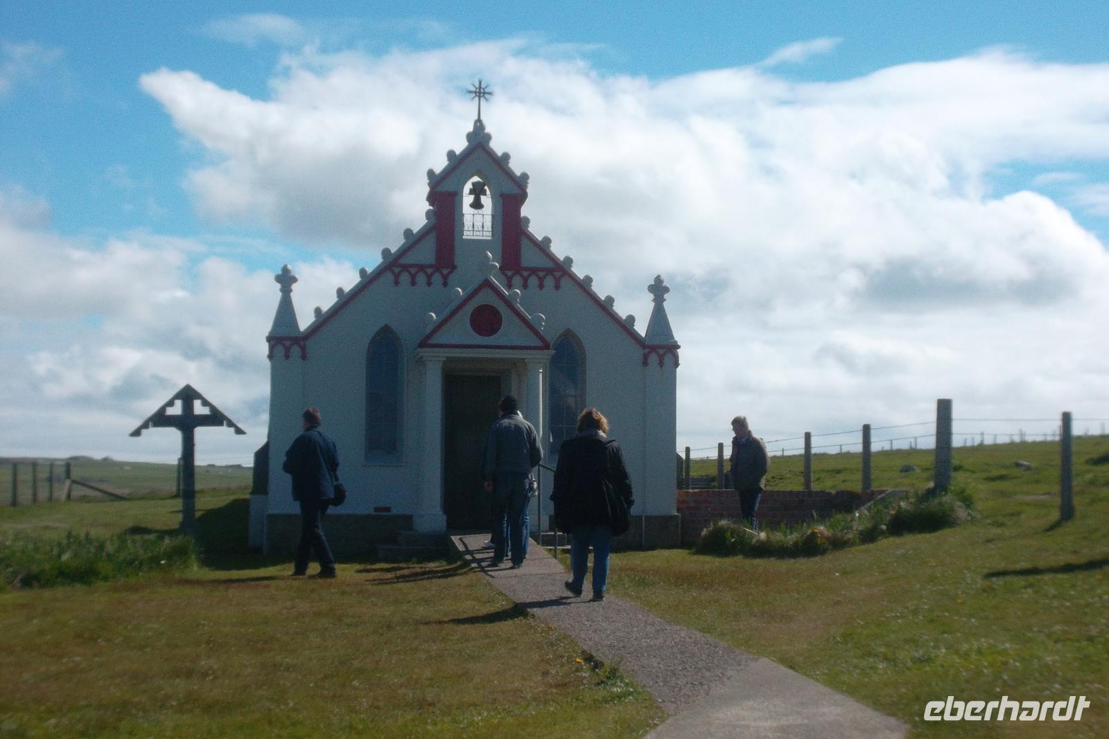 Unser Bus brachte uns früh in den Fährhafen von John O'Groats. Von hier, dem nordöstlichsten Punkt der britischen Hauptinsel, nahmen wir dann die Passagierfähre nach Burwick auf den Orkney-Inseln. Dort erwartete uns ein schottischer Bus und mit dem sehr kooperativen Fahrer Stuart umrundeten wir zunächst die berühmte Bucht von Scapa Flow. Einst war diese gewaltige natürliche Bucht nicht nur Stationierungsort der britischen Home Fleet, sondern hier ereignete sich im ersten Weltkrieg die spektakuläre Selbstversenkung der deutschen Kriegsflotte. Von ehemals vierundsiebzig versenkten Kriegsschiffen liegen noch heute sieben auf dem Grund der Bucht - allerdings sieht man sie nicht, im Gegensatz zu ein paar Wracks, die man heute noch sehen und fotografieren kann: Es sind Überreste aus dem zweiten Weltkrieg und gehören zu einer U-Boot Sperre, die auf Befehl des damaligen Premierministers Winston Churchill angelegt worden war. Nach einem unerwarteten und erfolgreichen Angriff eines deutschen U-Bootes, bei dem das britische Flaggschiff „Royal Oak" mit 800 Besatzungsmitgliedern gesunken war, hatte Churchill sofortige Sperrung der Zufahrten nach Scapa Flow verfügt. Nachdem als Provisorium alte Fracht- und Fischereischiffe versenkt worden waren, wurden später Dämme aus Sand und Beton errichte, die heute sogenannten „Churchill Barrieren". Auf diesen entlang fuhren wir zur „italienischen Kapelle". Das interessante Kirchlein ist ein Stück lebendige Geschichte aus der Zeit des zweiten Weltkrieges und wurde von italienischen Kriegsgefangenen hier während ihrer Internierung errichtet.