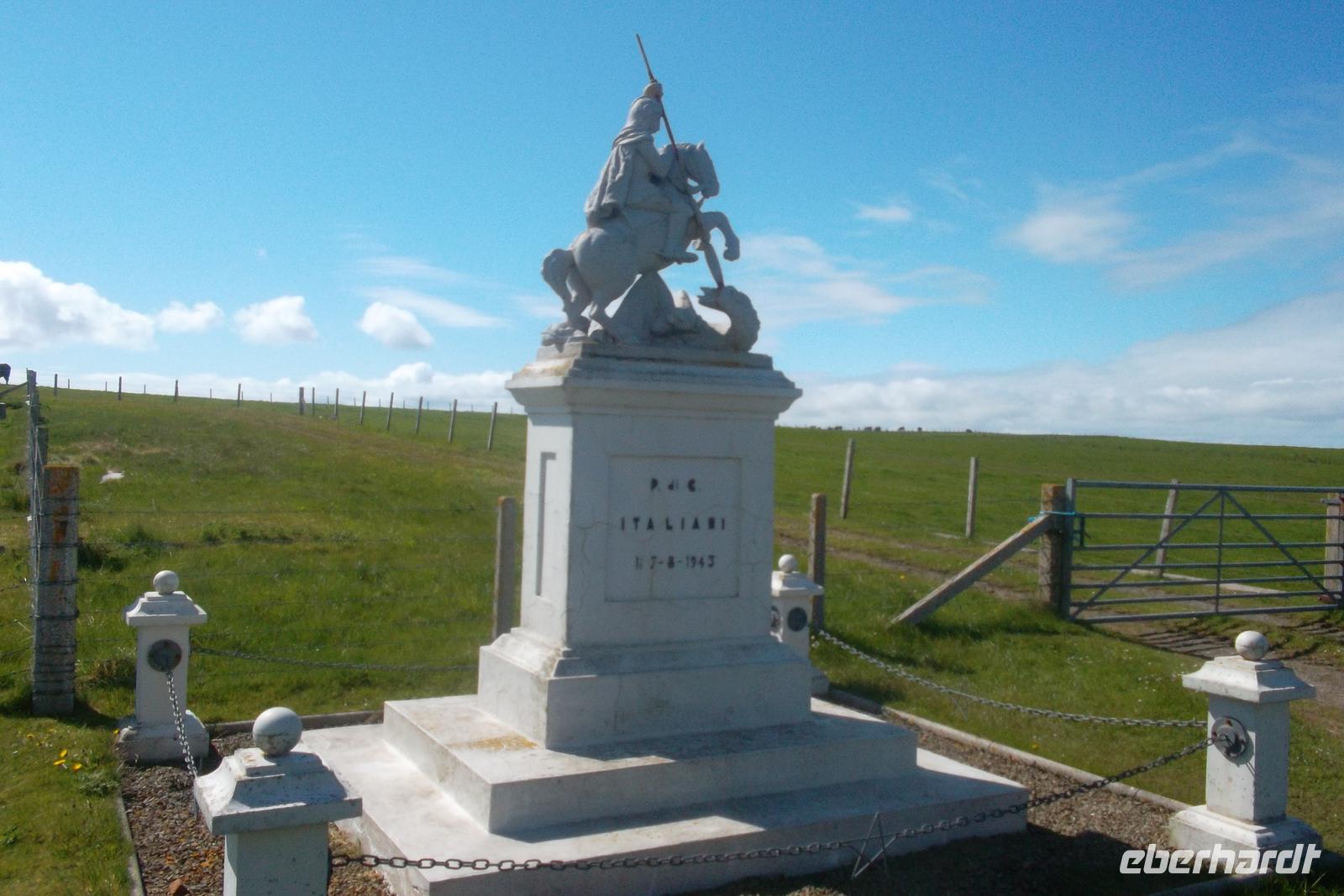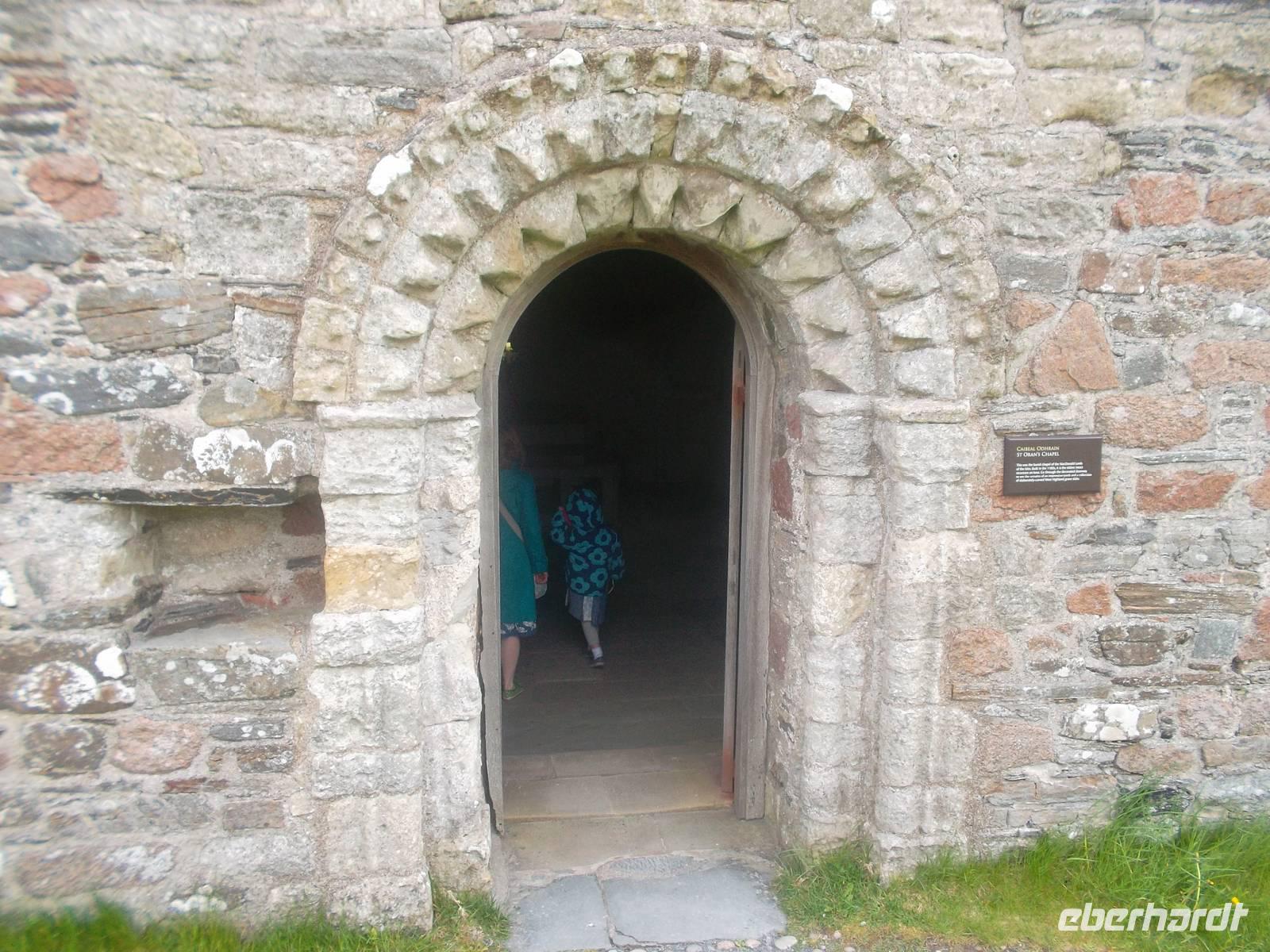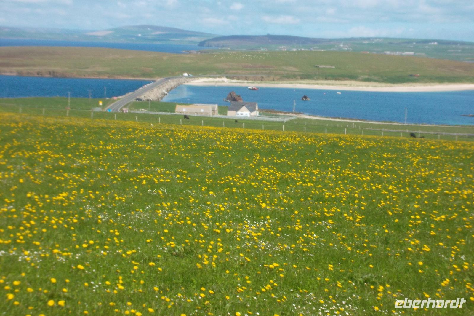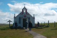 Unser Bus brachte uns früh in den Fährhafen von John O'Groats. Von hier, dem nordöstlichsten Punkt der britischen Hauptinsel, nahmen wir dann die Passagierfähre nach Burwick auf den Orkney-Inseln. Dort erwartete uns ein schottischer Bus und mit dem sehr kooperativen Fahrer Stuart umrundeten wir zunächst die berühmte Bucht von Scapa Flow. Einst war diese gewaltige natürliche Bucht nicht nur Stationierungsort der britischen Home Fleet, sondern hier ereignete sich im ersten Weltkrieg die spektakuläre Selbstversenkung der deutschen Kriegsflotte. Von ehemals vierundsiebzig versenkten Kriegsschiffen liegen noch heute sieben auf dem Grund der Bucht - allerdings sieht man sie nicht, im Gegensatz zu ein paar Wracks, die man heute noch sehen und fotografieren kann: Es sind Überreste aus dem zweiten Weltkrieg und gehören zu einer U-Boot Sperre, die auf Befehl des damaligen Premierministers Winston Churchill angelegt worden war. Nach einem unerwarteten und erfolgreichen Angriff eines deutschen U-Bootes, bei dem das britische Flaggschiff „Royal Oak" mit 800 Besatzungsmitgliedern gesunken war, hatte Churchill sofortige Sperrung der Zufahrten nach Scapa Flow verfügt. Nachdem als Provisorium alte Fracht- und Fischereischiffe versenkt worden waren, wurden später Dämme aus Sand und Beton errichte, die heute sogenannten „Churchill Barrieren". Auf diesen entlang fuhren wir zur „italienischen Kapelle". Das interessante Kirchlein ist ein Stück lebendige Geschichte aus der Zeit des zweiten Weltkrieges und wurde von italienischen Kriegsgefangenen hier während ihrer Internierung errichtet.