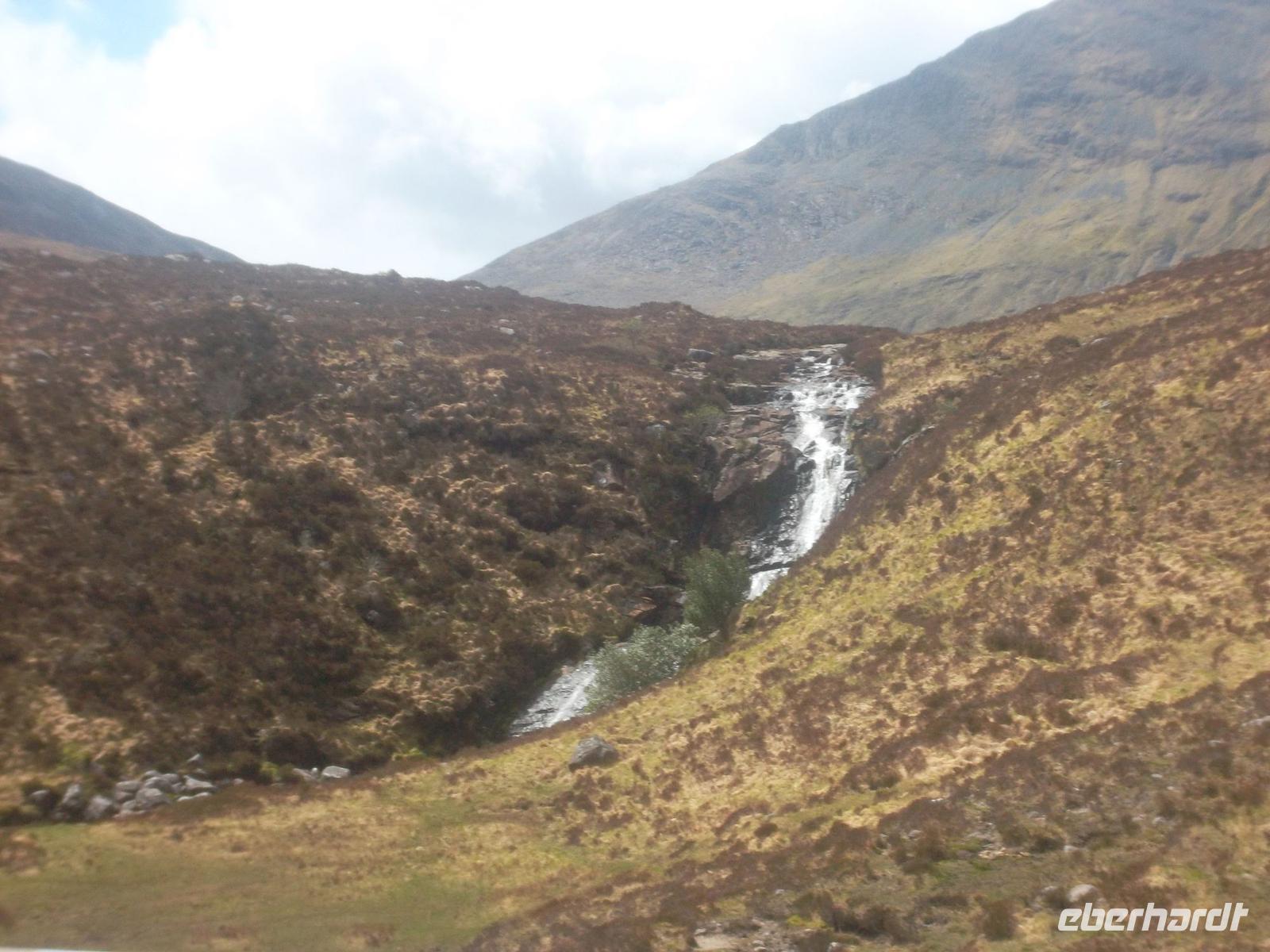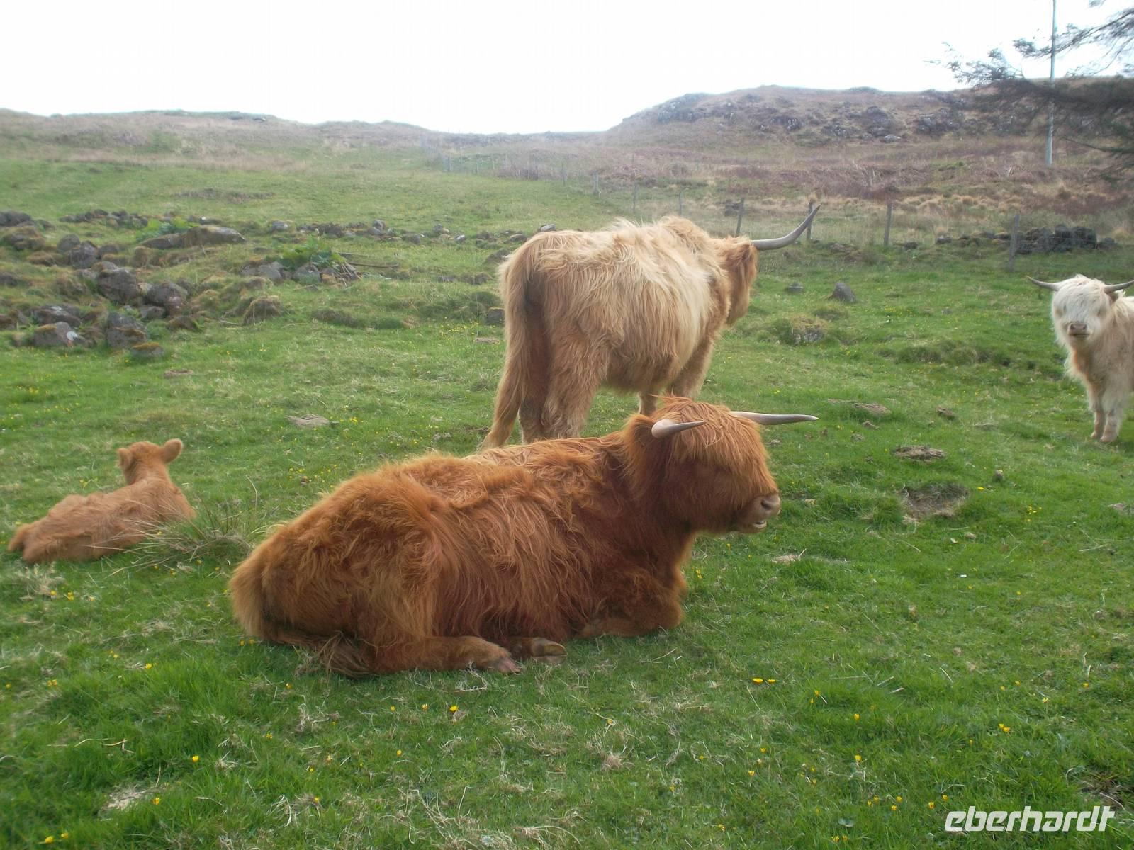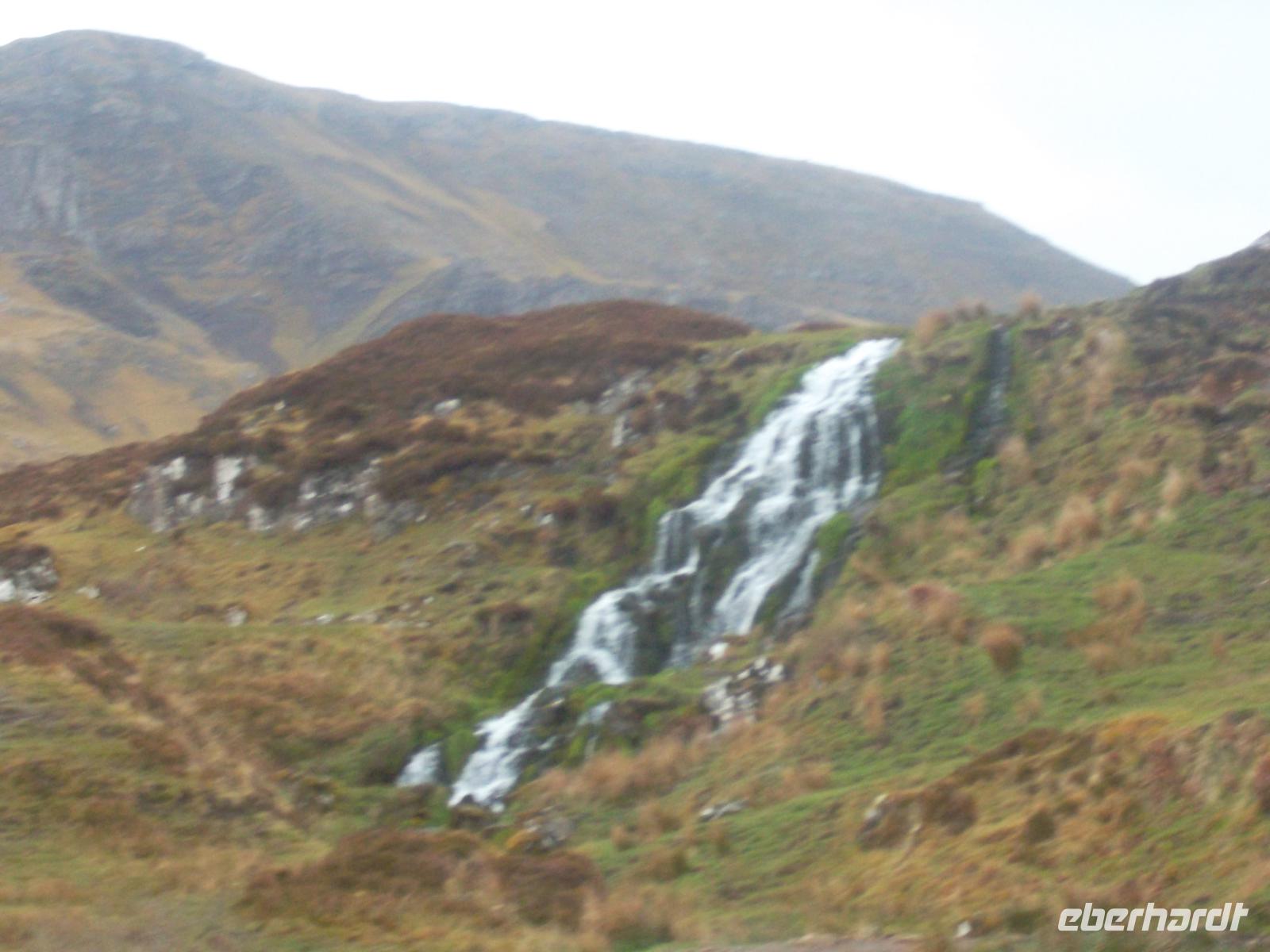 Nach weiteren Fotostopps erreichten wir den Hafen von Mallaig. Die Fährüberfahrt von hier nach Skye dauerte etwa 30 min, dann war die größte Insel der Inneren Hebriden erreicht. Skye hat - mit etwas Phantasie - auf der Landkarte die Form eines Engels, und damit begründen die Einwohner auch ihren landschaftlichen Zauber. Nach Fotostopps unterwegs und an einem Wasserfall kamen wir - als „Extra des Tages" - zu einer Verkostung typischen Malzwhiskies. Eine der berühmten Insel-Destillen ist Talisker - bekannt für den betont torfigen und rauchigen Geschmack ihres „Lebenswassers" - denn nichts anderews heißt „Whisky" in Verkürzung des gälischen „uuisghe beaha".