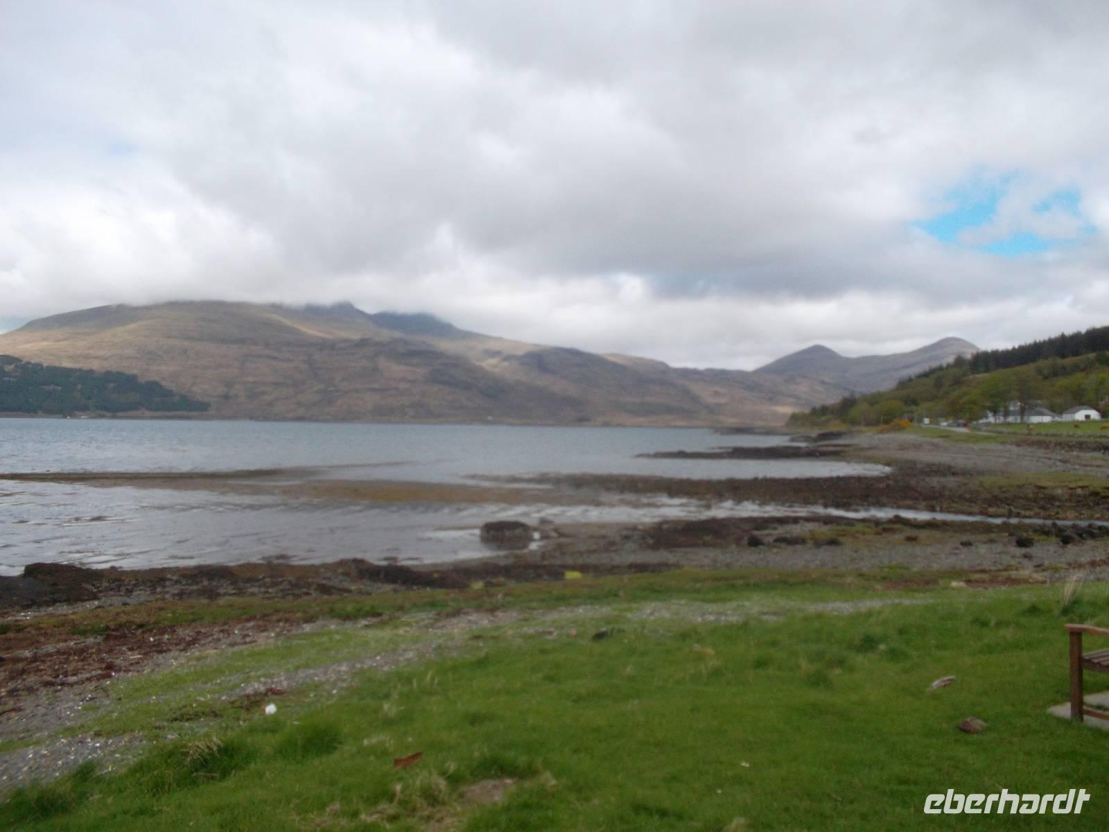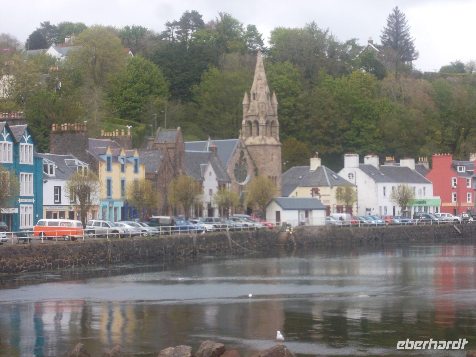 Oberhalb des Loch Lomond beginnen schon die schottischen Highlands und wir machte noch einen ausgedehnten Fotostopp in einemr der südlichsten Highland-Orte. Gelegen am Ende des Loch Fyne, einer langgezogenen Meeresbucht, ist Inveraray mit seinen weißgetünchten Häusern an der Meeresfront, der winzigen Hauptstraße und dem spaktakulären Gefängnismuseum - das wir nur von außen sahen - eine wirkliche Touristenattraktion. Später gelangten wir zu unserem Übernachtungsort Oban, einem Hafenstädtchen, das gerrn auch als „Tor zu den westlichen Inseln" bezeichnet wird. Unser direkt am Hafen gelegenes Hotel bot komfortable Zimmer und ein gutes Abendessen.