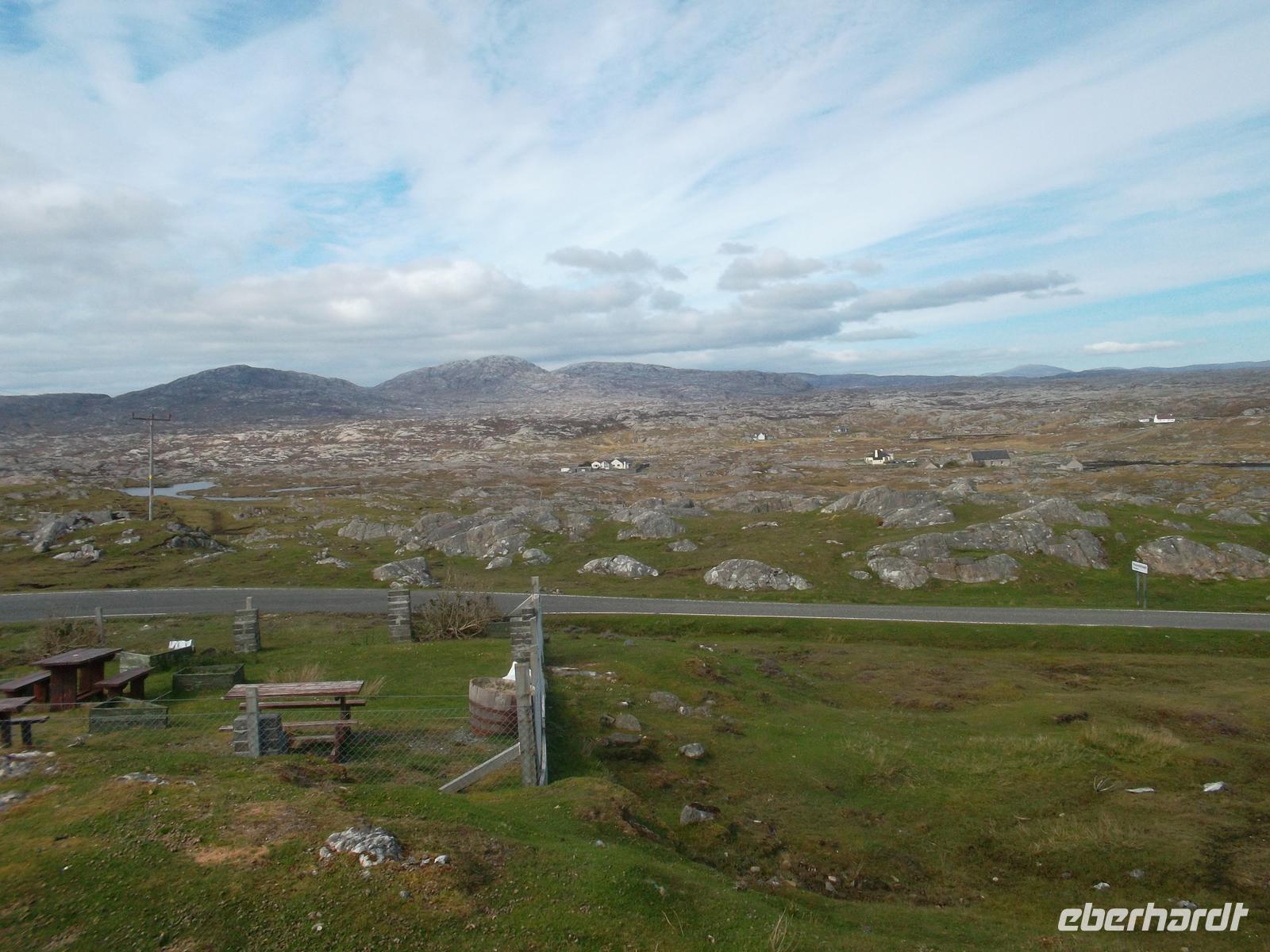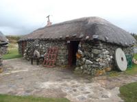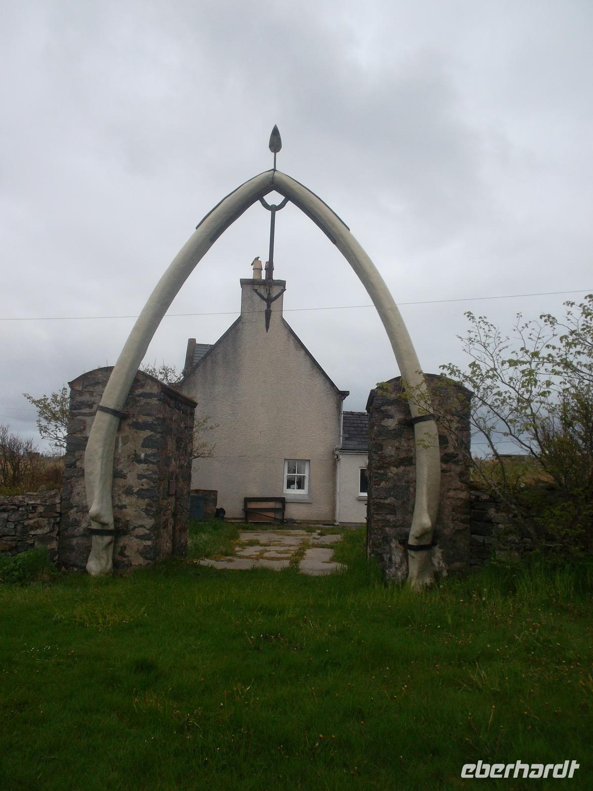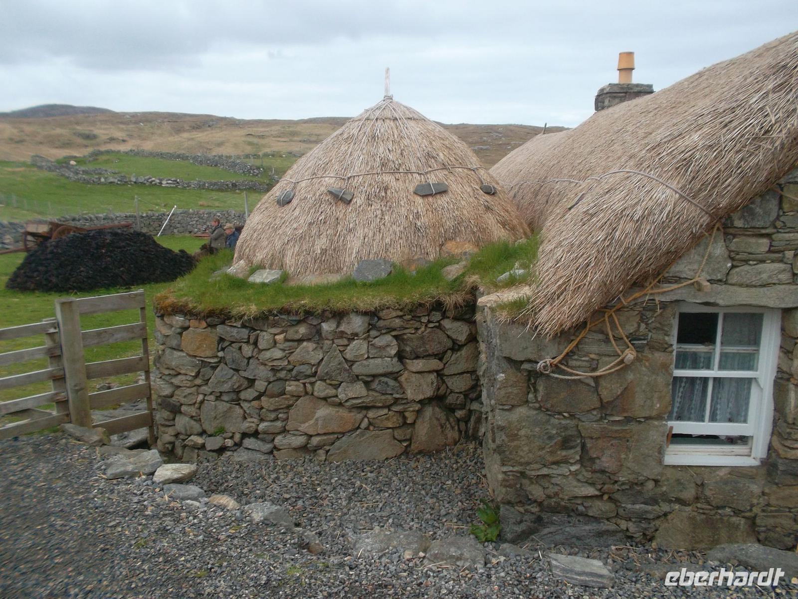 Die nördlichste und größte Insel der über 200 km langen äußeren Hebridenkette hat einiges zu bieten. Durch ein Gebirge statt durch Wasser sind die Inseln Lewis und Harris getrennt. ZUsammedn sind sie fast so groß wie das Großherzogtum Luxemburg und landschaftlich völlig unterschiedlich. Ihre Lage an der westlichen Außenkante Europas in oft extremer Witterung läßt sie weitgehend baumlos, windgepeitscht und karg erscheinen, wobei beide Inseln landschaftlich recht gegensätzlich sind: Lewis ist wesentlich größer als Harris und hat mit fast 20.000 Einwohnern etwa zehnmal soviel Einwohner wie die Nachbarinsel. Lewis ist relativ flach, von Torfmooren bedeckt und bekannt für Steinkreise, Menhire und andere Spuren prähistorischer Besiedlung. Hier wurden auch mittelalterliche und wikingische Reste gefunden, wie die berühmten geschnitzten Schachfiguren. Erst hielten wir an dem fotogenen Hauseingang aus den Unterkieferknochen eines Blauwals um sodann dem Black-House-Hebridendorf Gerannean einen Besuch abzustatten. Das alte Fischerdorf beherbergt heute self-catering Campinghäuser, untergebracht in (restaurierten) „Blackhouses" und liegt direkt am Ozean. Die wegen ihrer rußenden offenen Feuerstelle so genannten „schwarzen Häuser" repräsentieren auf den Hebriden und in Irland den traditionellen Haustyp, in dem Menschen und Tiere, durch eine Wand getrennt, zusammenlebten. Sie waren üblicherweise aus Trockensteinmauern, hatten hölzerne Dachbalken und eine Abdeckung aus Grassoden oder Schilfrohr, oft mit ausgedienten Fischernetzen und Steinbeschwerung gegen die heftigen Winde belegt.