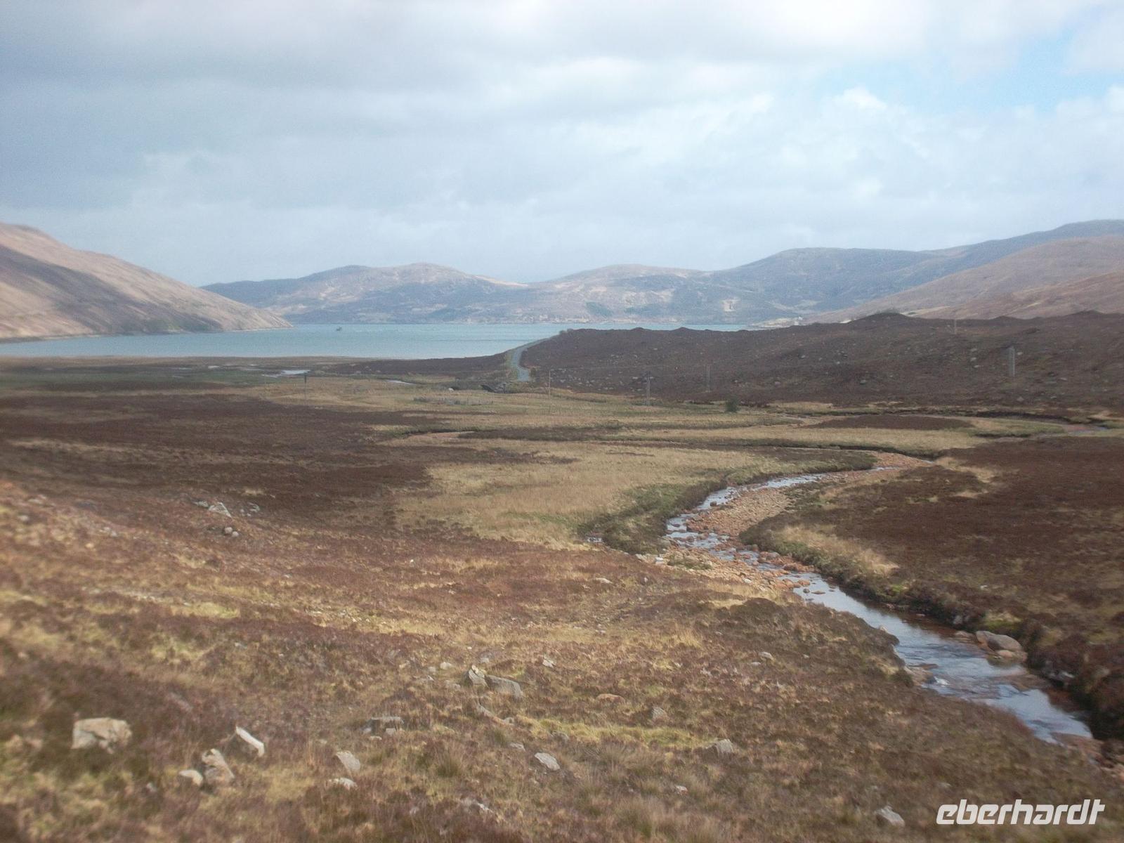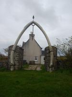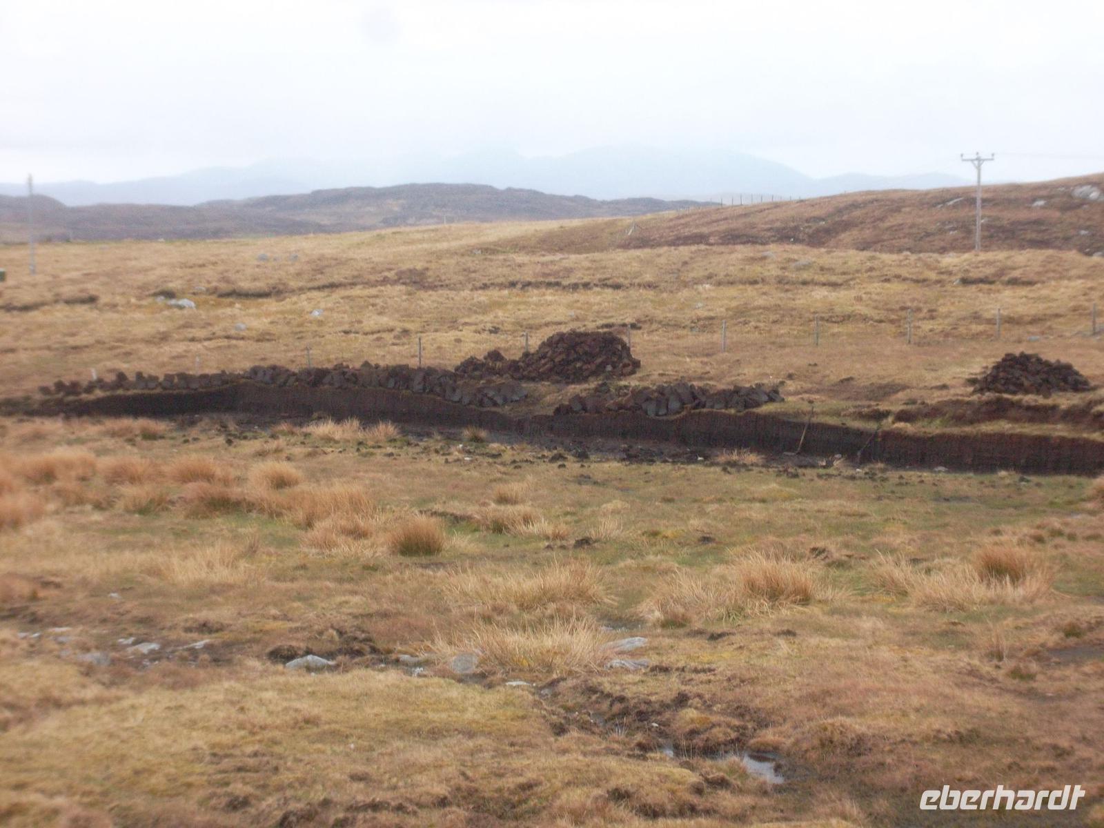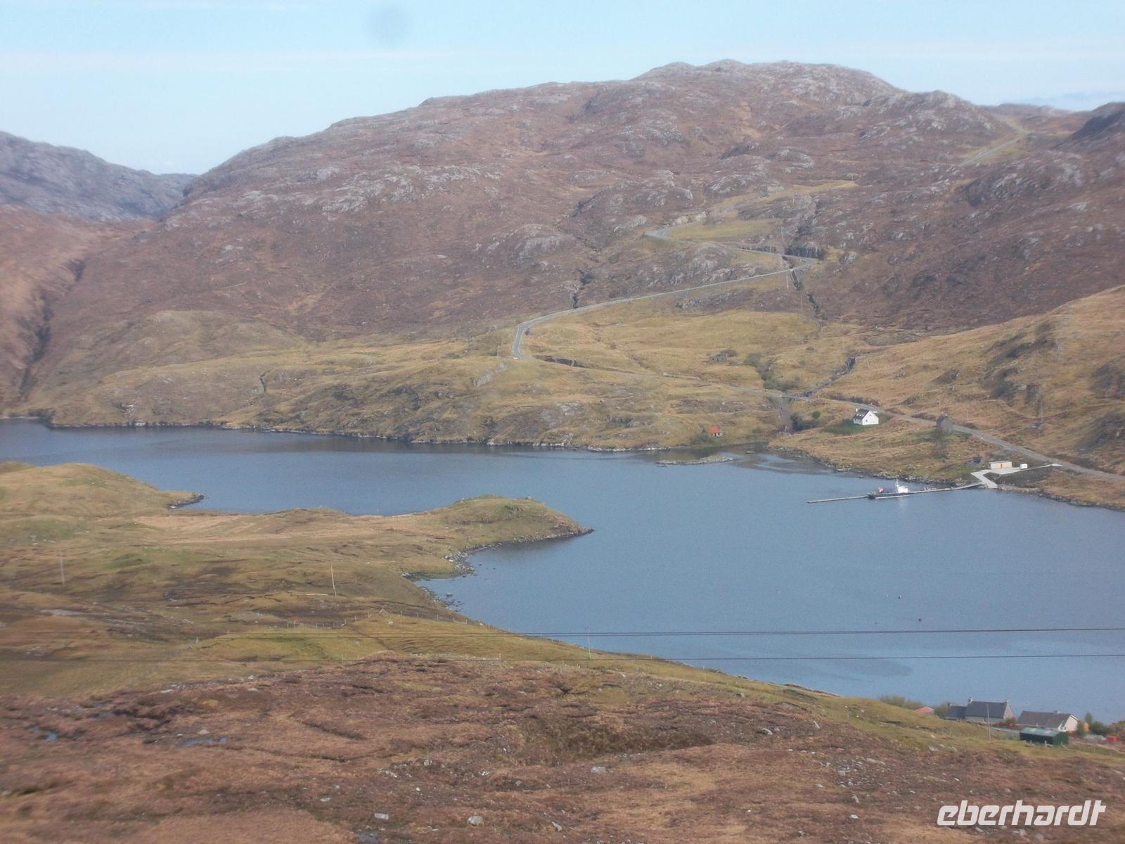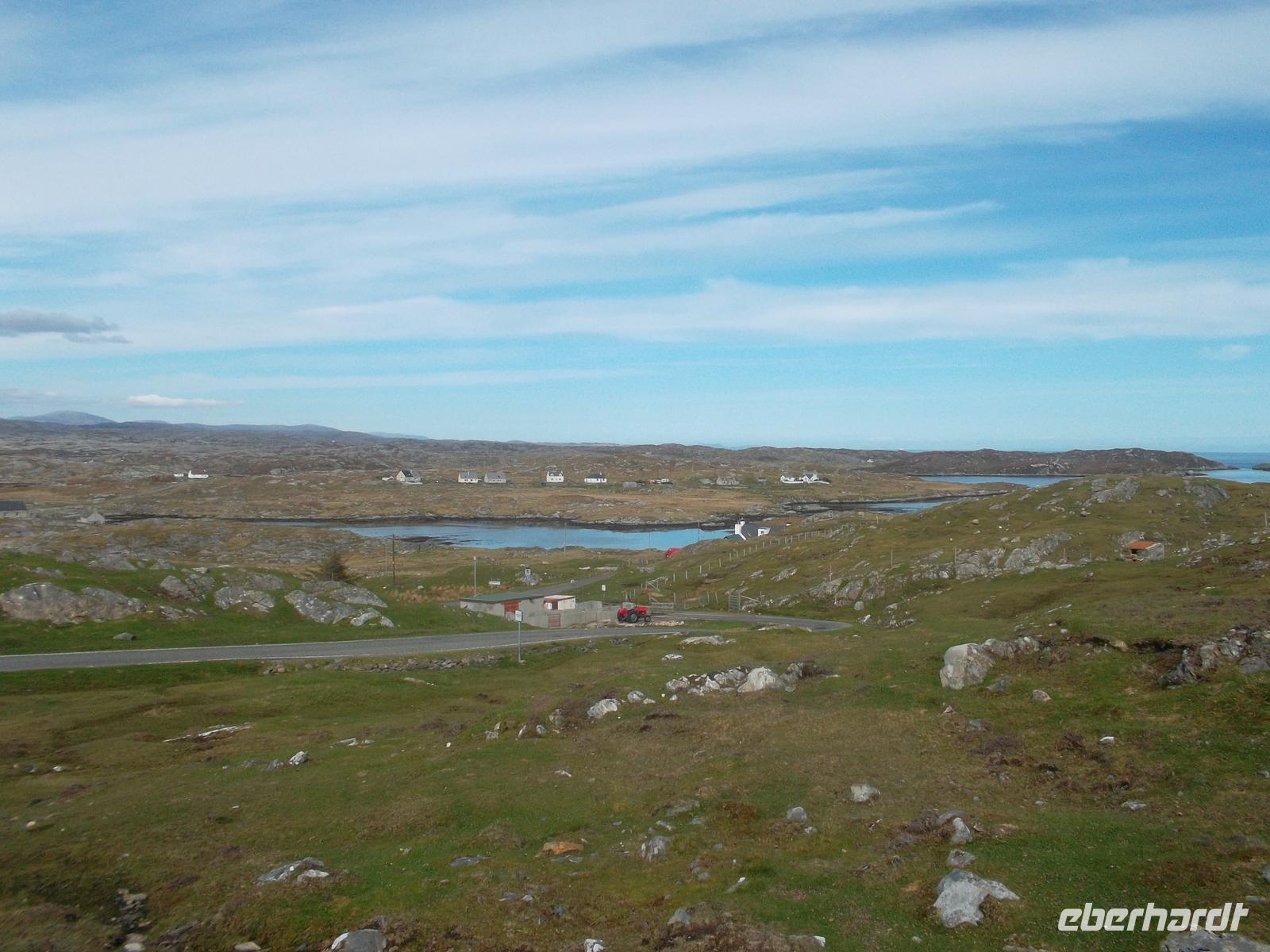 Die nördlichste und größte Insel der über 200 km langen äußeren Hebridenkette hat einiges zu bieten. Durch ein Gebirge statt durch Wasser sind die Inseln Lewis und Harris getrennt. ZUsammedn sind sie fast so groß wie das Großherzogtum Luxemburg und landschaftlich völlig unterschiedlich. Ihre Lage an der westlichen Außenkante Europas in oft extremer Witterung läßt sie weitgehend baumlos, windgepeitscht und karg erscheinen, wobei beide Inseln landschaftlich recht gegensätzlich sind: Lewis ist wesentlich größer als Harris und hat mit fast 20.000 Einwohnern etwa zehnmal soviel Einwohner wie die Nachbarinsel. Lewis ist relativ flach, von Torfmooren bedeckt und bekannt für Steinkreise, Menhire und andere Spuren prähistorischer Besiedlung. Hier wurden auch mittelalterliche und wikingische Reste gefunden, wie die berühmten geschnitzten Schachfiguren. Erst hielten wir an dem fotogenen Hauseingang aus den Unterkieferknochen eines Blauwals um sodann dem Black-House-Hebridendorf Gerannean einen Besuch abzustatten. Das alte Fischerdorf beherbergt heute self-catering Campinghäuser, untergebracht in (restaurierten) „Blackhouses" und liegt direkt am Ozean. Die wegen ihrer rußenden offenen Feuerstelle so genannten „schwarzen Häuser" repräsentieren auf den Hebriden und in Irland den traditionellen Haustyp, in dem Menschen und Tiere, durch eine Wand getrennt, zusammenlebten. Sie waren üblicherweise aus Trockensteinmauern, hatten hölzerne Dachbalken und eine Abdeckung aus Grassoden oder Schilfrohr, oft mit ausgedienten Fischernetzen und Steinbeschwerung gegen die heftigen Winde belegt.