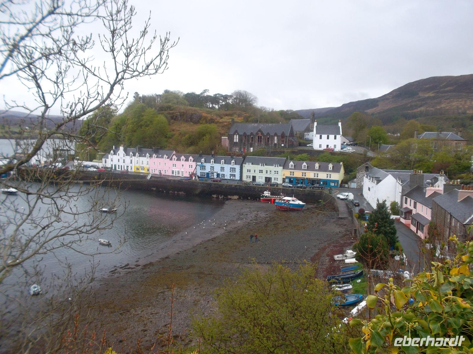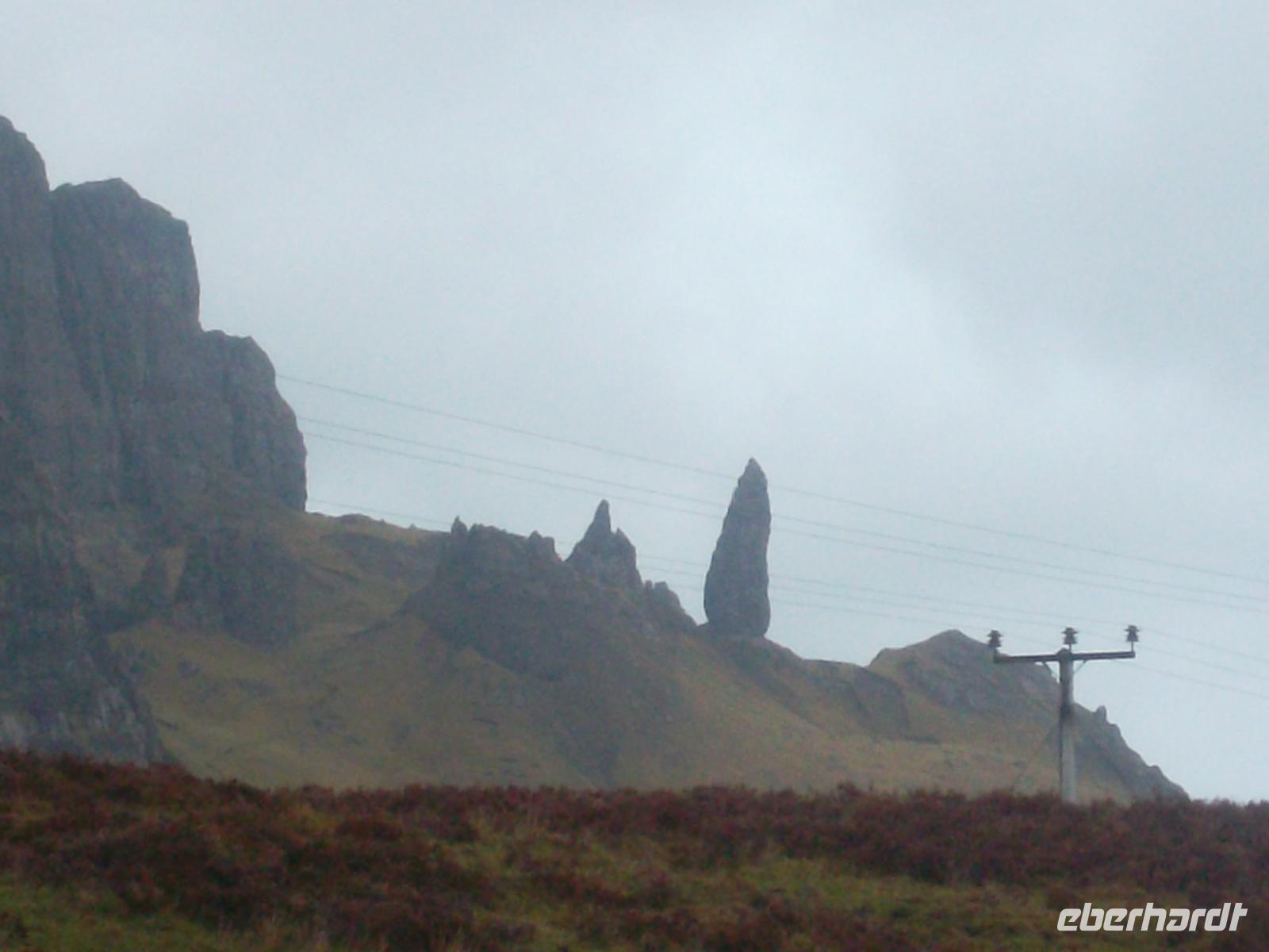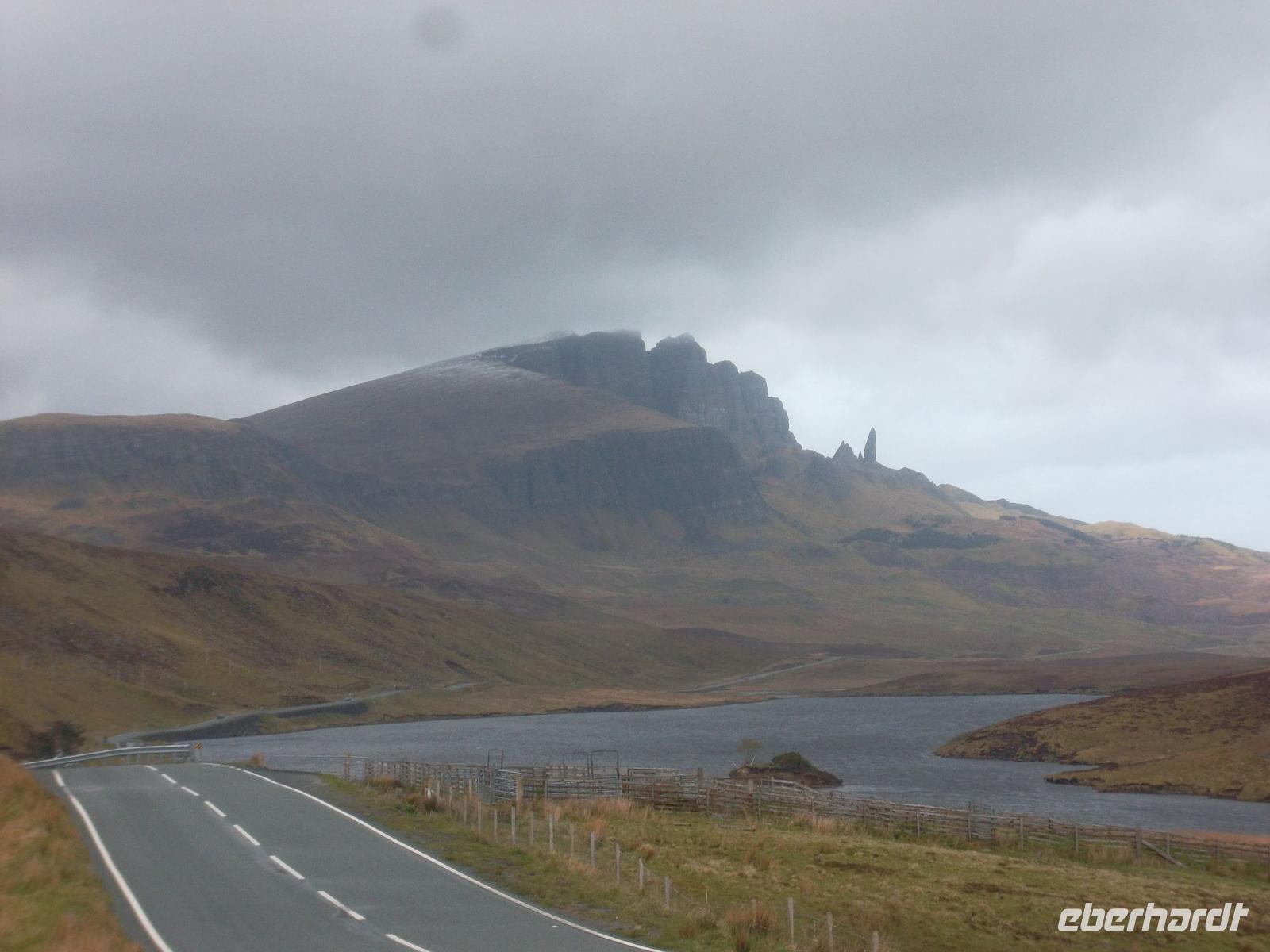 Heute schien uns das Wetter nicht wohlgesonnen zu sein. Nasskalt und regnerisch begrüßte uns der Tag, bei dem wir zunächst über die Betonbrücke vom „Festland" auf die Insel Skye und ins Inselinnere fuhren. Nach kurzem Stopp in Broadforderreichten wir bald die verregnete Inselhauptstadt Portree. Hier in der winzigen Hafenstadt mit buntbemalten Hausern rund um die Bucht versuchten wir, trotz der Witterung ein paar interessante Fotomotive zu finden. Neben dem kleinen historischen Marktkreuz und dem Aussichtspunkt über den Hafen bietet Portree nicht allzuviel - aber zum Schlendern, einer Einkehr ins Teehaus oder kleinem Souvenir-Shopping ist der Hauptort von Skye allemal gut. Die Weiterfahrt entlang dem Storr-Gebirge enthüllte trotz Regens zumindest den Anblick der berühmtesten Felsenformation von Skye: Die Felsnadel des „Old Man of Storr" ragt mit etwa fünfzig Metern Höhe schräg aus dem Mittelgebirge heraus. Neben dem Kilt Rock, einer weiteren Fels-Formation ist er das beliebteste Fotomotiv der Hebrideninsel.