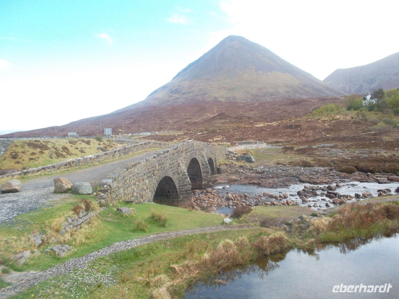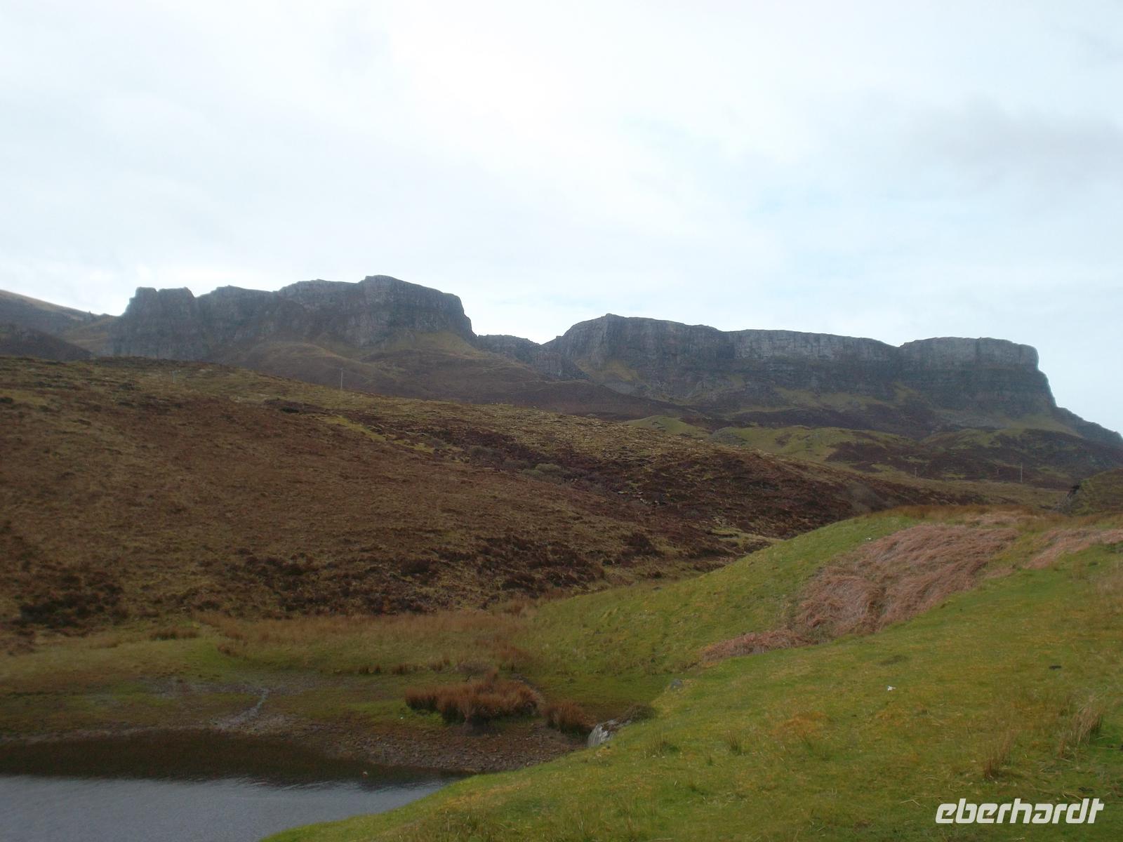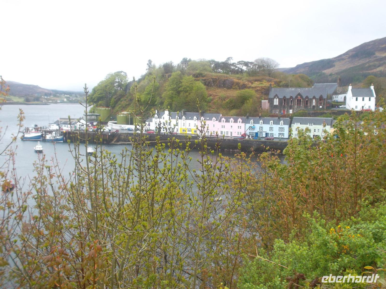 Heute schien uns das Wetter nicht wohlgesonnen zu sein. Nasskalt und regnerisch begrüßte uns der Tag, bei dem wir zunächst über die Betonbrücke vom „Festland" auf die Insel Skye und ins Inselinnere fuhren. Nach kurzem Stopp in Broadforderreichten wir bald die verregnete Inselhauptstadt Portree. Hier in der winzigen Hafenstadt mit buntbemalten Hausern rund um die Bucht versuchten wir, trotz der Witterung ein paar interessante Fotomotive zu finden. Neben dem kleinen historischen Marktkreuz und dem Aussichtspunkt über den Hafen bietet Portree nicht allzuviel - aber zum Schlendern, einer Einkehr ins Teehaus oder kleinem Souvenir-Shopping ist der Hauptort von Skye allemal gut. Die Weiterfahrt entlang dem Storr-Gebirge enthüllte trotz Regens zumindest den Anblick der berühmtesten Felsenformation von Skye: Die Felsnadel des „Old Man of Storr" ragt mit etwa fünfzig Metern Höhe schräg aus dem Mittelgebirge heraus. Neben dem Kilt Rock, einer weiteren Fels-Formation ist er das beliebteste Fotomotiv der Hebrideninsel.
