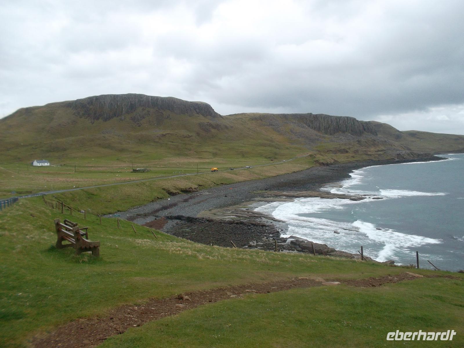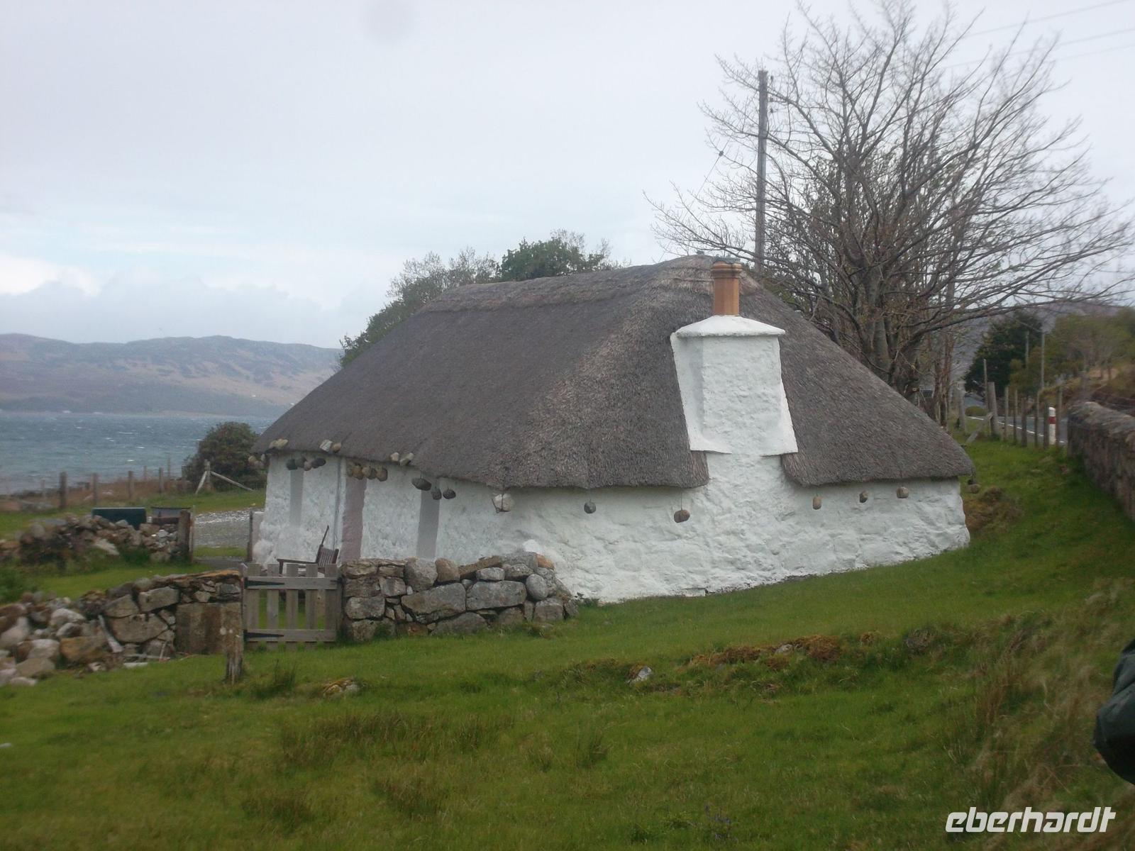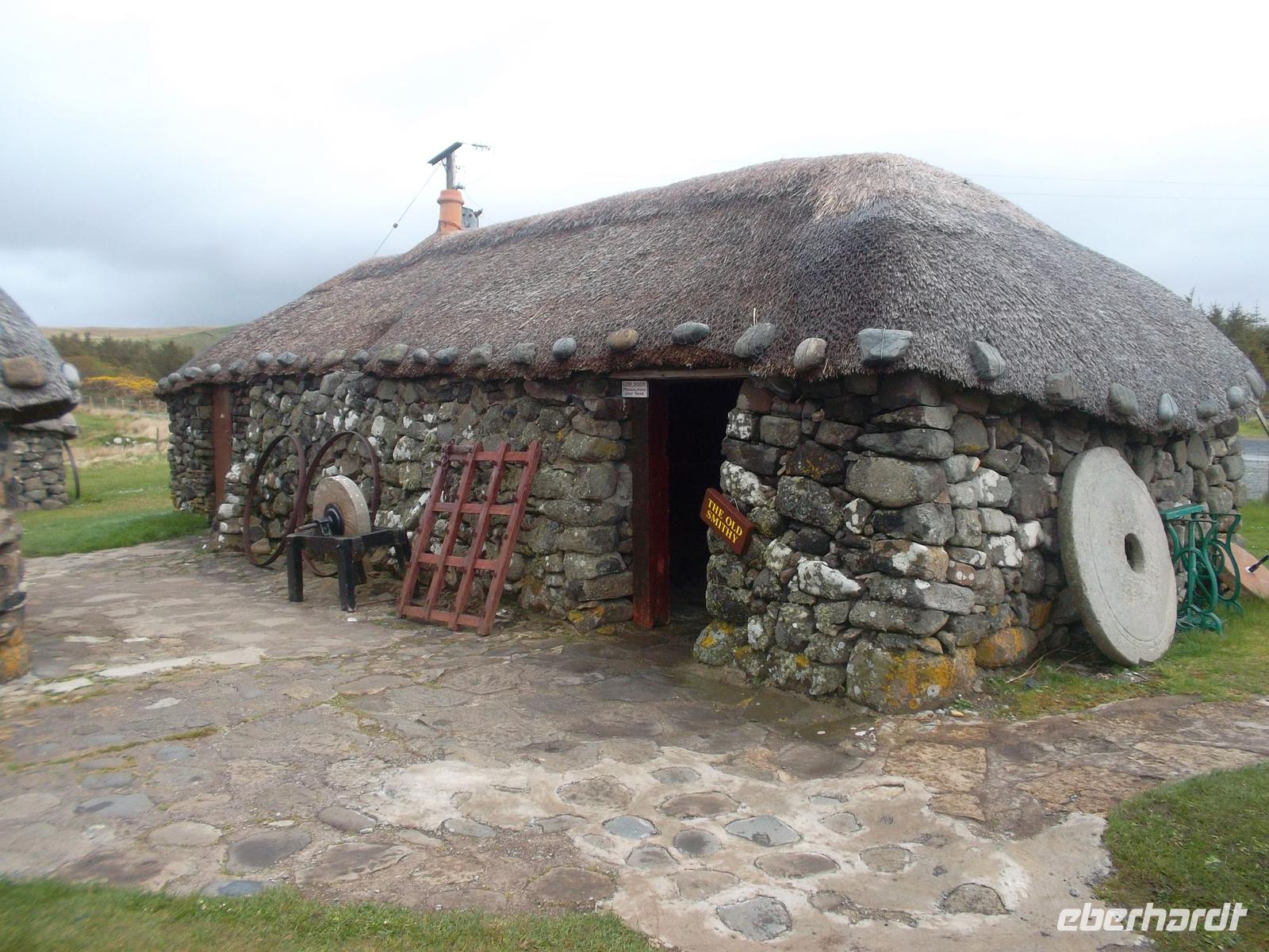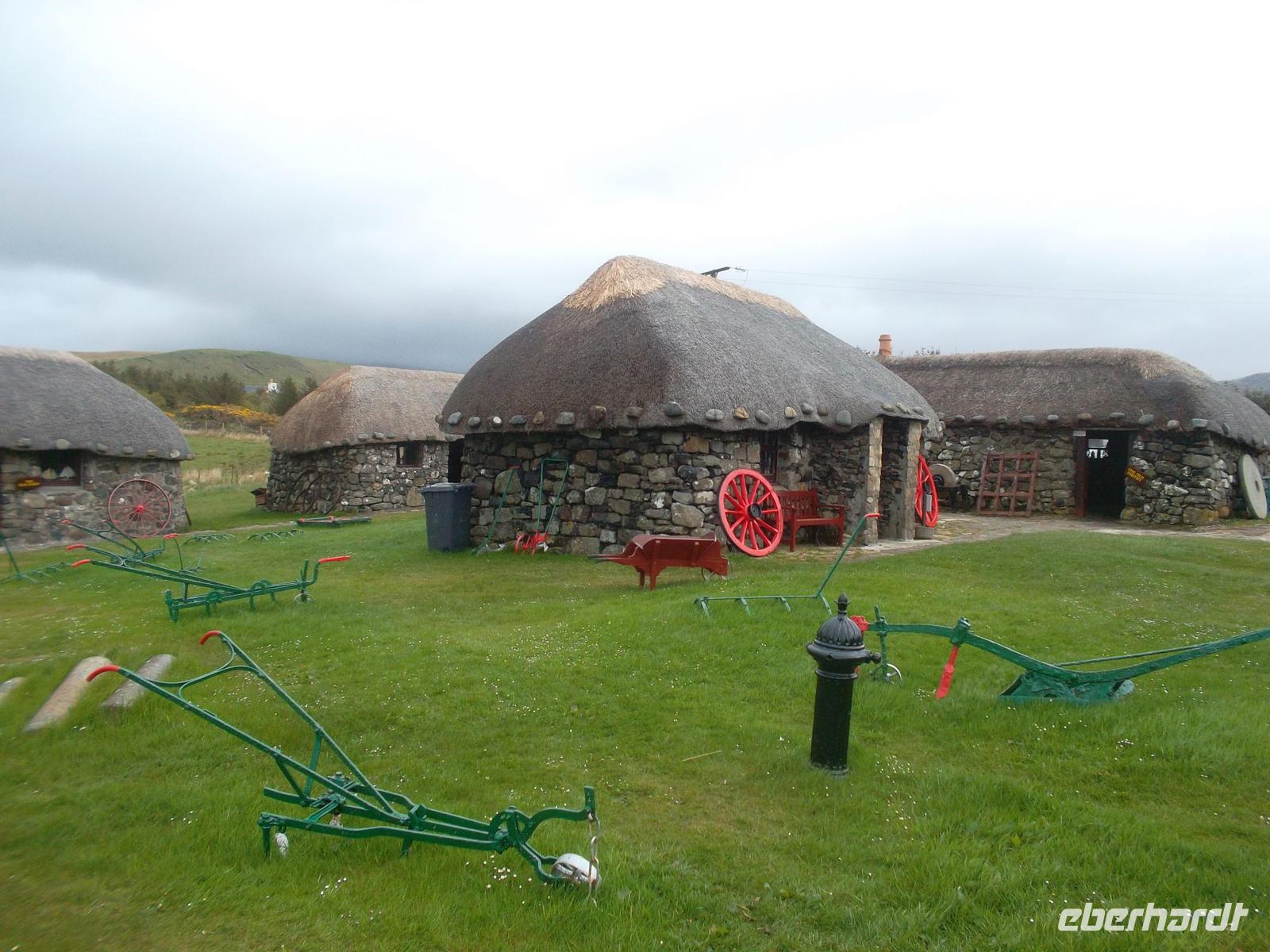 Anschließend stand die berühmteste Steilküsten-Formation auf dem Programm. Immer noch bei schlechtem Wetter standen wir am Aussichtspunkt zum Felsenmassiv „Kilt-Rock" und dem malerisch in seiner Nähe ins Meer stürzenden Wasserfall. Das mehrere hundert Meter hohe Felsengebilde ist die neben dem „Old man of Storr" vielleicht bekannteste Sehenswürdigkeit der Halbinsel Trotternish, die vor Millionen on Jahren durch einstmals dünnflüssige und erkaltete Lava der hier tätigen Vulkane geformt wurde. Bei der Weiterfahrt durch die herrliche Landschaft Trotternishs und nach einem Stopp nahe dem historischen Duntulm Castle erreichten wir das „Isle of Skye Museum", ein Freilichtmuseum aus traditionellen „Black Houses" und einer Ausstellung zur Tradition und Lebensweise der Hebriden. Wer wollte, konnte von hier aus noch eine Wanderung zum Grab der schottischen Nationalheldin Flora McDonald unternehmen. Bis heute verehren sie die Highlander dafür, dass sie einst dem vor seinen Verfolgern fliehenden „bonnie Prince Charlie" das Leben rettete. Mit ihrer Hilfe gelang dem Jakobitenführer nach der verlorenen Schlacht von Culloden die Flucht ins französische Exil.