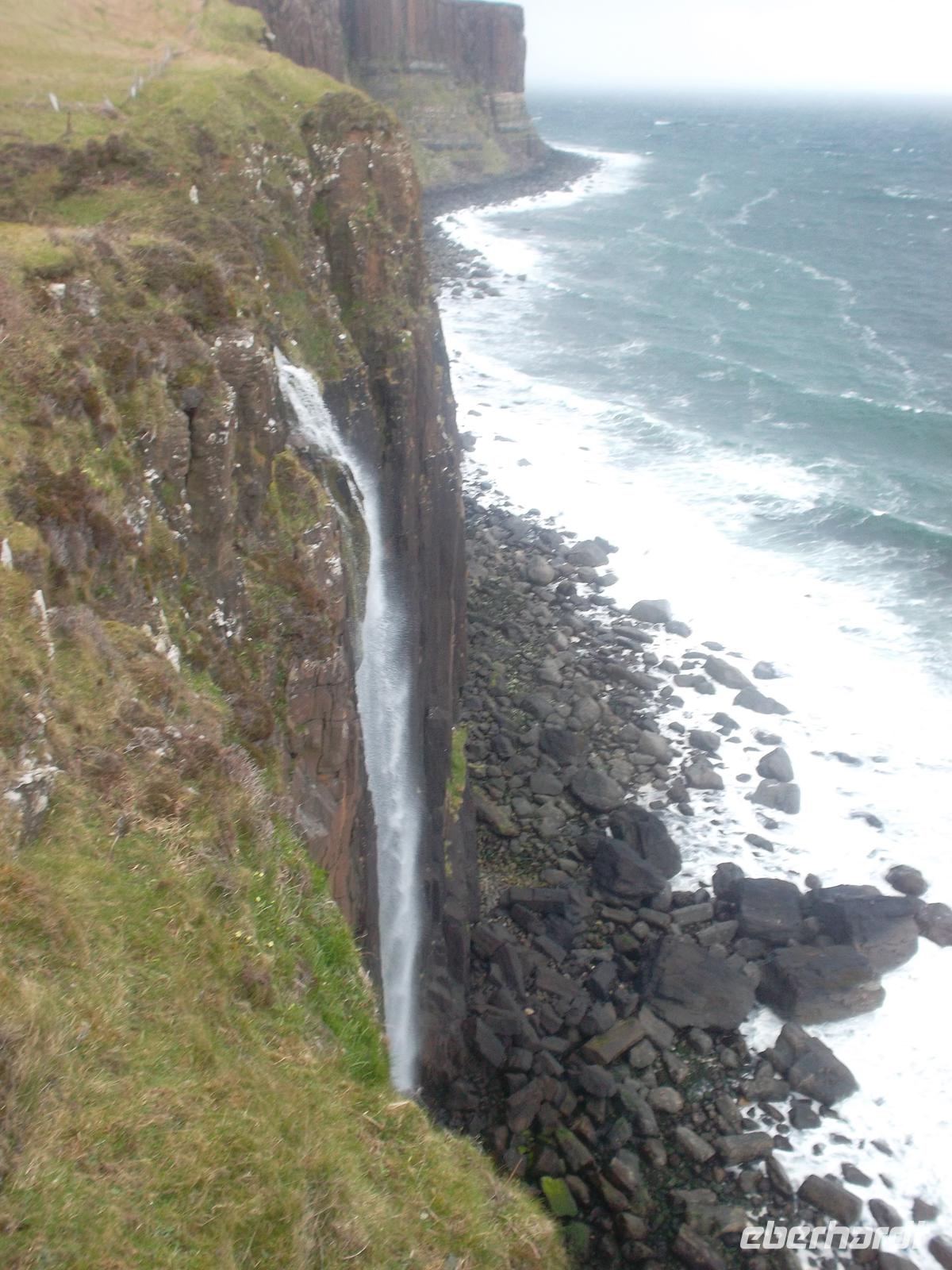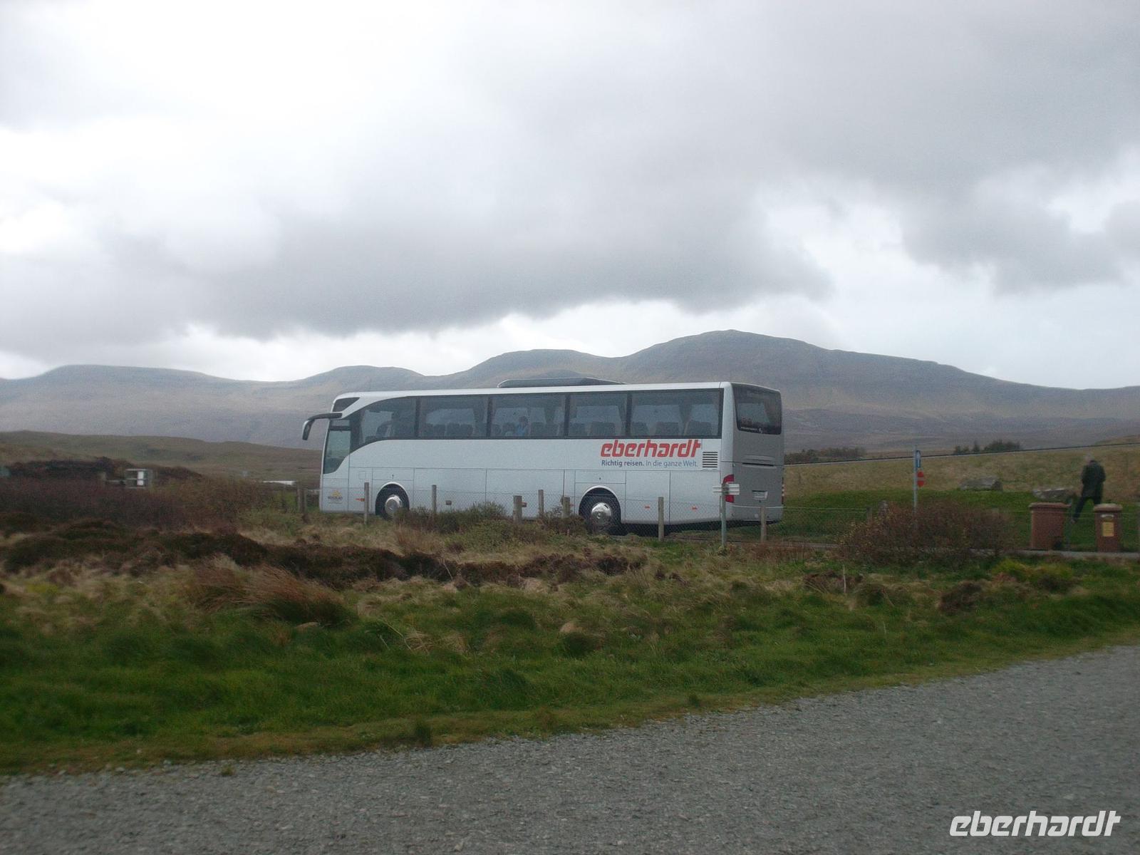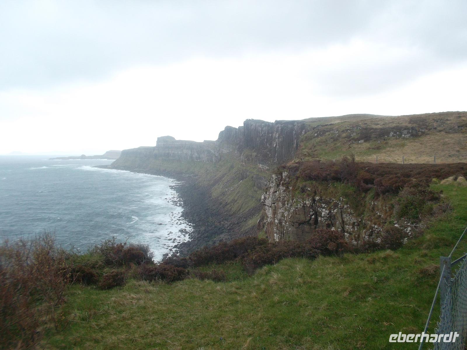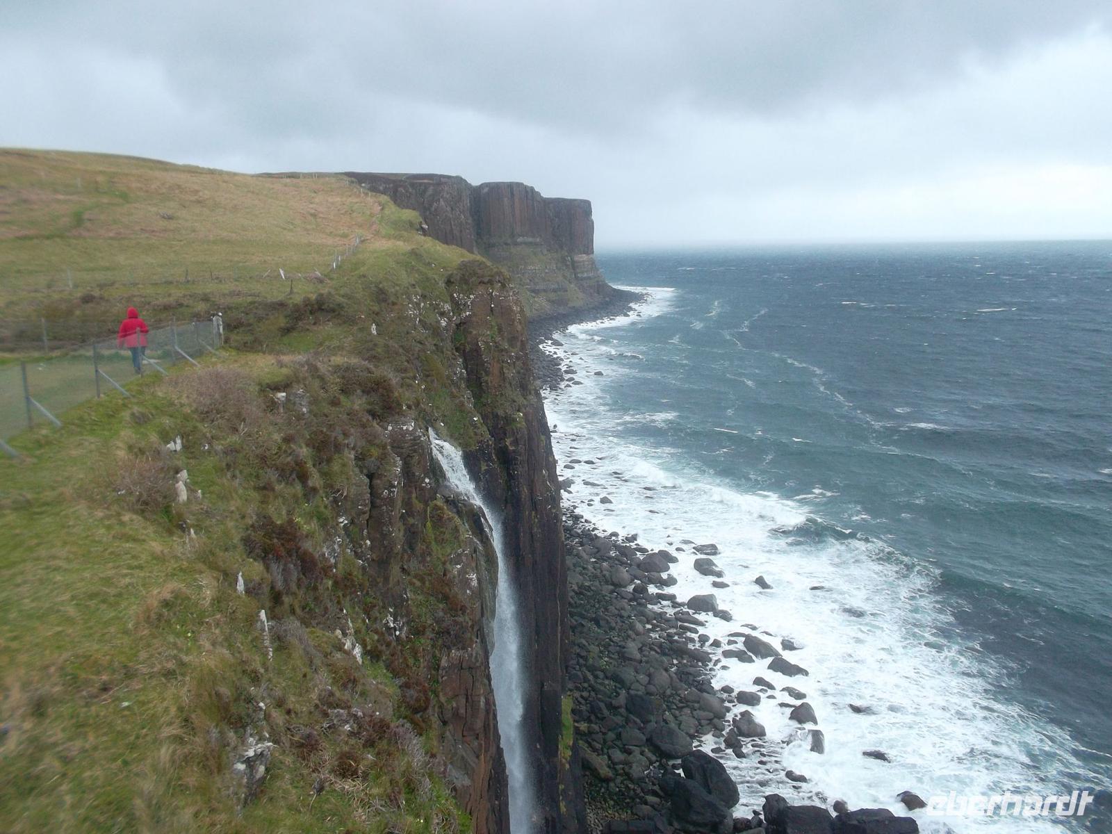 An der Steilküste von Skye war eigentlich eine kleine Klippenwanderung an den „Lealt Falls" mit Wanderweg zur pittoresken Klippenszenerie vorgesehen, aber das unwirtliche Wetter brachte die meisten Gäste rasch wieder zurück in den Bus und zu unserem Bordservice.