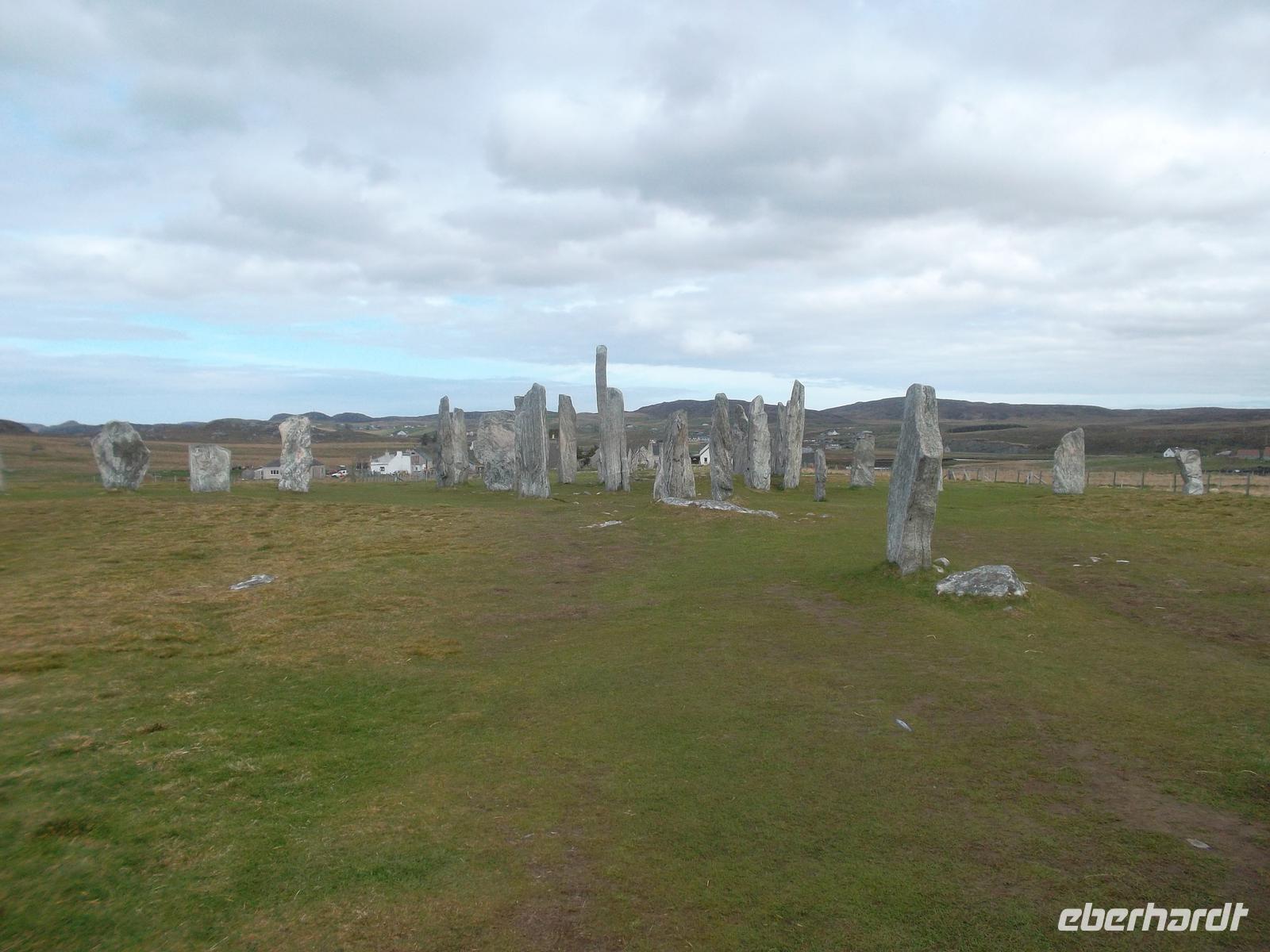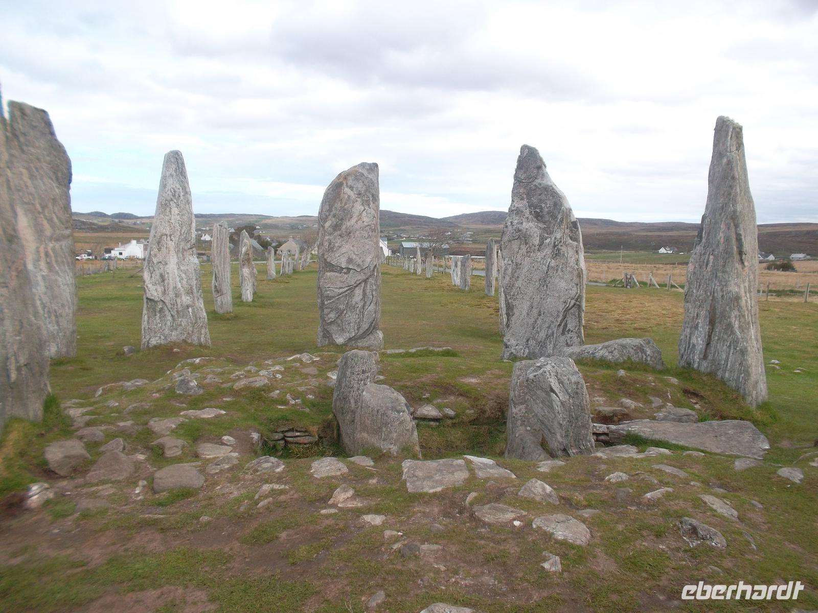 Immer ein Höhepunkt jeder Lewis-Rundfahrt ist der Besuch der legendären „Standing Stones of Callanish". Die gewaltiger Steinsetzung ist die größte Schottlands und wird oft auch als „Stonehenge Schottlands" bezeichnet. Ihre Anordnung ist die kreuzförmig mit einem das innere Kreuz umfassenden Steinkreis und einem in der Mitte liegenden Dolmen - insgesamt eine der besterhaltenen Megalithanlagen insgesamt. Exakt nach den Himmelsrichtungen ausgerichtet gibt der Großsteinbau der Wissenschaft bis heute Rätsel auf, denn S´seine Funktionen könnten sich von der Begräbnisstätte bis hin zum Kalender und zur Berechnung von Mondbewegungen erstrecken. Voller Mystik präsentierte sich uns das unvergängliche Denkmal aus der Steinzeit mit der Vielfalt und Ordnung seiner tonnenschweren Steine.