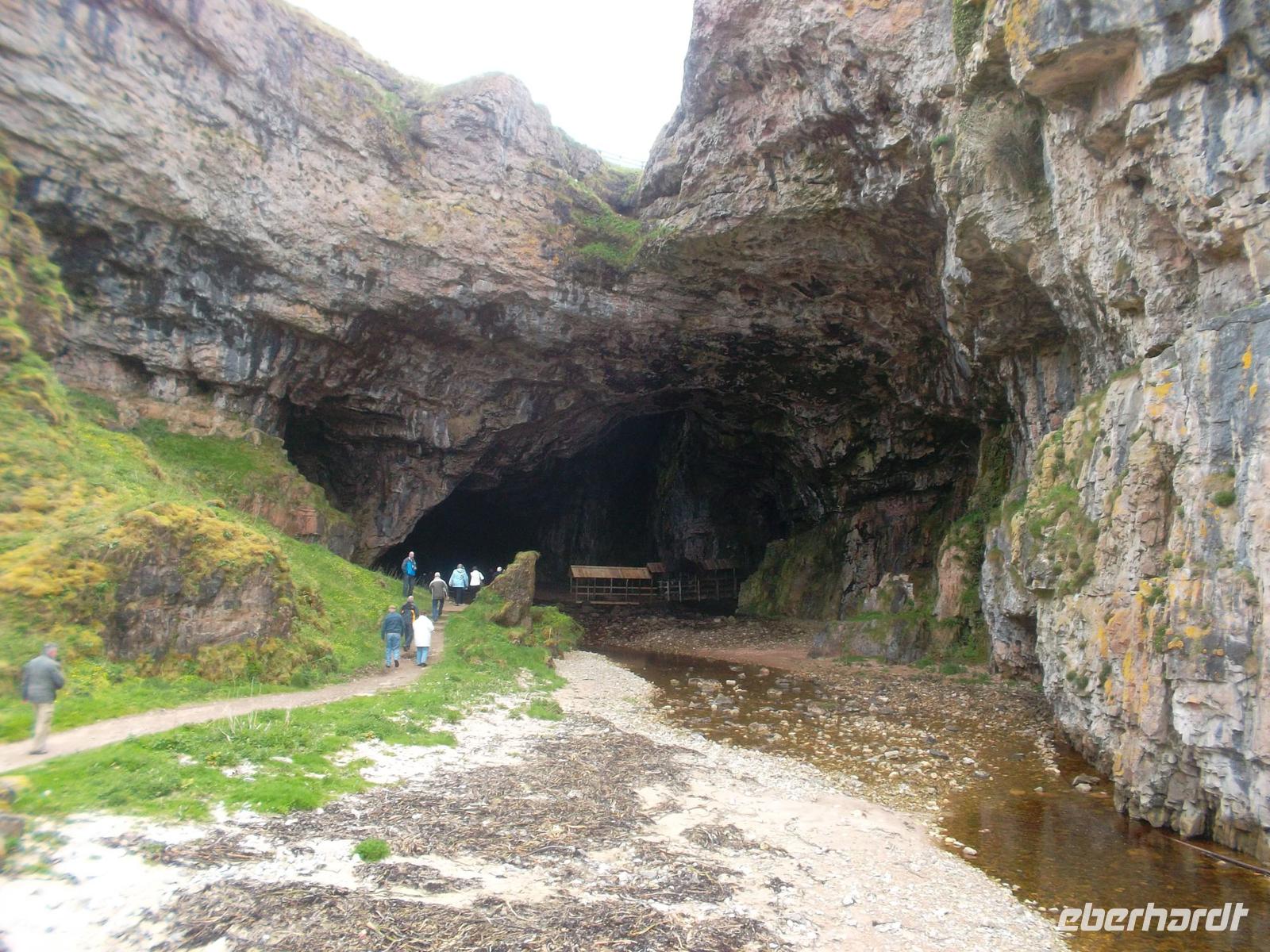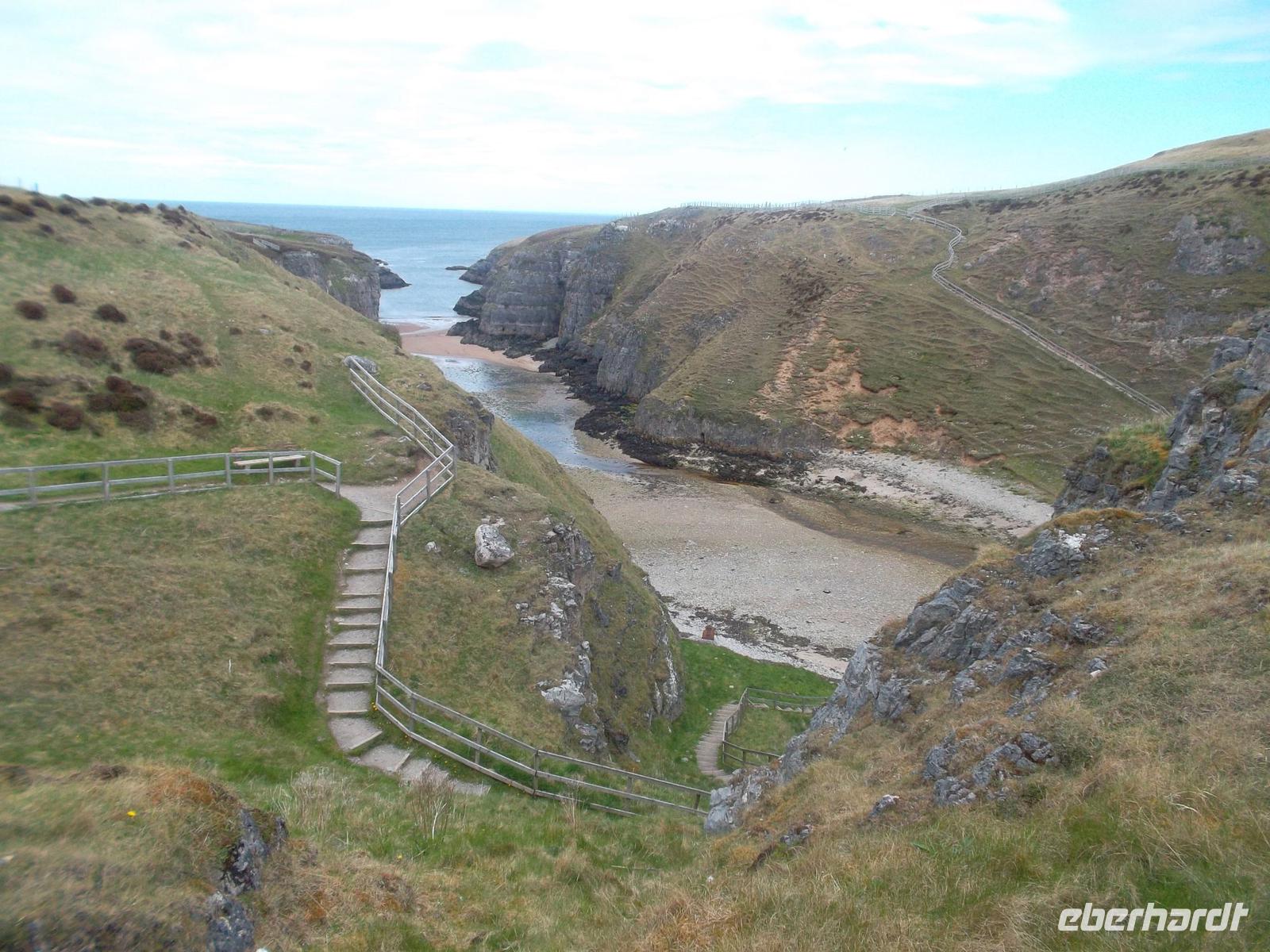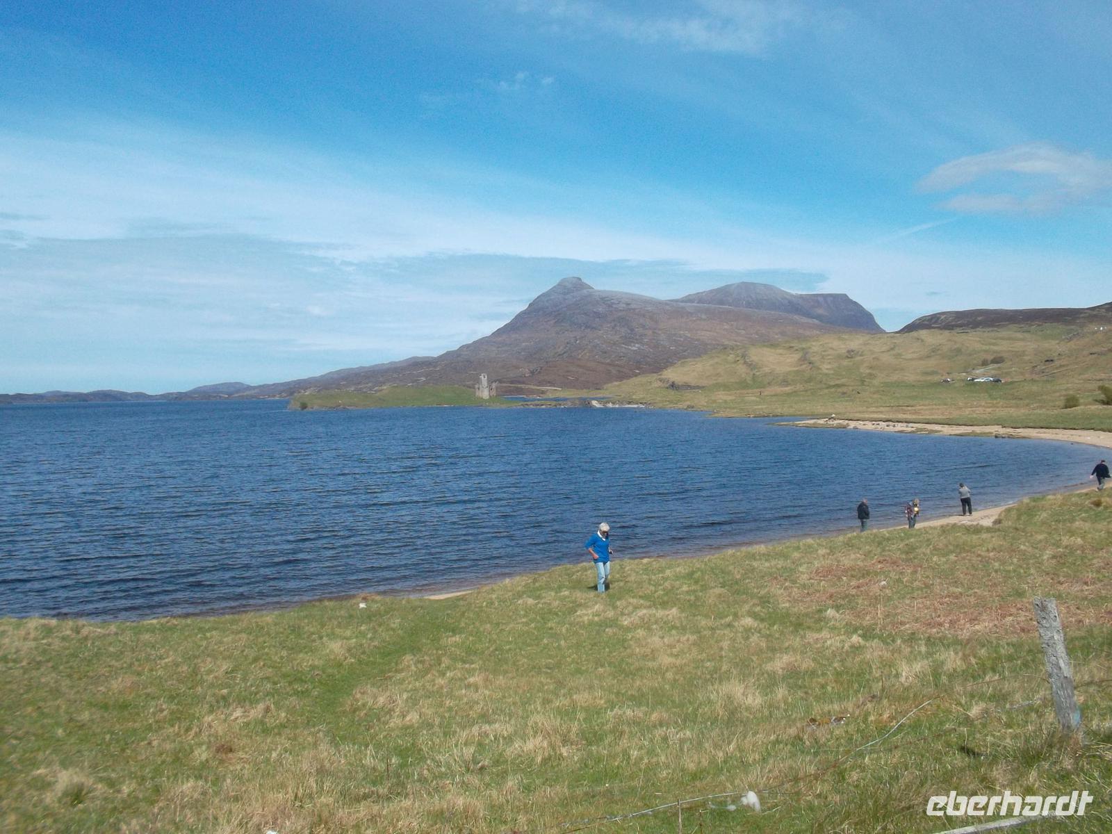 Heute gab es das Frühstück ausnahmsweise mal nicht im Hotel sondern an Bord der Fähre, die sehr früh zum „Festland" ablegte. Pünktlich erreichten wir dieses in Ullapool bei wieder herrlichem Wetter. Unser Weg heute führte durch die nordwestlichen und nördlichen Highlands bis ganz hinauf zum nördlichsten Punkt der britischen Hauptinsel, den ganzen Tag durch Schönheiten der Natur. Die Ruine des Ardvreck Castle und das U-Boot-Denkmal an der Brücke von Kylescu veranlassten uns natürlich zu Fotostopps, bevor wir mittags die Kirchenruine und den Strand von Balnakeil erreichten. Das Kirchlein war früher ein Zentrum der Christianisierung. Auf dem hiesigen Parkplatz gab es heute den Bordservice zu Mittag und dann ging es zu der inzwischen sehr gut ausgebauten Smoo -Cave weiter. Das Höhlensystem hatte der griechische Geschichtsschreiber Herodot einst als „Eingang zur Unterwelt" apostrophiert. Die Höhle mit mehreren Kammern birgt, von schroffen Uferfelsen umgeben, als ihr Geheimnis einen Wasserfall, der durch das Höhlendach in der Kammer heruntertost und seinen Weg zum Meer findet. Auf der weiteren Strecke mit grandiosen Ausblicken aufs Meer und fjordähnlichen Buchten erreichten wir schließlich nach mehreren Fotostopps wir das Städtchen Thurso, die größte Stadt im Norden Schottlands und checkten ins gemütliche St Clair-Hotel ein.