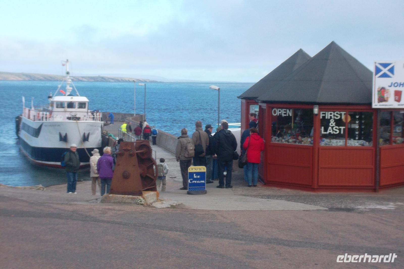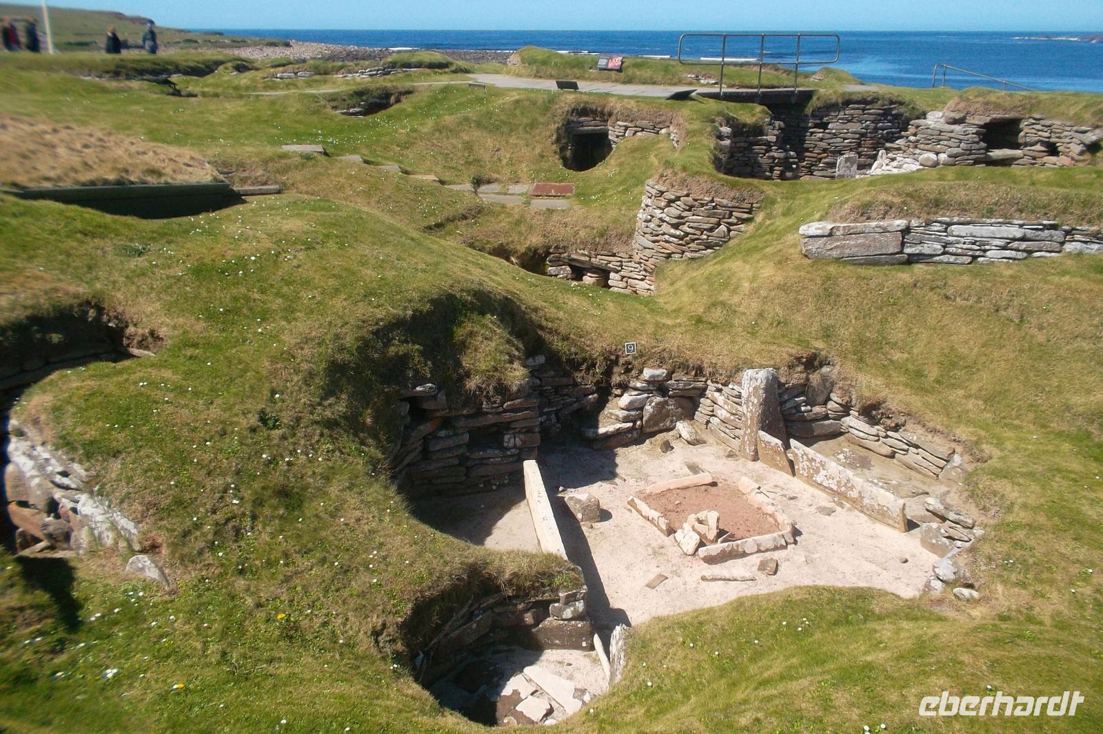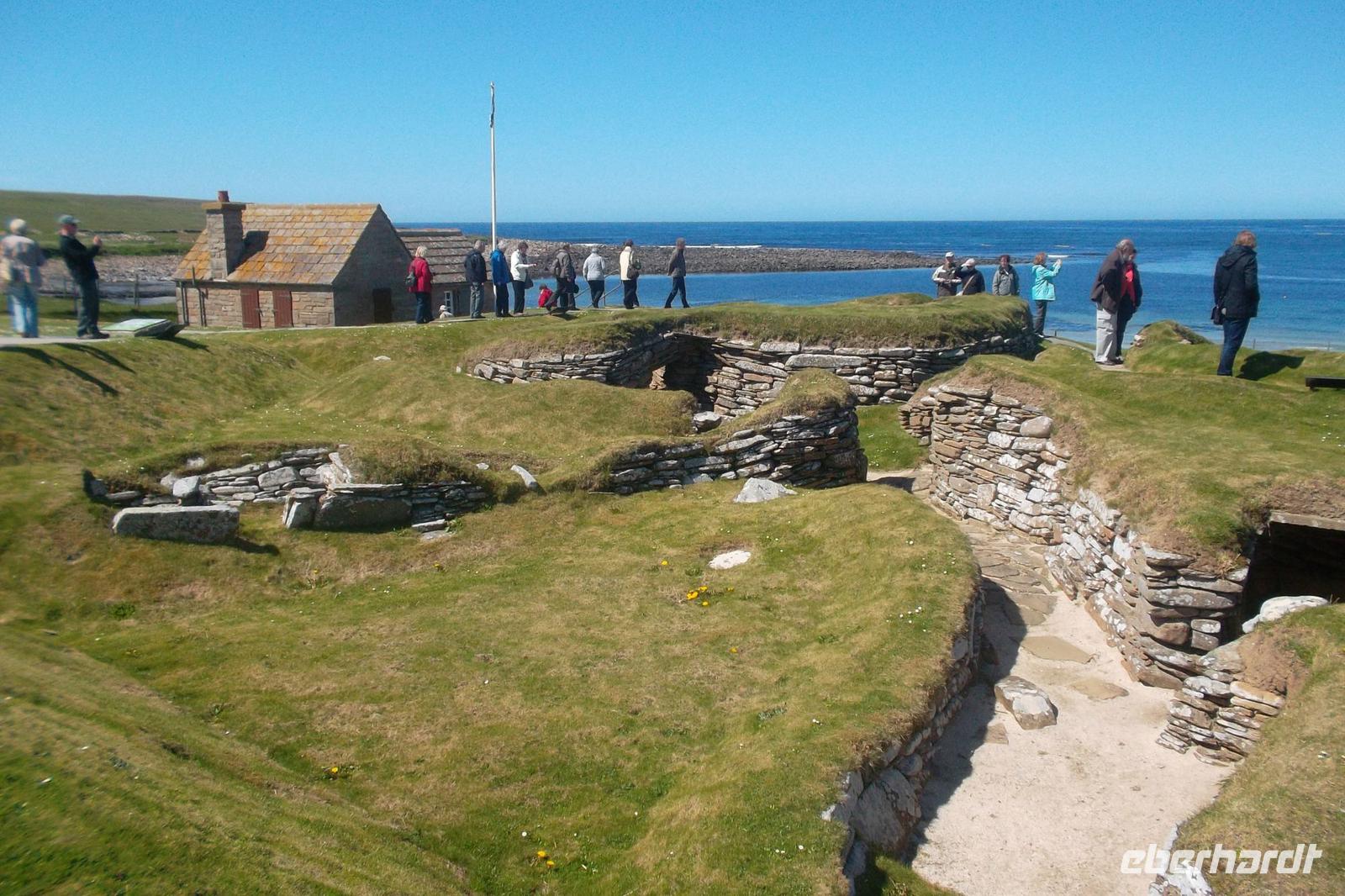 Die Mittagspause verbrachten wir in der zweitgrößten Stadt der Orkneys, in bevor es zum großen Tageshöhepunkt weiter ging, der Besichtigung des Steinzeitdorfes Scara Brae. Es gehört zu den ältesten menschlichen Siedlungen in Europa und zeigt in einer Art gut konservierter Ausgrabung die Lebensweise der Bewohner in der Steinzeit. Mit einem Alter von sechstausend Jahren ist die Siedlung über 1000 Jahre älter als die ägyptischen Pyramiden. Auch der Besuch des benachbarten Herrensitzes „Scull House"ist Lohnenswert.