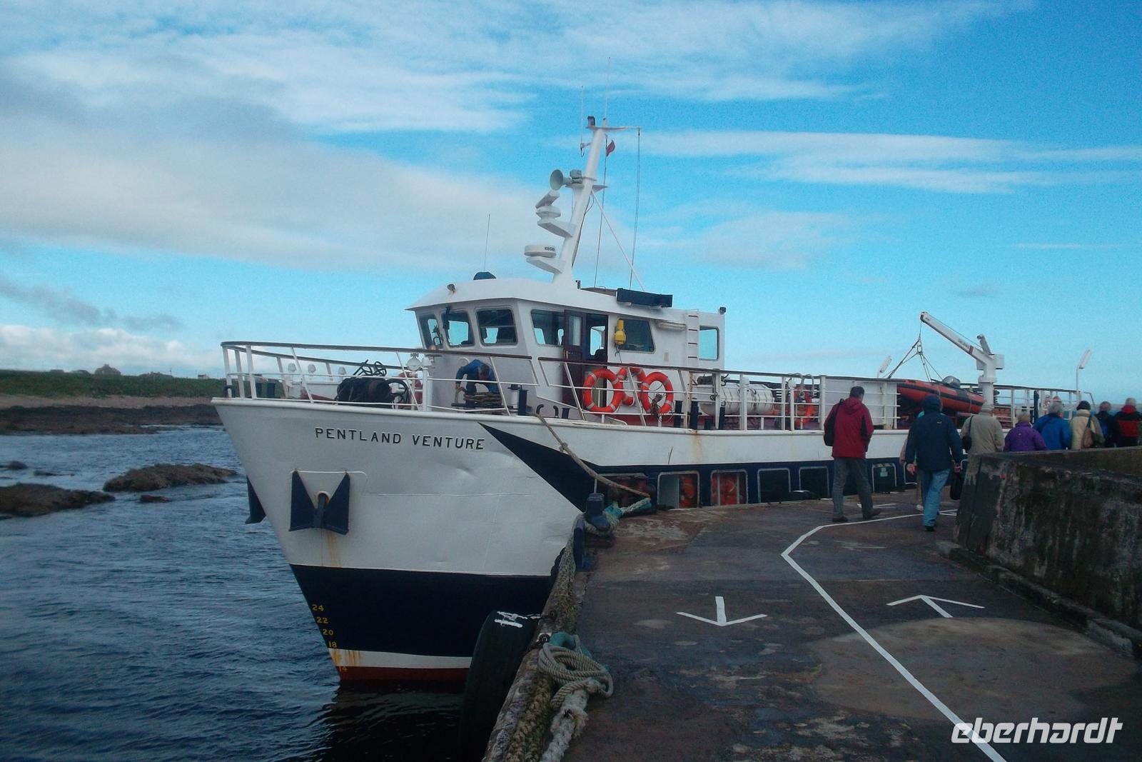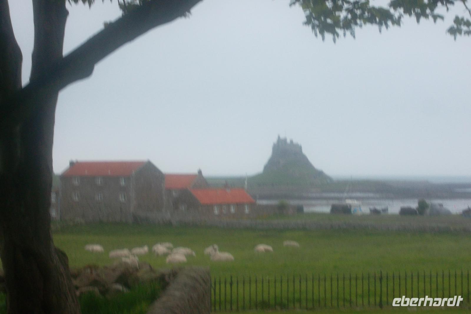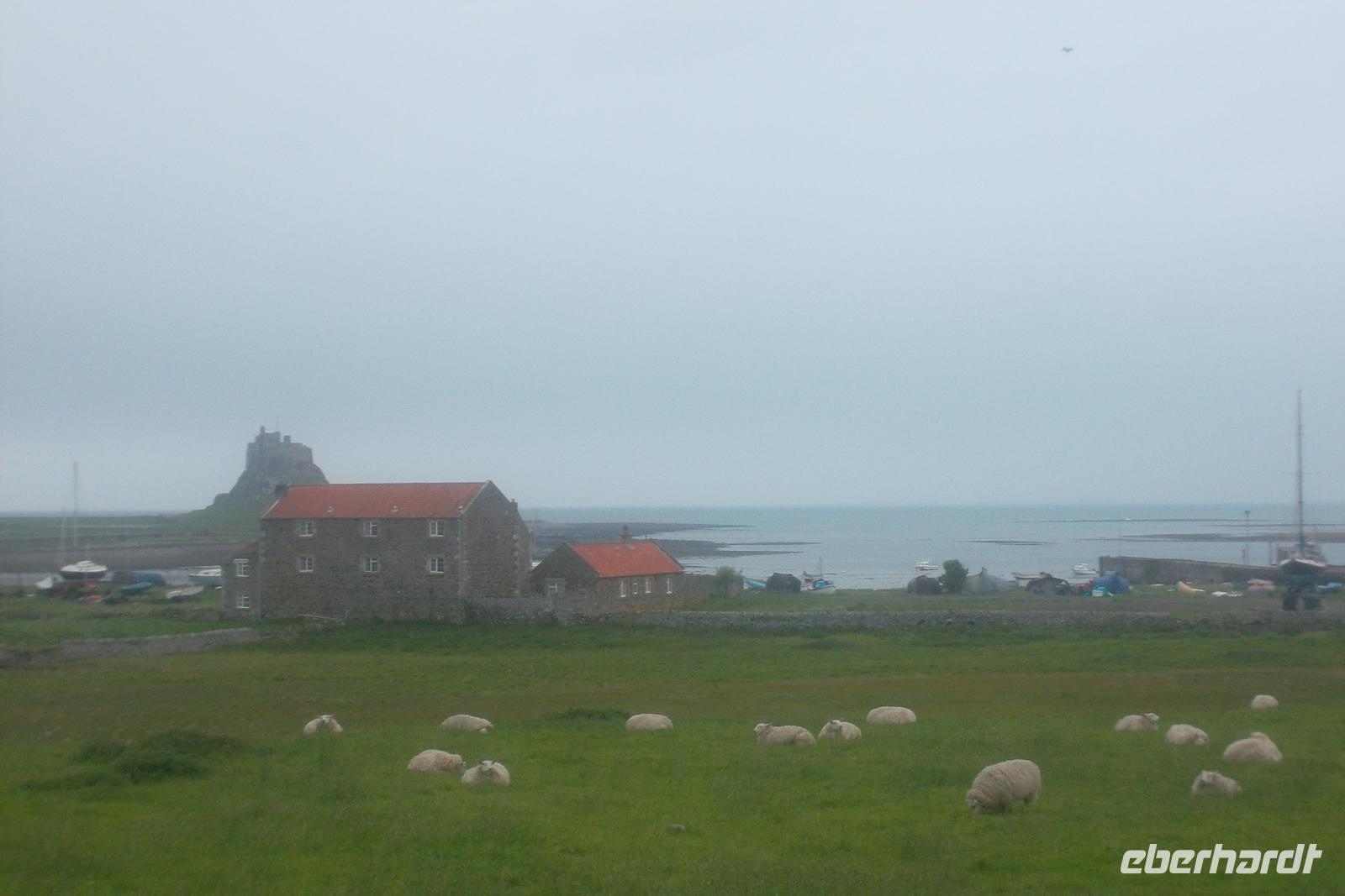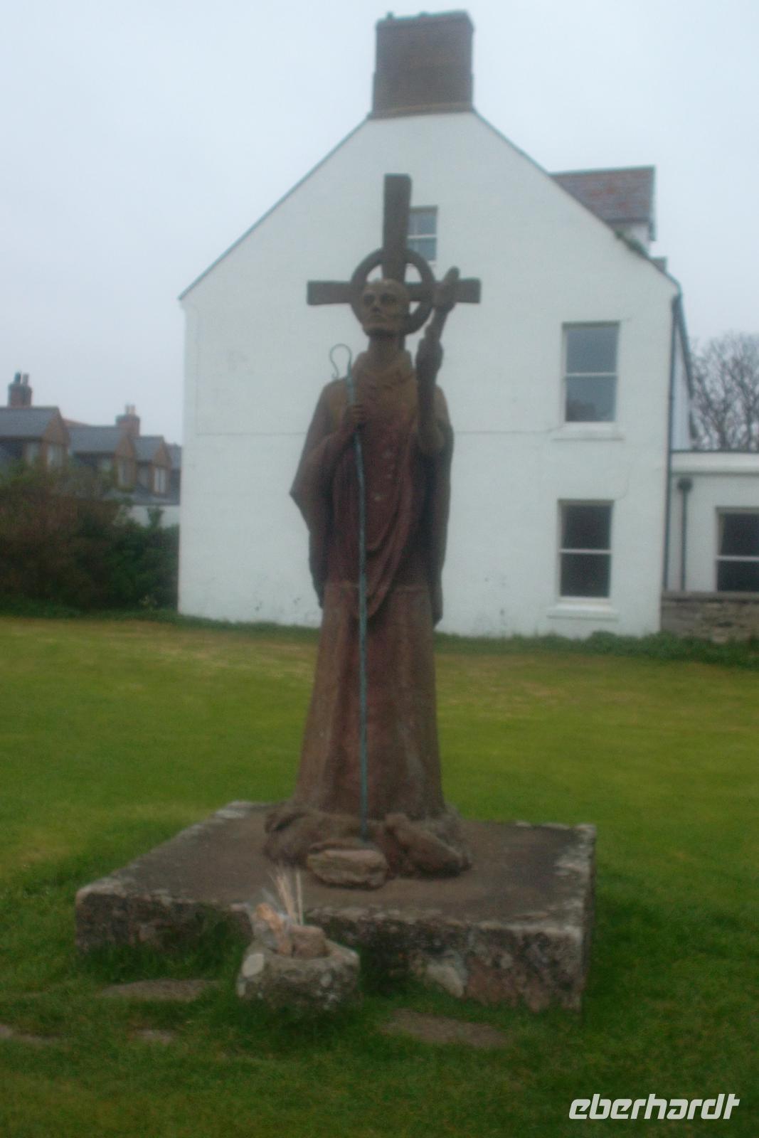 Am Vortag hatte ich mit dem Touristenbüro in Berwick-upon-Tweed an der schottisch-englischen Grenze telefoniert und mich über die aktuellen Zeiten von Ebbe und Flut aufklären lassen. Damit wusste ich, dass es am nächsten Tag - also heute - möglich sein würde, einen besonderen Leckerbissen anzubieten: nahe der Grenze am Ufer der Nordsee liegt „Holy Island", eine nur bei Ebbe zu erreichende Insel. Hier hatte im 7. Jahrhundert der heiliggesprochene irische Mönch St. Aidan ein Kloster errichtet - die Abtei Lindisfarne, die zum Ausgangspunkt der Christianisierung Englands wurde. Sie war 793 urkundlich nachweisbar Opfer eines Wikingerüberfalls, was bis heute als „Beginn der Wikingerzeit" angesehen wird. Eindrucksvolle Reste der Abtei und ein e Statue des Heiligen Aidan sind dort ebenso zu bewundern wie eine alte Festung. Knapp zwei Stunden hielten wir uns auf der Gezeiteninsel auf, deren Zufahrtsdamm klar die Spuren von Ebbe und Flut zeigt. Auf dem Weg zum Einchecken auf der Fähre war dann sogar noch Zeit für einen Abstecher in das nordenglische Städtchen Alnwick um hier vielleicht noch die letzten Pfunde auszugeben. Dann gab es einen zügigen und freundlichen Check in auf die Fähre, die wir gegen 16.00 Uhr betraten und dann bei Ausfahrt um 17.00 Uhr Ortszeit wieder ein tolles Schlemmer-Abendessen - mindestens genauso gut wie auf der Hinfahrt.