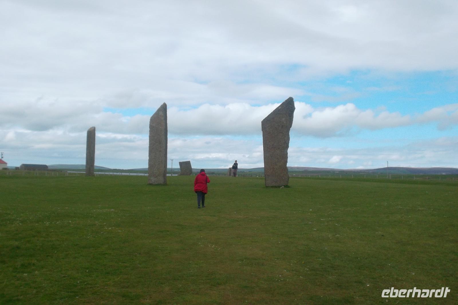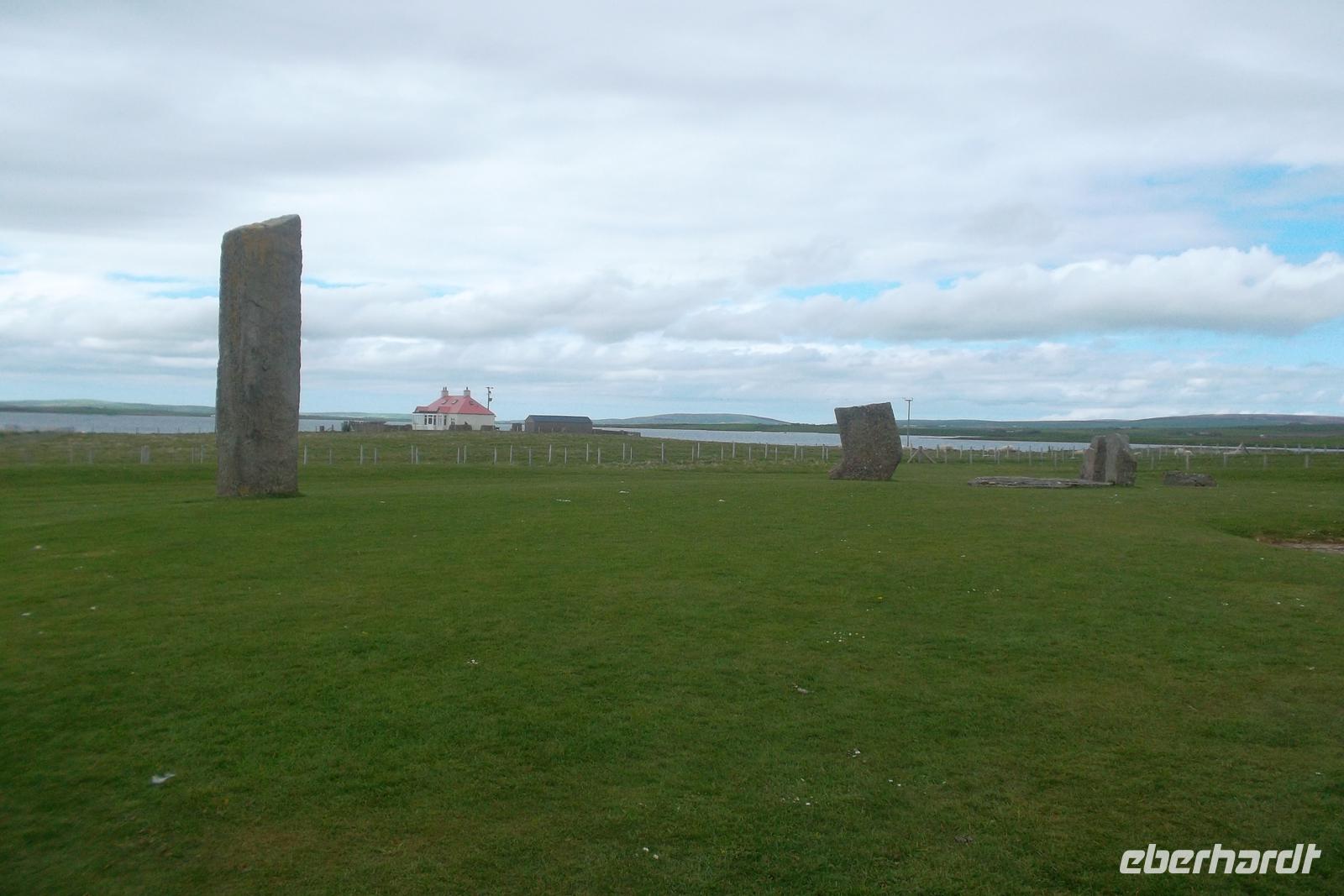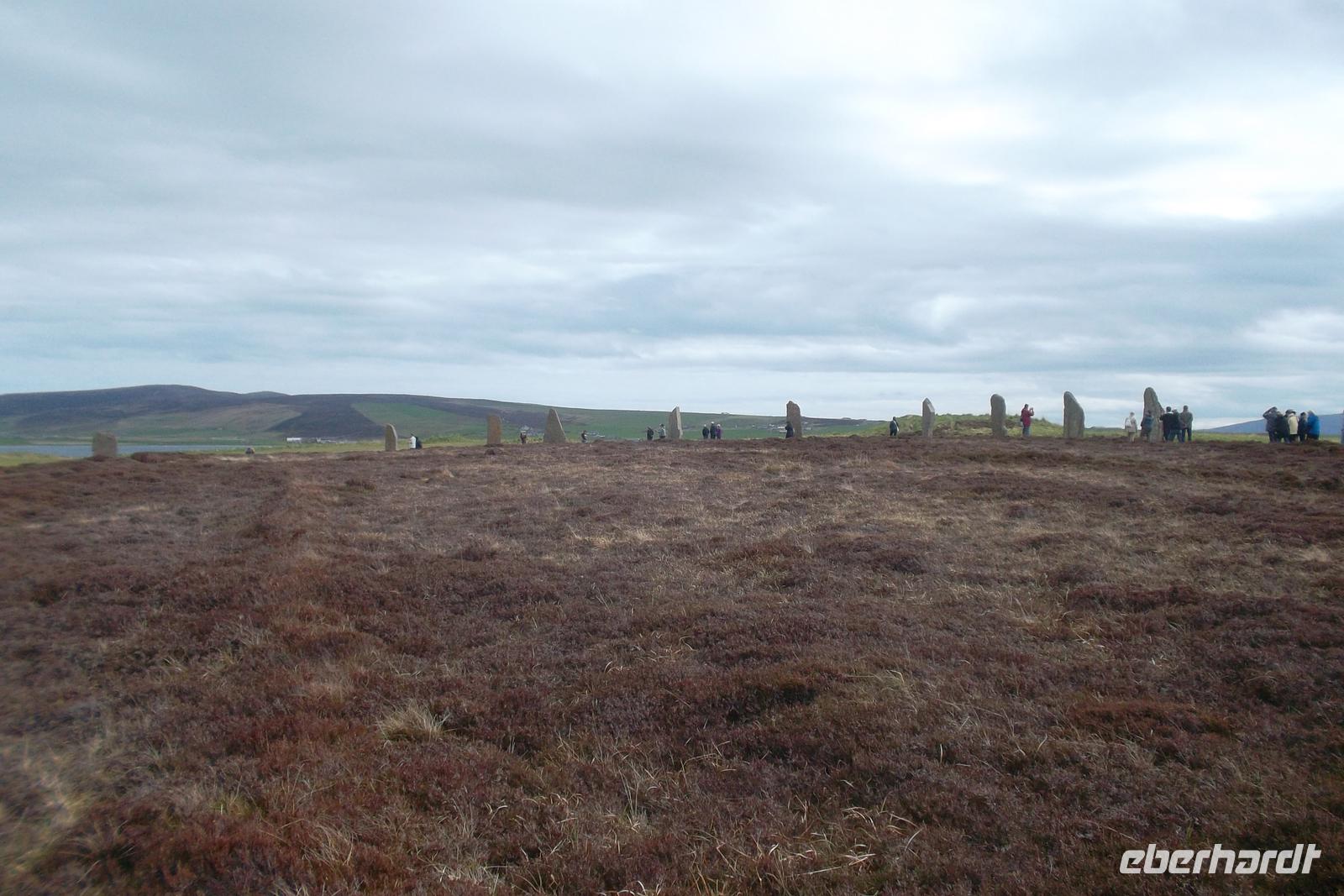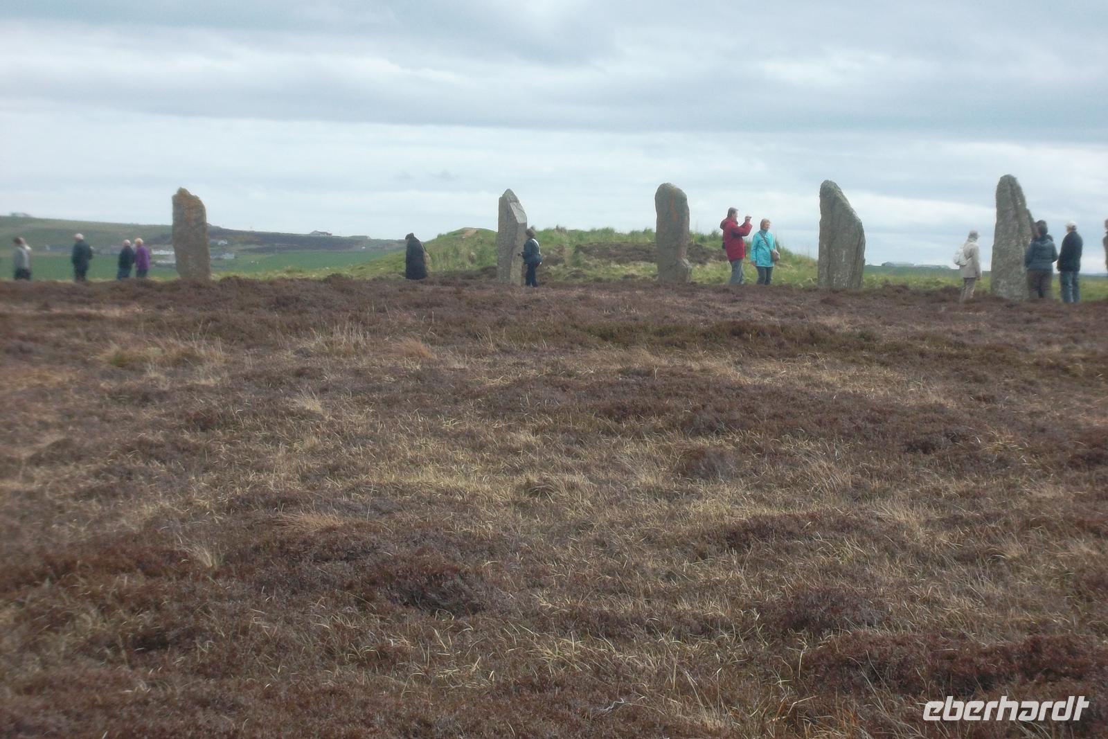 Anschließend fuhren wir zum Cromlech „Ring of Brodgar". Dieser megalithische Steinkreis gehört zu den größten bekannten derartigen Anlagen. Mit über 100 Metern Durchmessern und einst 60 Steinen, von denen 27 noch stehen, hält er den Vergleich mit bekannteren Anlagen aus und war wesentlich umfangreicher als der Kreis der „Standing Stones of Stenness, der ursprünglich 12 Steinriesen enthielt, von dem aber nur noch vier Megalithen erhalten sind.