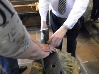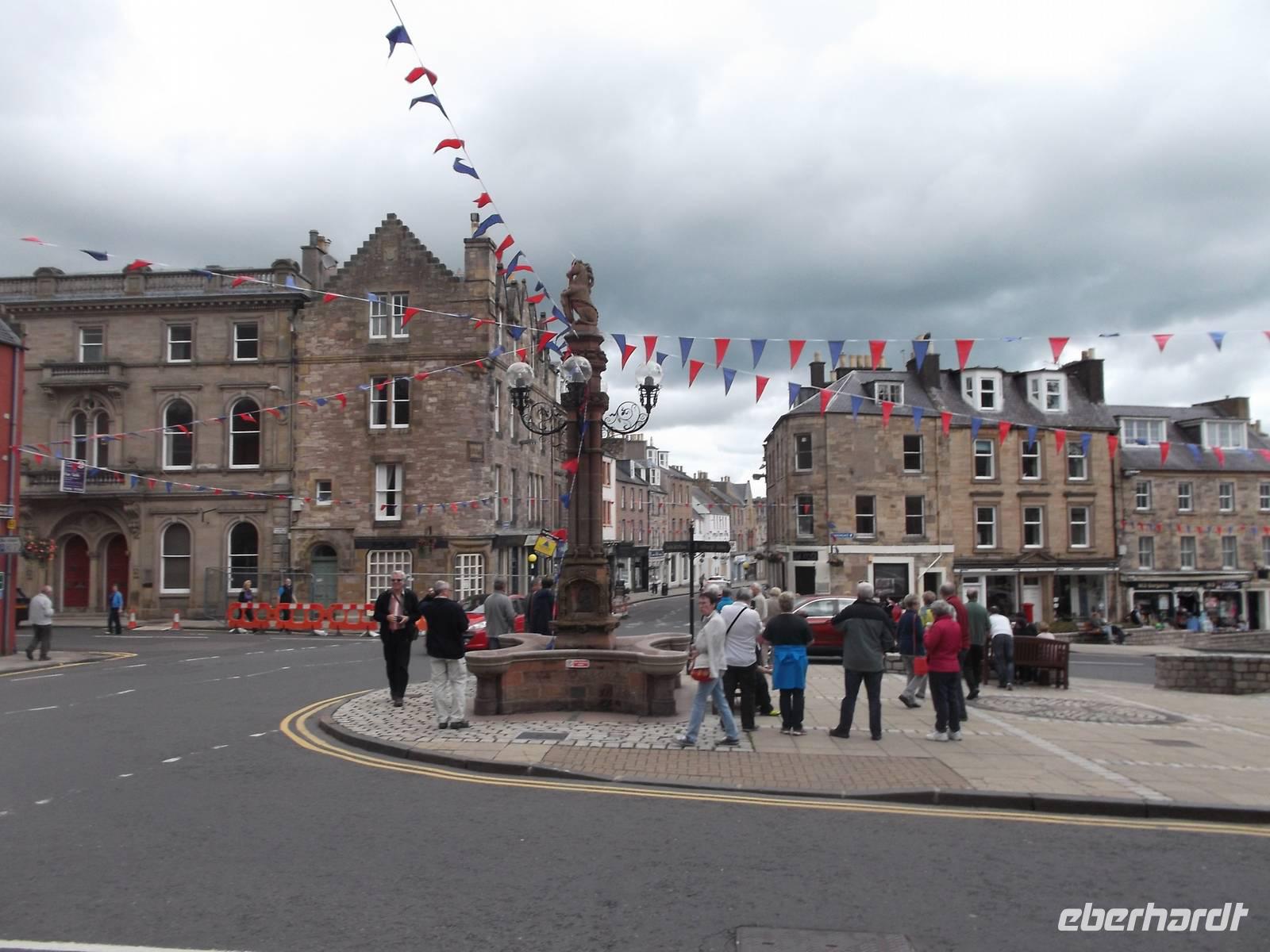 Unser erstes Ziel heute war das bekannte englisch-schottische Grenzdorf Gretna Green. Landesweit bekannt wurde der Name des unscheinbaren Dörfchens durch eine ungewöhnliche Art von Eheschließungen. Nicht am Traualtar sondern am Amboss der örtlichen Grobschmiede wurden hier die sogenannten „Mock-weddings" geschlossen. Vor gut zweihundert Jahren gab es unterschiedliche Heirats-Gesetze in Schottland und England - in Schottland konnten junge Paare ohne Einwilligung der Eltern und in wesentlich jünger heiraten als im Nachbarland. Viele Verliebte aus England, denen die Eltern nie ihre Einwilligung zur Heirat gegeben hätten, begaben sich deshalb auf der einzigen Straße nach Schottland, um hier schnell zu heiraten. Hier vollzog der Friedensrichter die Trauungen - und das war traditionell der Grobschmied des Ortes. Der hatte bald so viel zu tun, dass er - um keine Einbußen zu erleiden und nicht ständig seine Schmiede verlassen zu müssen - die Eheschließungen gleich in seiner Werkstatt vornahm. Vor zwei rasch bestellten (früher meist bezahlten) Trauzeugen wurde das junge Brautpaar an den Amboss geführt und symbolisch - wie zwei Eisenstücke, die der Schmied sonst vereinte - per Hammerschlag „zusammengeschmiedet". Auch in unserer Reisegruppe gab sich ein junges Brautpaar vor der ganzen Reisegruppe in einer witzig gehaltenen Zeremonie noch einmal das Ja-Wort, wobei alle ihren Spaß in Gretna Green hatten. .
