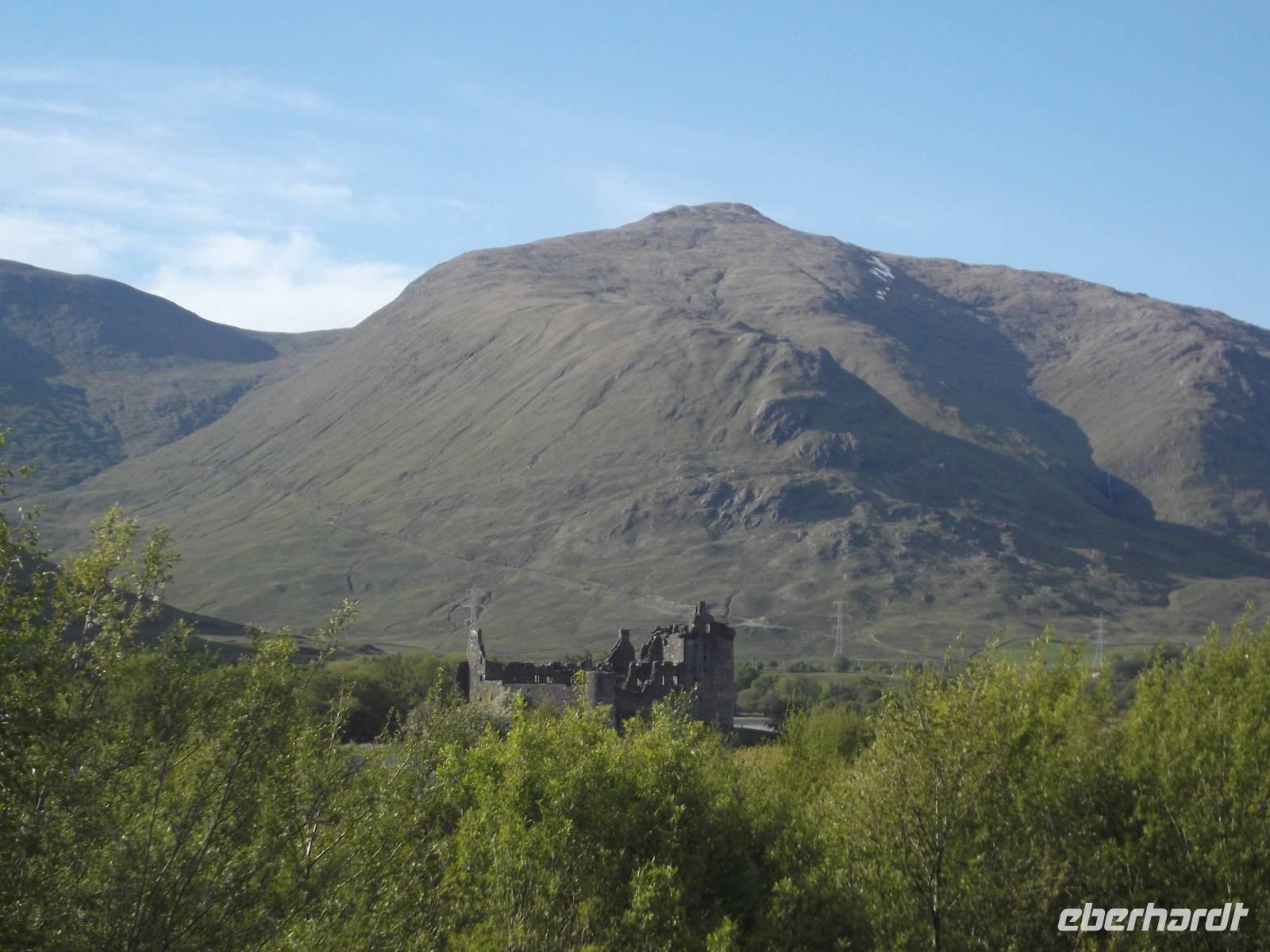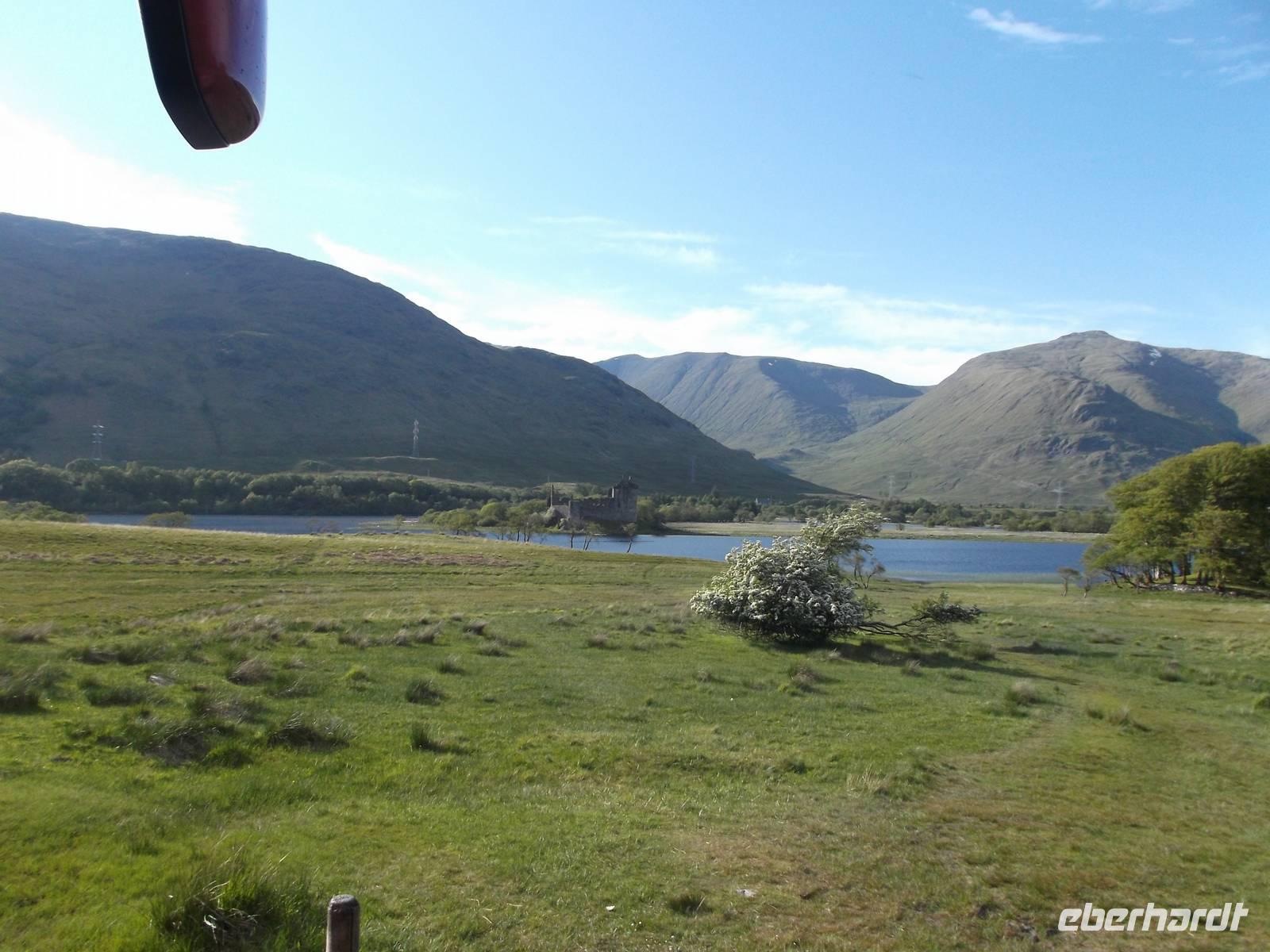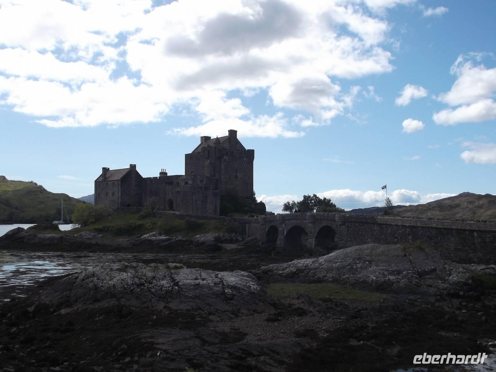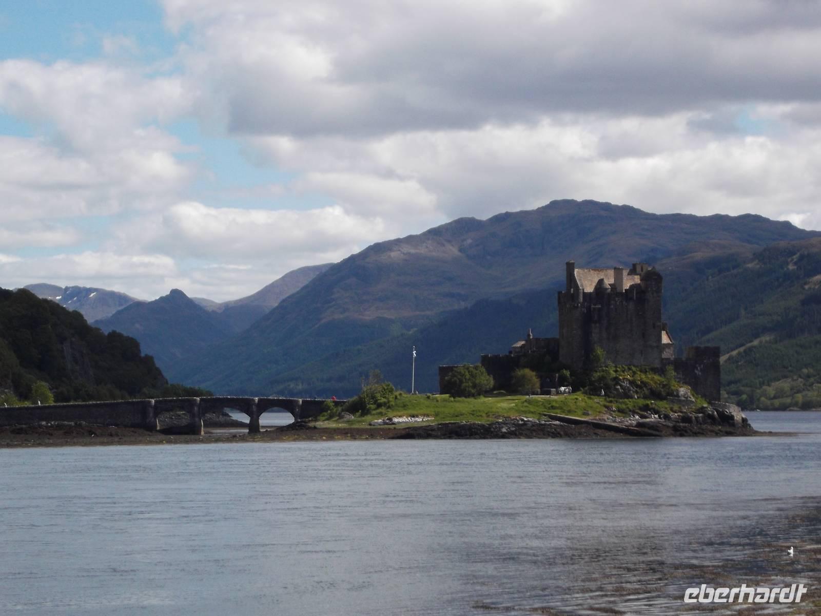 Am Nachmittag ging es zurück durch Skye und nach Überquerung der Brücke von Lochalsh zum bereits wieder auf dem „Festland" liegenden Eilean Donan Castle, einer der schönsten Burgen Schottlands. Bekannt wurde sie als Kulisse vieler Verfilmungen, unter anderem „Braveheart" und „Highlander". Im James-Bond-Film „der Morgen stirbt nie" stellte sie sogar das schottische Hauptquartier des britischen Geheimdienstes dar. Das Schloss mit dem Ambiente klassischer Romantik schottischer Clansitze wurde im 20. Jh. restauriert und befindet sich heute noch im Familienbesitz der McRaesWir besichtigten hier auch die hinter bis zu vier Meter dicken Mauern liegenden Innenräume und den Bankett- und Zeremoniensaal.