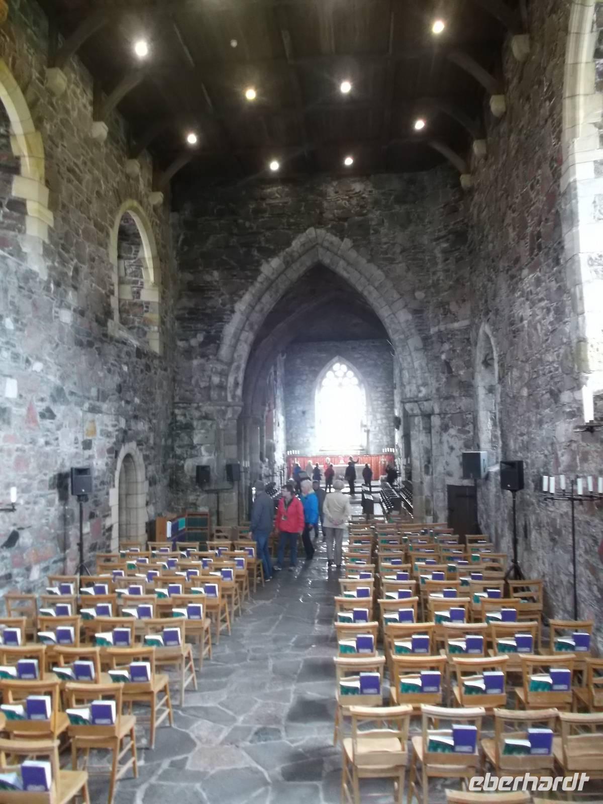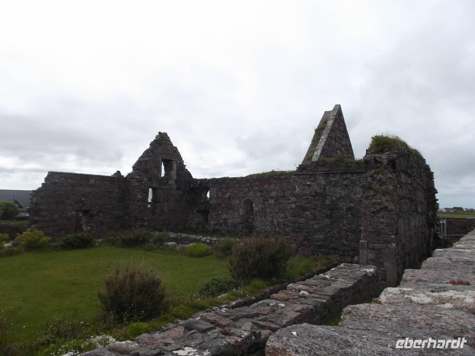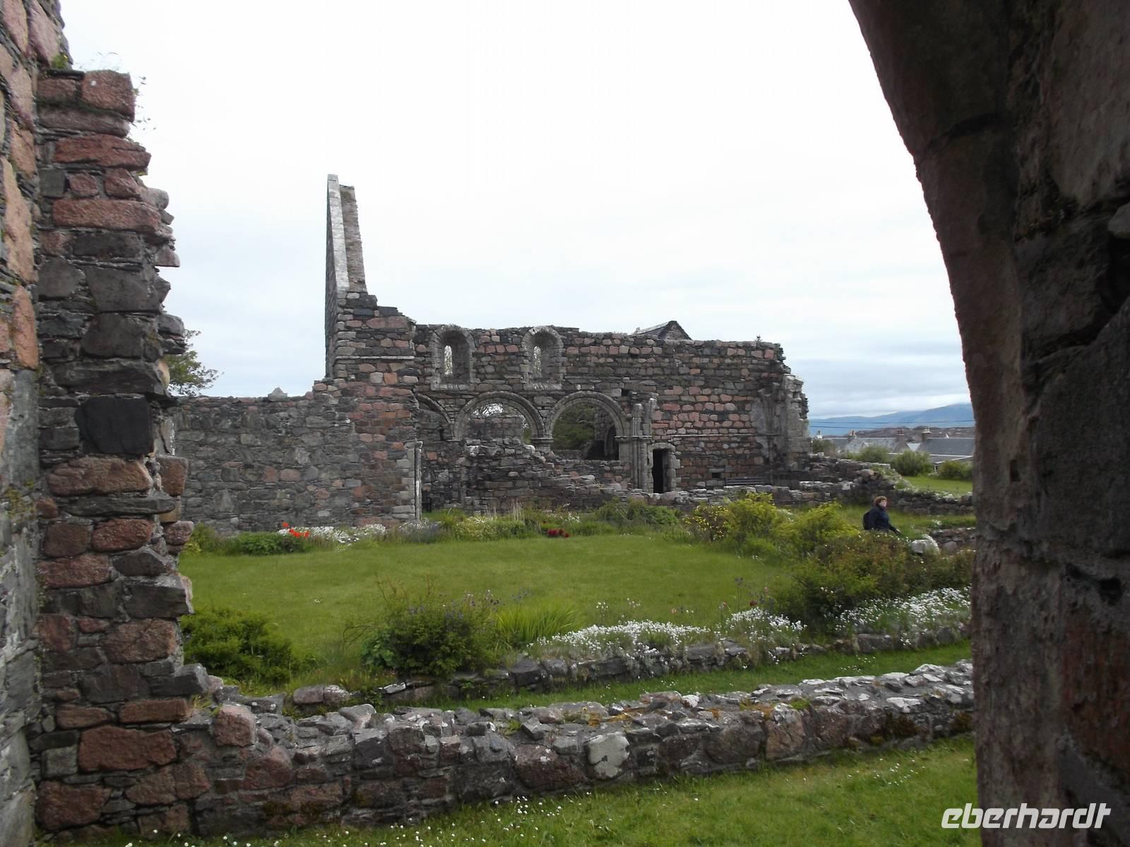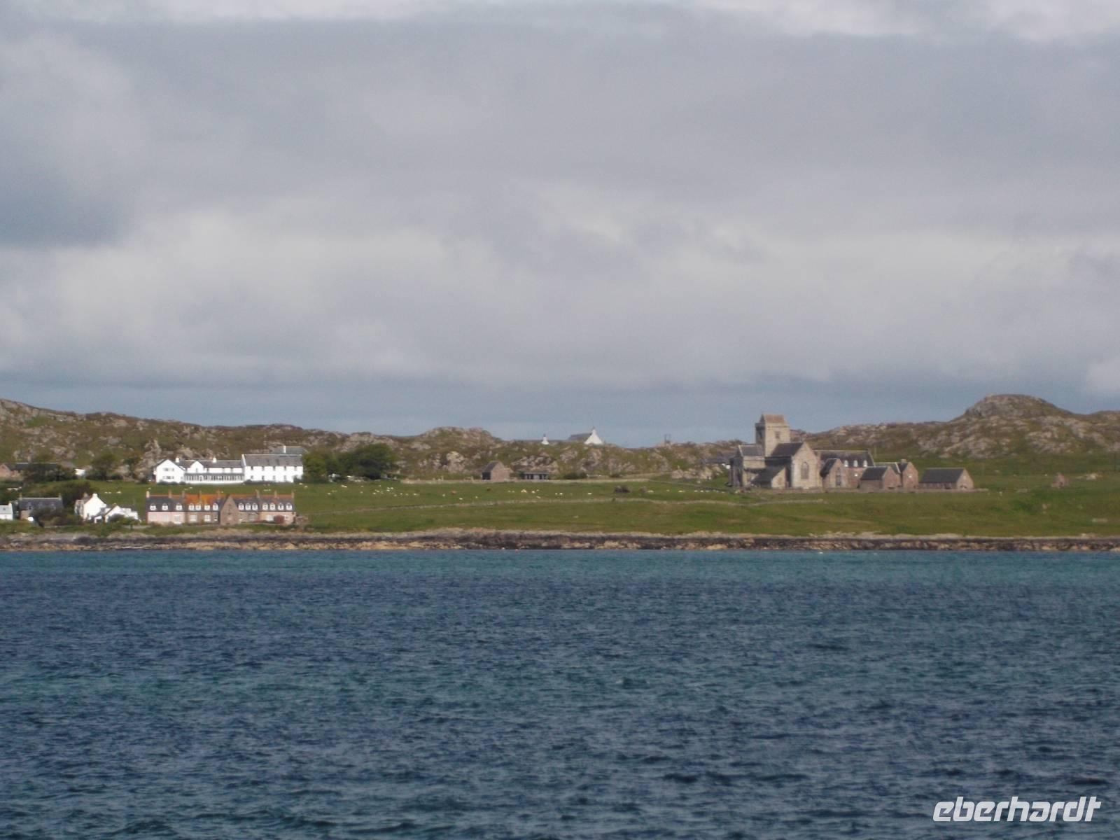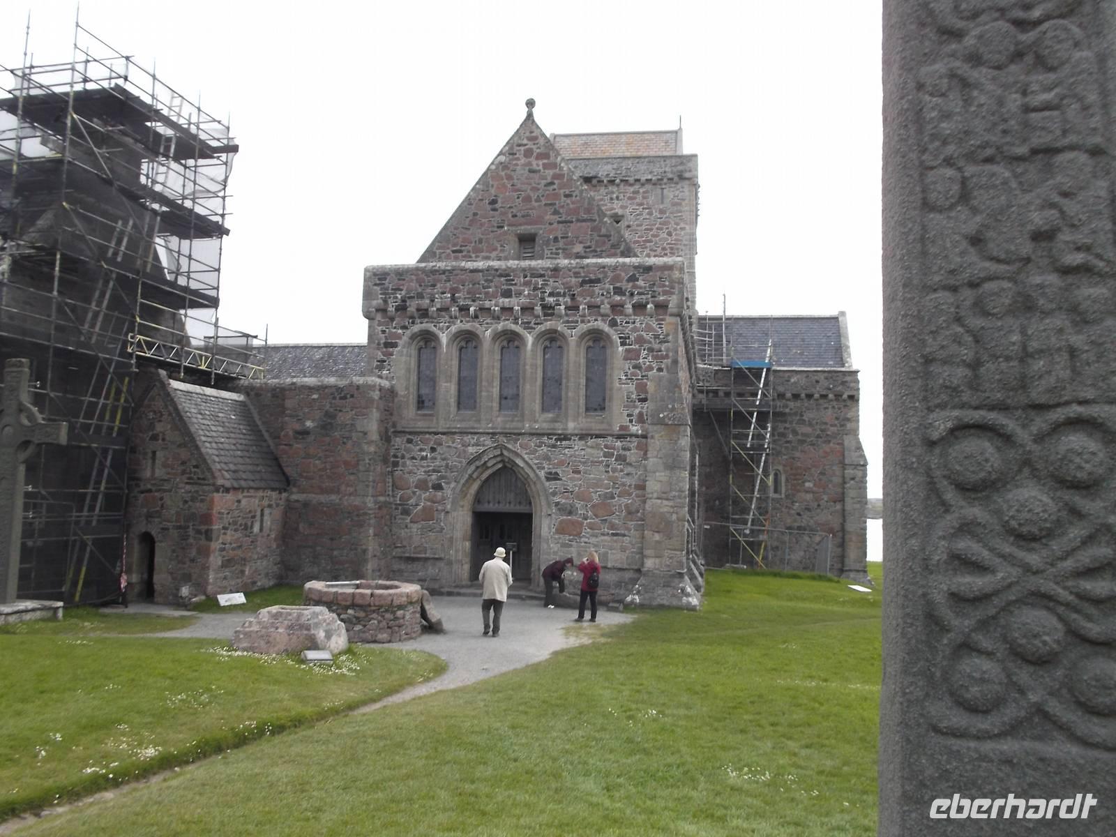 Direkt daneben ist das ursprüngliche Klostergelände mit der sagenhaften Abtei des Hl. Columban, einst Zentrum von Gelehrsamheit, Mission und Buchmalerei. Nach mehreren Wikinger-Überfällen aufgegeben und aufs Festland verlegt, wurde die Abtei dann später wieder genutzt, nach der Reformation aber endgültig verlassen. Erst 1939 wurde sie von der heute noch missionarisch tätigen Iona Community wiedererrichtet. Alte Reste und mehrere verzierte Hochkreuze sind heute noch zu sehen.