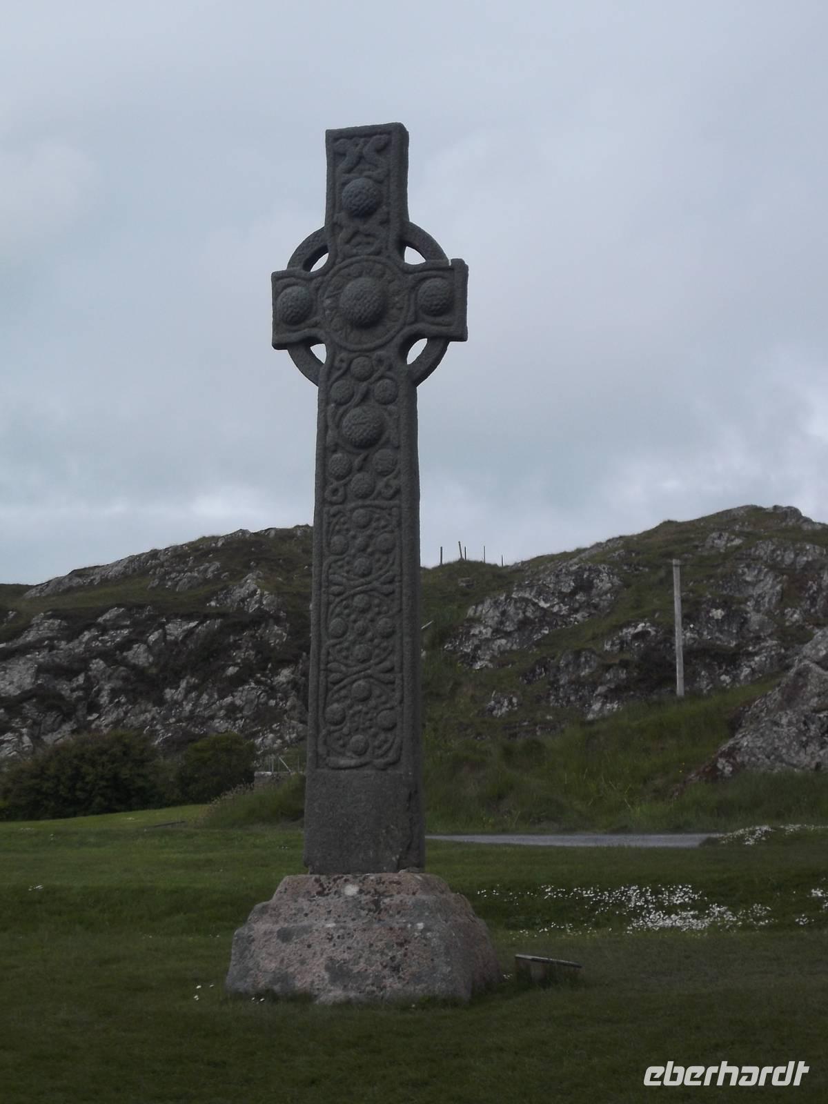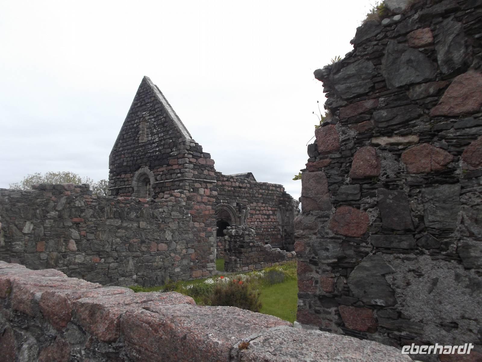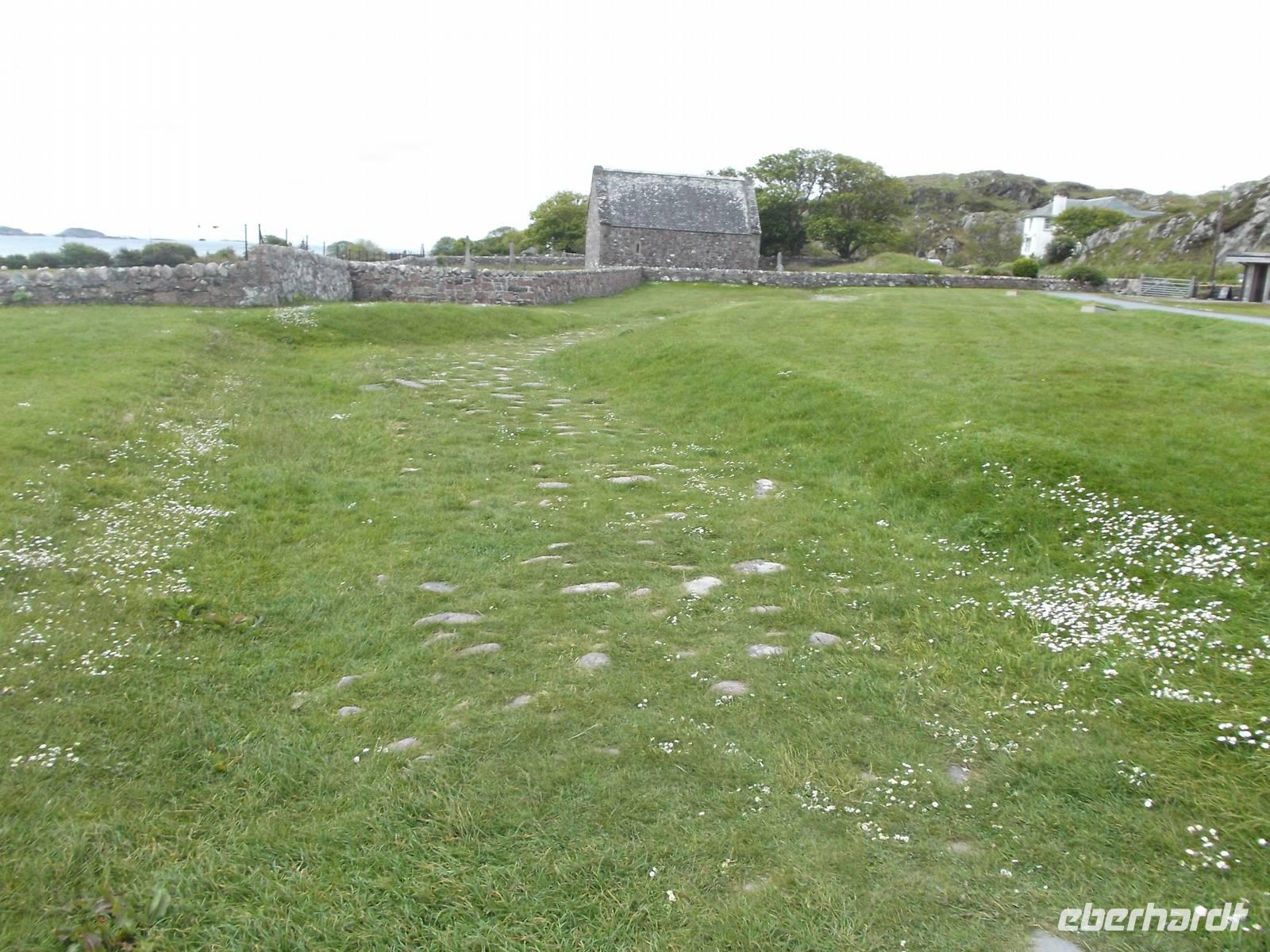 Bekanntheit erlangte das Eiland vor allem wegen des Klosters, das einst der Heilige Columban aus Irland als Abtei errichtet hatte als Zentrum der christlichen Missionierungstätigkeit für das Land der Skoten und der Pikten. Diese berühmte Abtei war unser Ziel und da hier alles recht nahe beieinanderliegt, war sie bequem zu Fuß zu erreichen. Vorbei an den Ruinen eines Nonnenklosters aus dem 13. Jh. waren wir nach ein paar Minuten an der erst seit 1939 wiedererrichteten Abtei von Iona. Bevor wir uns dem Kirchenbau zuwandten, interessierte uns der „Reilig Odhráin" der „Königsfriedhof", eine der historisch bedeutsamsten Stätten des alten Schottland. Der Überlieferung nach war Iona Begräbnisstätte der schottischen Könige von Dalriada und ihrer Nachfolger, aber auch mehrerer irischer und norwegischer Könige. Weit über fünfzig gekrönte Häupter sollen - verschiedenen Literaturangaben zufolge - hier neben der uralte Grabkapelle mit dem schönen sehr frühen romanischen Eingangsfries begraben liegen.