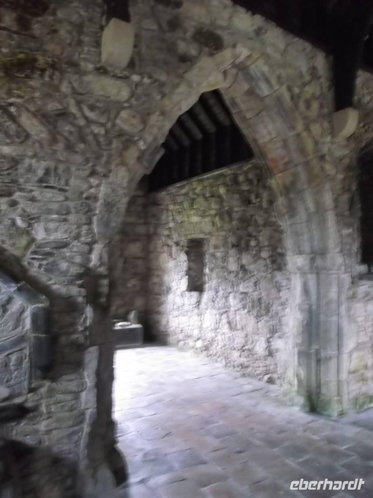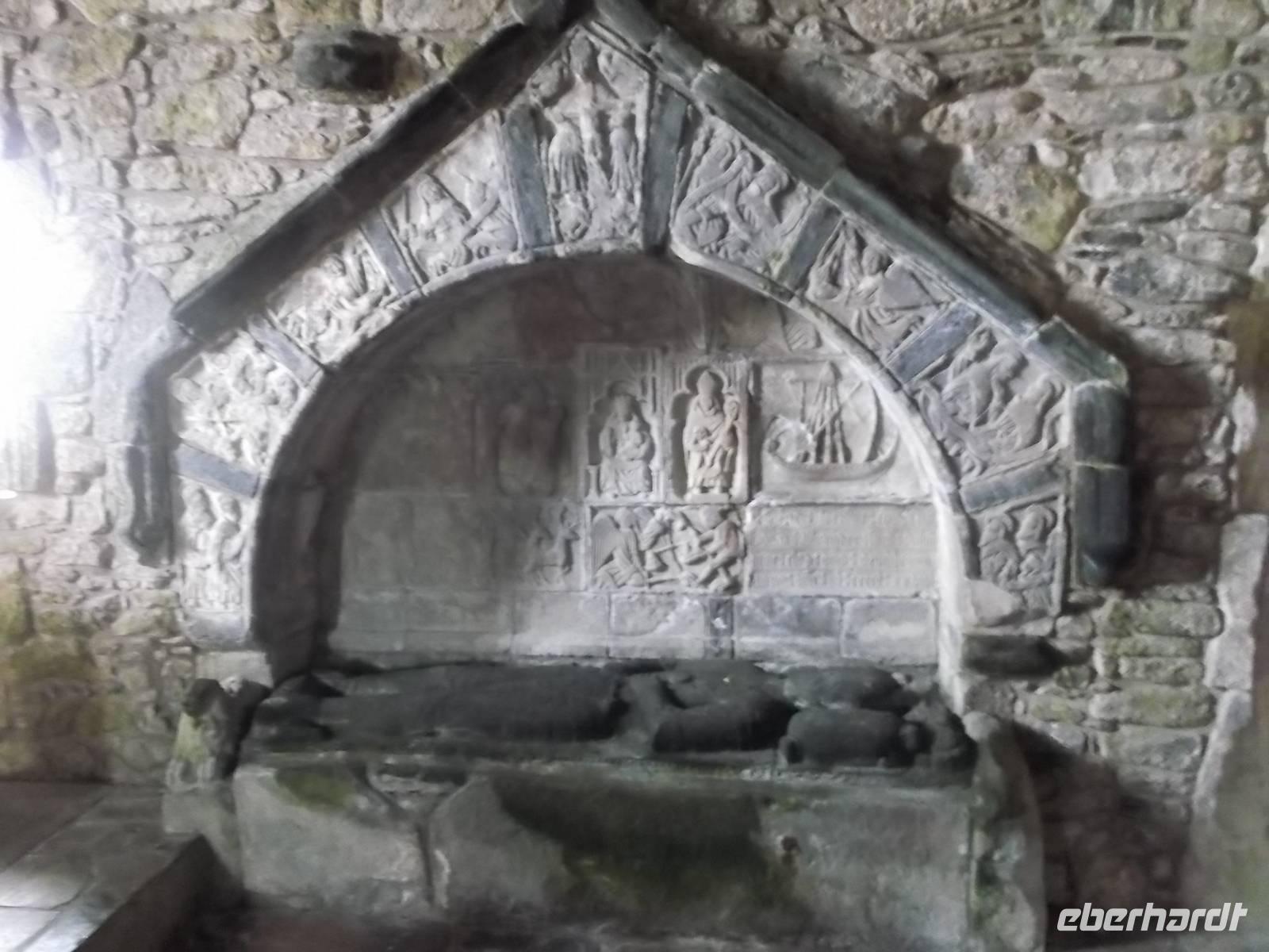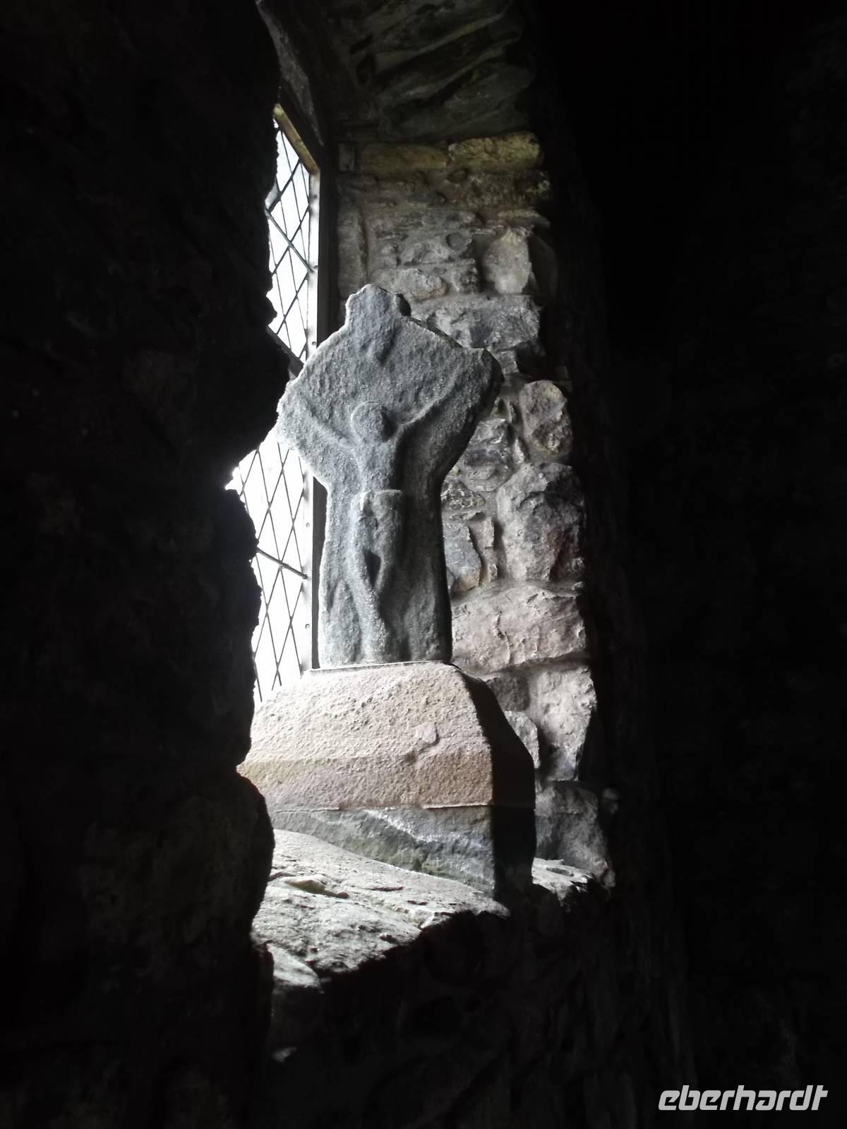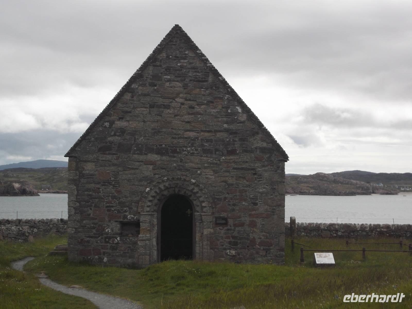 Bekanntheit erlangte das Eiland vor allem wegen des Klosters, das einst der Heilige Columban aus Irland als Abtei errichtet hatte als Zentrum der christlichen Missionierungstätigkeit für das Land der Skoten und der Pikten. Diese berühmte Abtei war unser Ziel und da hier alles recht nahe beieinanderliegt, war sie bequem zu Fuß zu erreichen. Vorbei an den Ruinen eines Nonnenklosters aus dem 13. Jh. waren wir nach ein paar Minuten an der erst seit 1939 wiedererrichteten Abtei von Iona. Bevor wir uns dem Kirchenbau zuwandten, interessierte uns der „Reilig Odhráin" der „Königsfriedhof", eine der historisch bedeutsamsten Stätten des alten Schottland. Der Überlieferung nach war Iona Begräbnisstätte der schottischen Könige von Dalriada und ihrer Nachfolger, aber auch mehrerer irischer und norwegischer Könige. Weit über fünfzig gekrönte Häupter sollen - verschiedenen Literaturangaben zufolge - hier neben der uralte Grabkapelle mit dem schönen sehr frühen romanischen Eingangsfries begraben liegen.