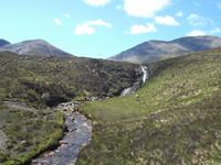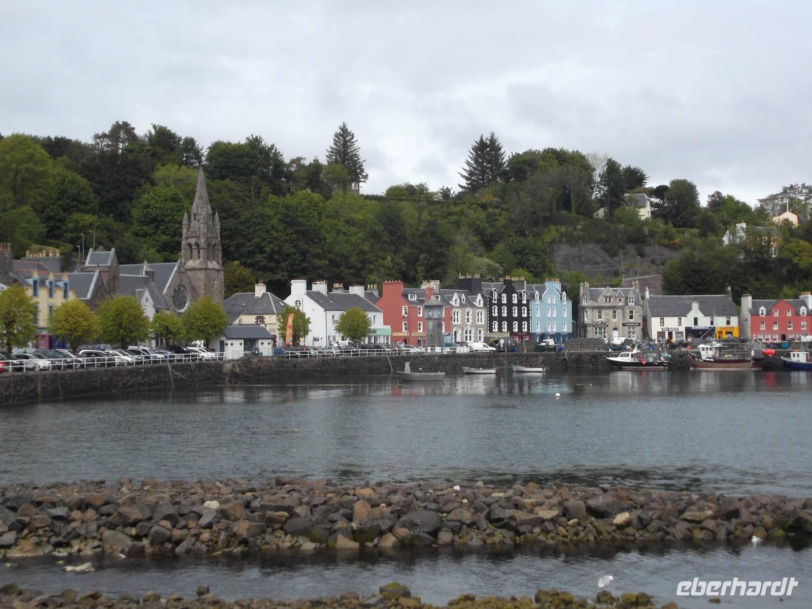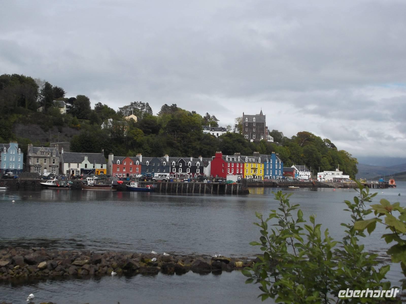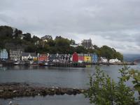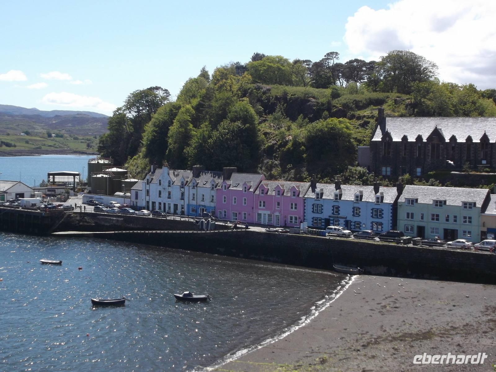 Nach der Fährüberfahrt von etwa 30 zur größten Insel der Inneren Hebriden, Skye, durchquerten wir den südlichen Teil bis zur Inselhauptstadt. Das als landschaftllicher Höhepunkt der Hebriden geltende Skye, von mächtigen Bergketten, die zumindest im Norden der Insel noch deutlich vulkanische Züge aufweisen, hat - mit etwas Phantasie gesehen - auf der Landkarte die Form eines Engels. Daher wird sie mitunter als „Engelsinsel" Bezeichnet, auch wenn ihr gälischer Name in etwa „die Neblige" bedeutet. , und damit begründen die Einwohner auch ihren landschaftlichen Zauber. Nach Fotostopps an einer restaurierten typischen Hebriden-Wohnkate und an einem Wasserfall kamen wir zur Inselhauptstadt Portree, die mit ihren buntbemalten Häusern rund um die Hafenbucht - die stark an Tobermory auf Mull erinnern - ein beliebtes Fotomotiv bildet. Hier hatten wir genügend Zeit, das winzige Städtchen ganz gut kennenzulernen, in dem das kleine historische Marktkreuz und der Aussichtspunkt über den Hafen die Hauptsehenswürdigkeiten bilden.