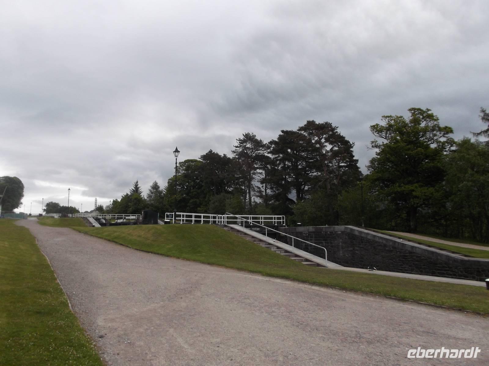 Nach der Besichtigung nahmen wir die Mittagsfähre zurück nach Mull. Hier hatte unser Bus-Chauffeur Hans Apelt bereits den Mittagsimbiss in der Bus-Bordküche vorbereitet. Danach durchquerten wir die Insel Mull in Gegenrichtung erneut mit mehreren Fotostopps und statteten dann noch dem Hauptort Tobermory mit seinen hübschen bunten Häuchen entlang dem Hafen einen Besuch ab, mit etwas Freizeit zur Besichtigung. Am Nachmittag verließen wir zweitgrößte Insel der Inneren Hebriden mit dem Fährschiff der Linie Fishnish - Lochaline. Das brachte uns zu den landschaftlich wunderbaren Halbinseln Morvern und Sunart und von dort ging es weiter in den Touristenort nach Fort William, eines der „Tore zu den Highlands". Ein kleiner Abstecher führte uns noch zu „Neptunes staircase", einer besonders sehenswerten Schleusentreppe. Die zu ihrer Zeit als ingenieurtechnische Höchstleistung geltende Anlage ist eine Abfolge von acht Schleusen, die einen gewaltigen Höheunterschied im „Kaledonischen Kanal" überwindet. Der wurde als für kleine Lastschiffe befahrbare Wasserverbindung quer durch das Great Glen, das längste Hochlandtal, im 19. Jahrhundert von Ingenieur Telford zwischen Inverness und Fort William angelegt und führte unter anderem durch drei große Seen, darunter das Loch Ness.
