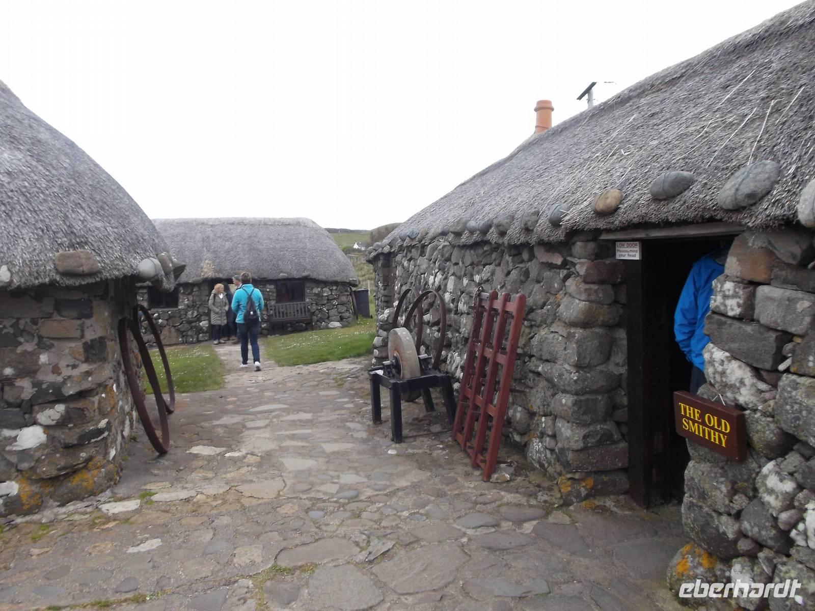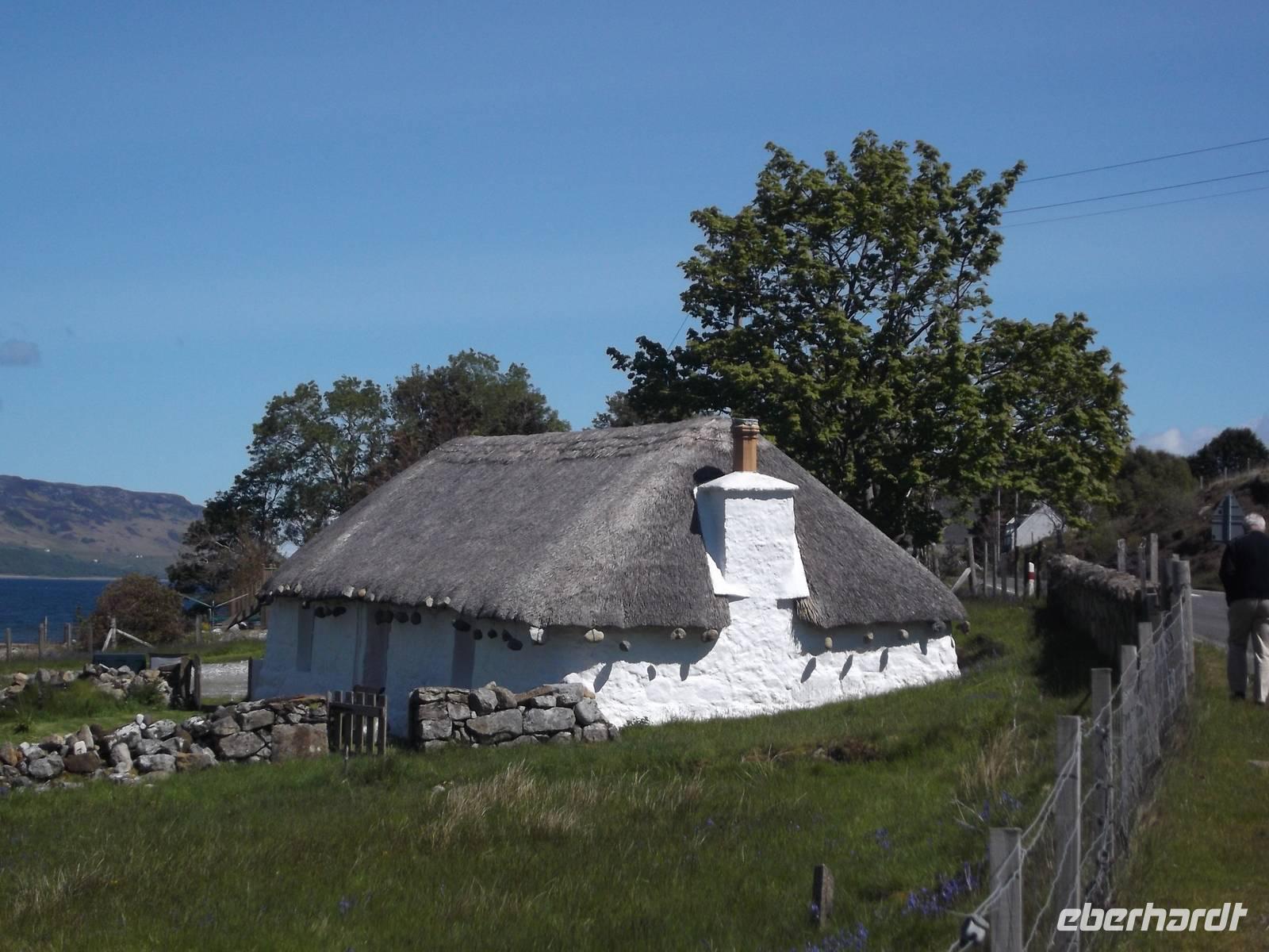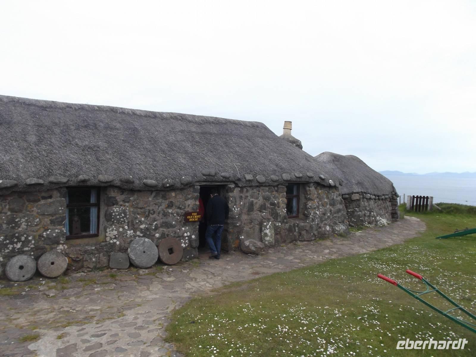 Nach dem ausgedehnten Fotostopp am Kilt Rock fuhren wir zur Nordspitze der Halbinsel Trotternish, denn hier der Besuch des „Isle of Skye Museum" geplant. Das kleine, malerische Freilichtmuseum zeigt traditionelle „Black Houses" mit einer Ausstellung zur Lebensweise auf den Hebriden. Wer wollte, hatte auch noch genug Zeit, den berühmten, wenige hundert Meter entfernten Friedhof von Kilmuir aufzusuchen, der unter anderem das Grab der schottischen Nationalheldin Flora McDonald berherbergt, die 1746 dem vor seinen englischen Verfolgern fliehenden Jakobitenführer „bonnie Prince Charlie" das Leben rettete und ihm die Flucht ins französische Exil ermöglichte