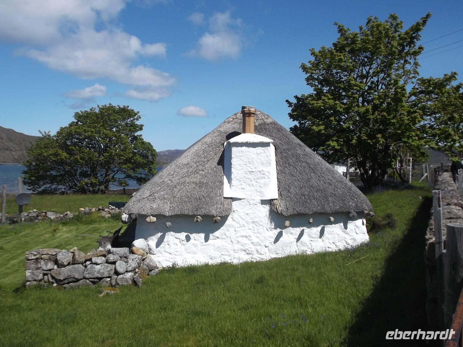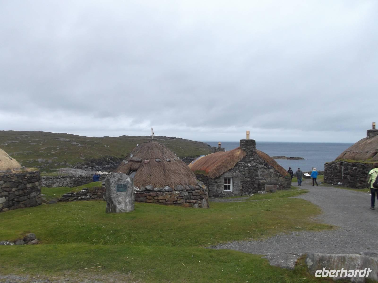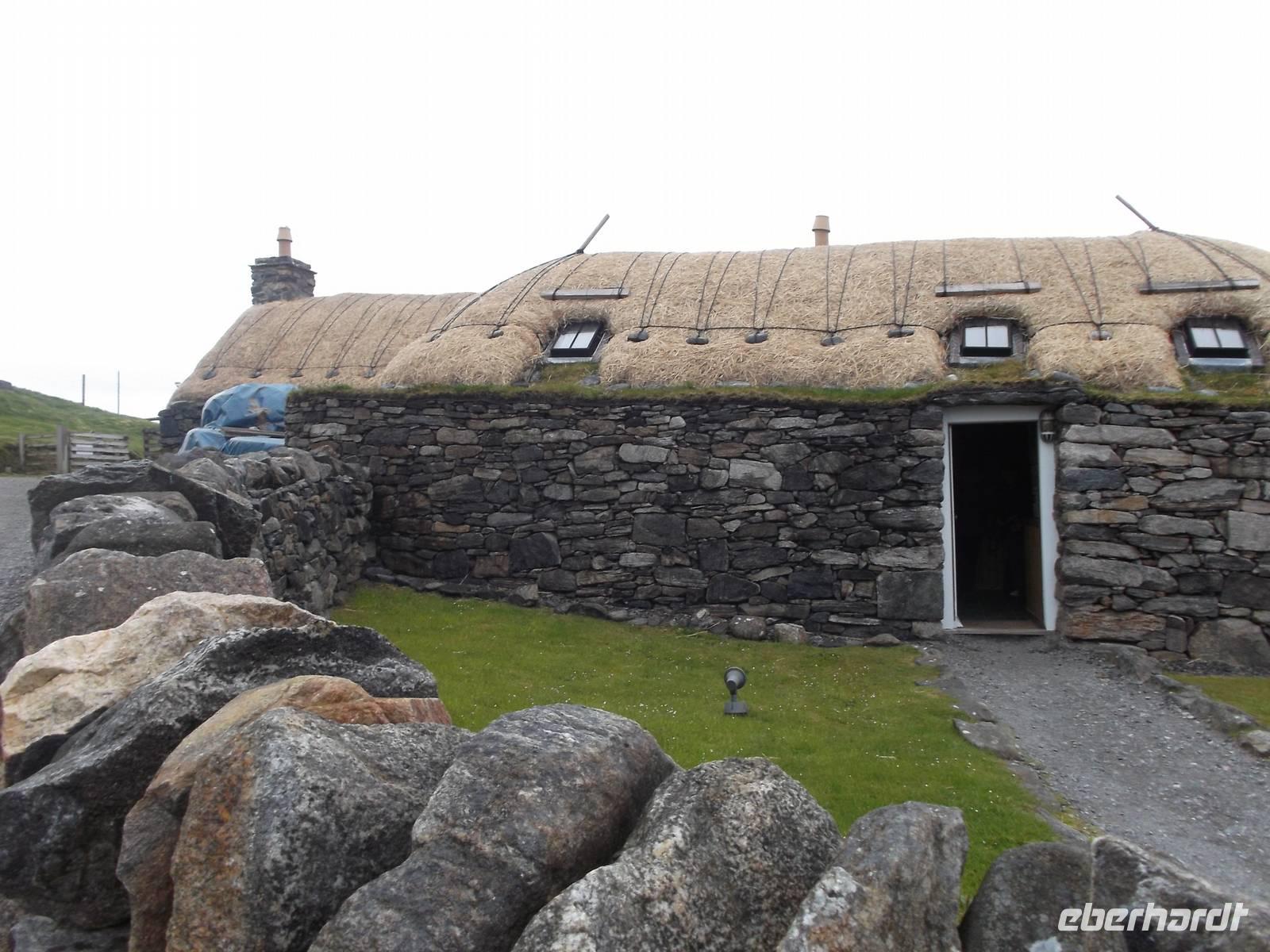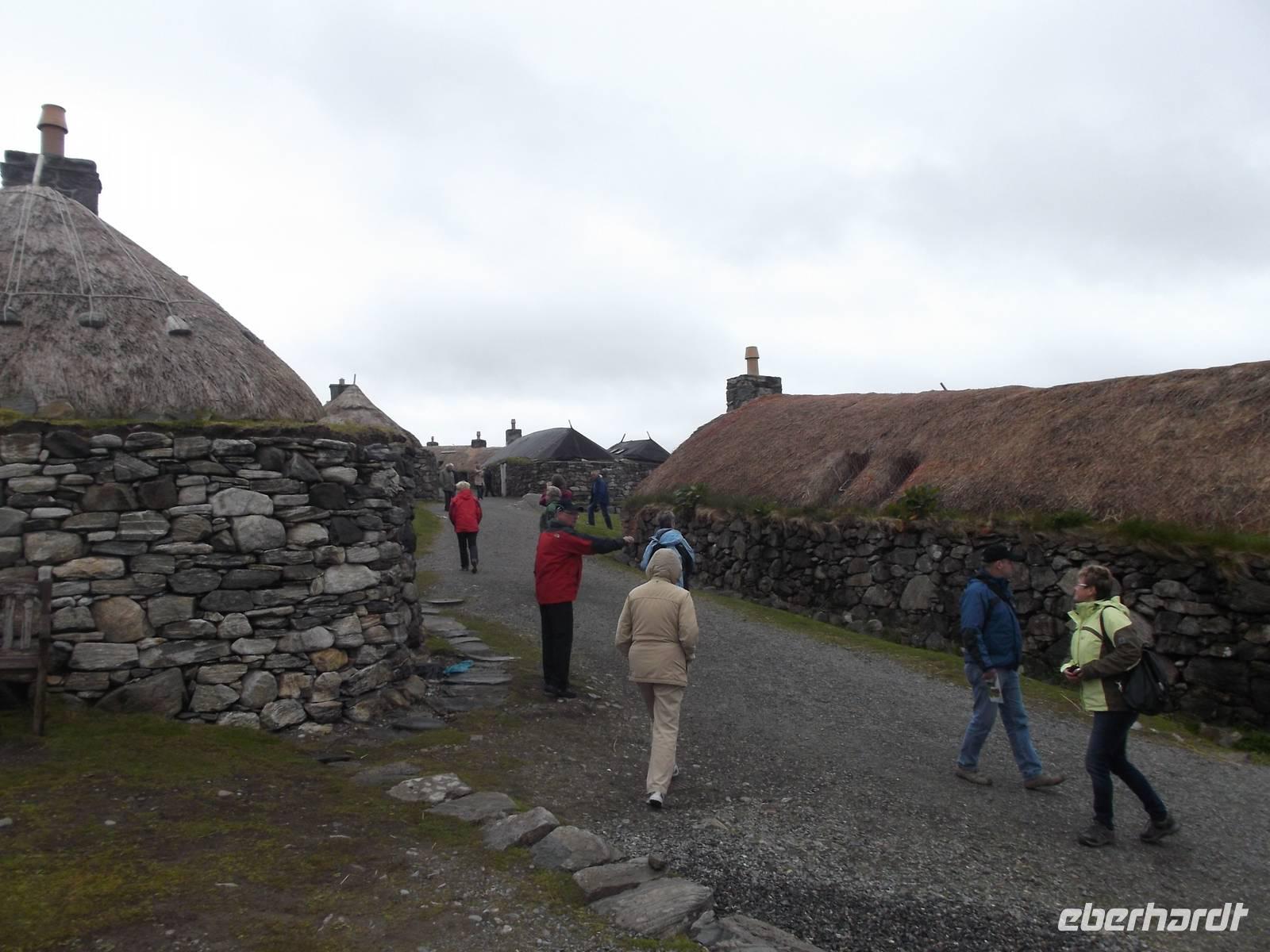 Unsere heutige Rundfahrt führte uns zunächst in den Inselnorden, wo wir kurz am Hafenbecken von Port Nis verweilten, bevor wir die Südweststraße in Küstennähe zurückfuhren. Nach einem Fotostopp am originellsten Hauseingang - der am Wohnsitz eines ehemaligen Walfängers durch den Unterkieferknochen eines Blauwals gebildet wurde - konnten wir als „Richtig-Reisen-Extra" den Besuch des Blackhause-Dorfes An Gearannan einbauen. Hier verweilten wir in einer Siedlung aus (restaurierten) „Blackhouses", des einstmals wichtigsten Haustyps auf den Hebriden und teilweise in IrlandDie Häuser wurden üblicherweise aus Trockensteinmauerwerk errichtet. Die Zwischenräume der doppelten Wände wurden zur Wärmedämmung mit Erde oder Torf ausgefüllt und die Dächer mit Grassoden oder Schilfrohr gedeckt, oft mit ausgedienten Fischernetzen bezogen, die gegen den steten Wind mit Steinen beschwert wurden. Das Dach hatte aber keinen Rauchabzug - und wegen des rußenden Herdfeuers kam der Name „schwarzes Haus" auf (black house), in dem sowohl Menschen als auch Tiere - mit einer Trennwand dazwischen - lebten.