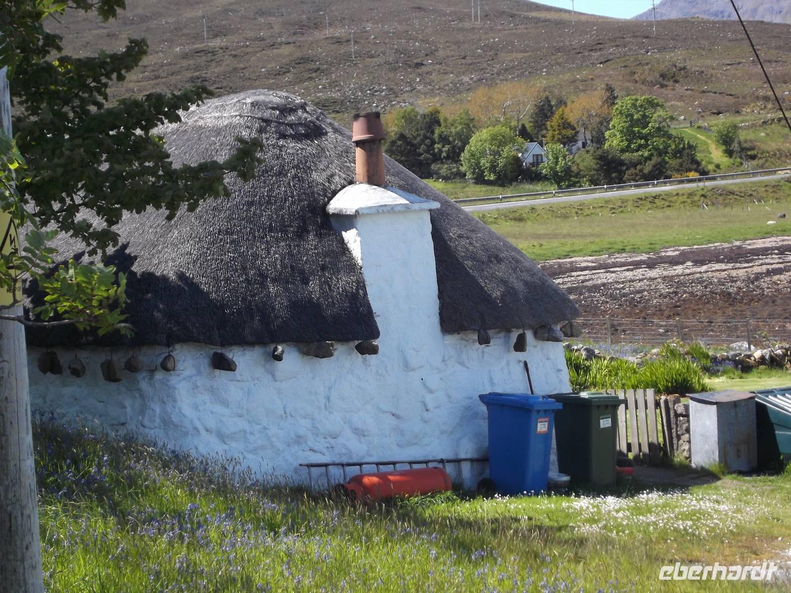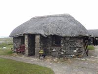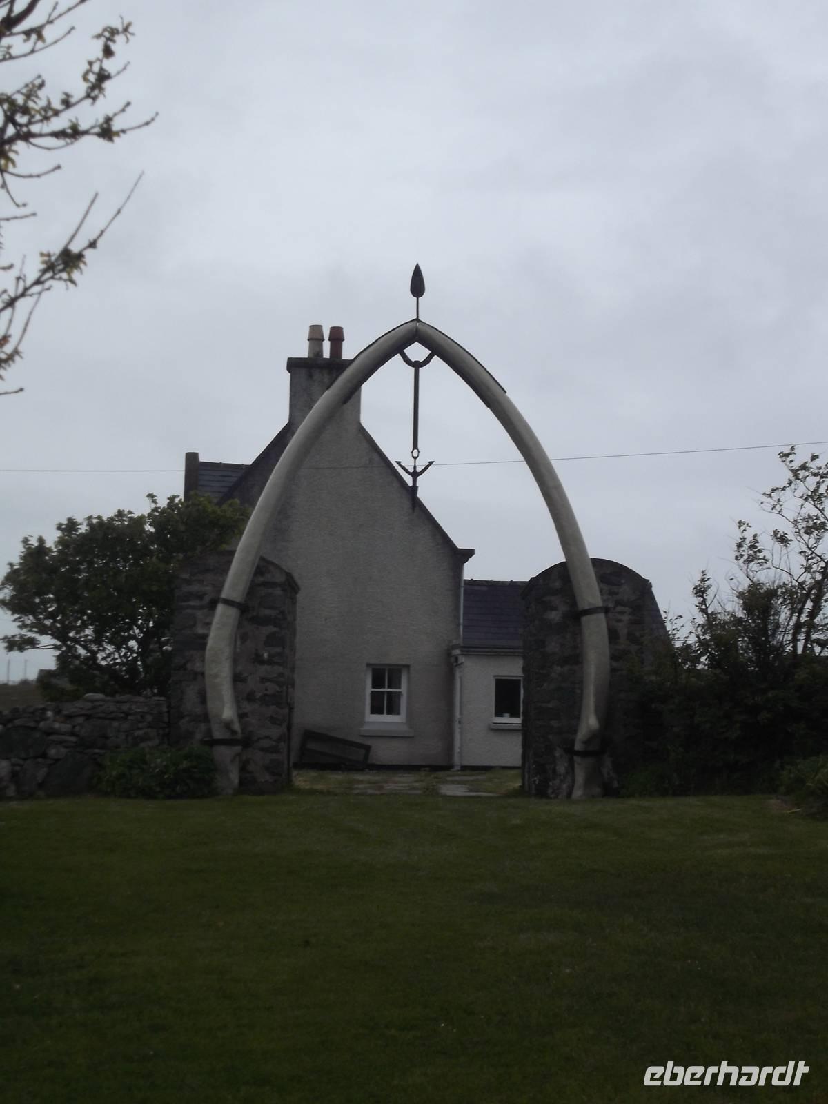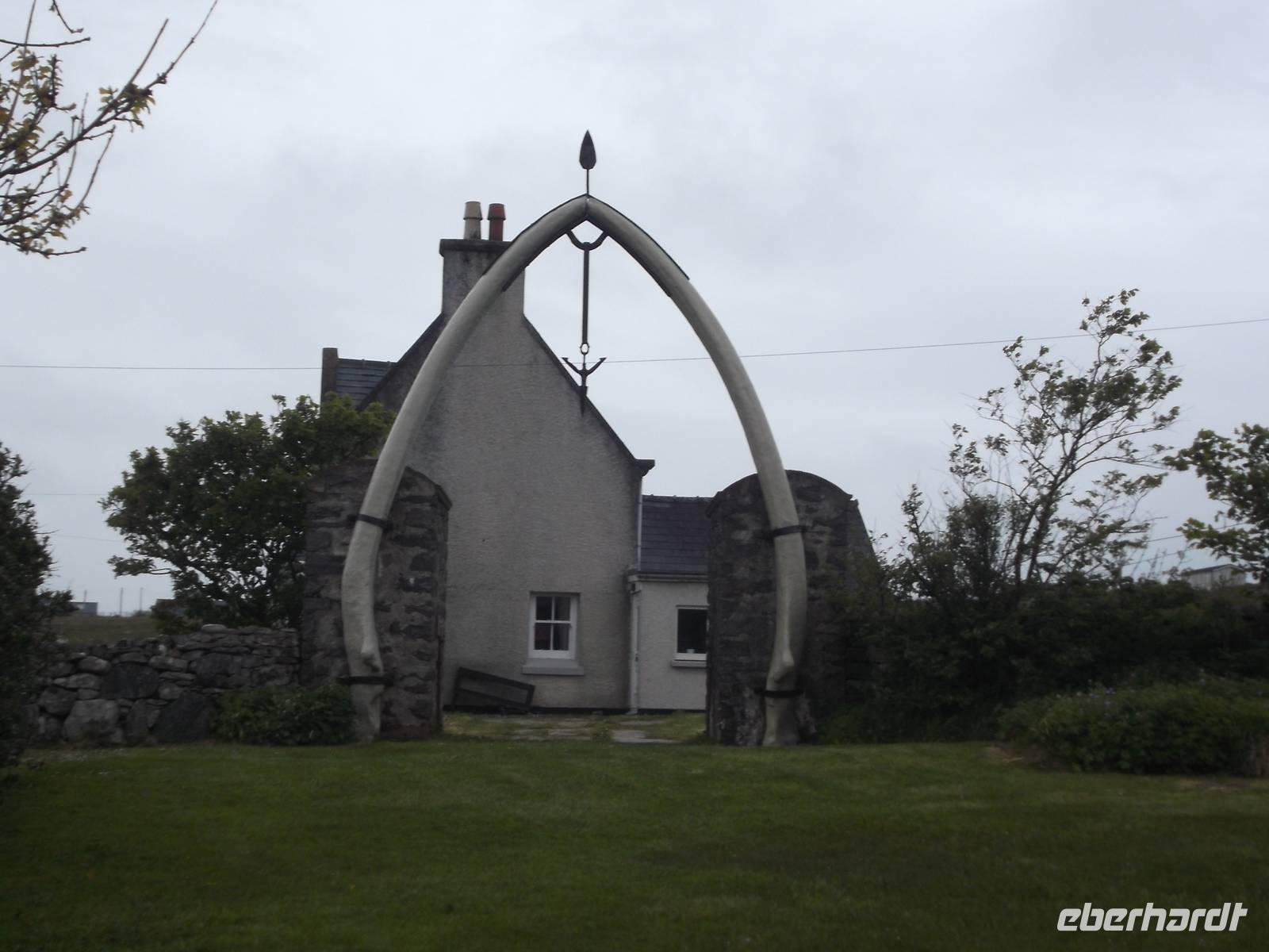 Unsere heutige Rundfahrt führte uns zunächst in den Inselnorden, wo wir kurz am Hafenbecken von Port Nis verweilten, bevor wir die Südweststraße in Küstennähe zurückfuhren. Nach einem Fotostopp am originellsten Hauseingang - der am Wohnsitz eines ehemaligen Walfängers durch den Unterkieferknochen eines Blauwals gebildet wurde - konnten wir als „Richtig-Reisen-Extra" den Besuch des Blackhause-Dorfes An Gearannan einbauen. Hier verweilten wir in einer Siedlung aus (restaurierten) „Blackhouses", des einstmals wichtigsten Haustyps auf den Hebriden und teilweise in IrlandDie Häuser wurden üblicherweise aus Trockensteinmauerwerk errichtet. Die Zwischenräume der doppelten Wände wurden zur Wärmedämmung mit Erde oder Torf ausgefüllt und die Dächer mit Grassoden oder Schilfrohr gedeckt, oft mit ausgedienten Fischernetzen bezogen, die gegen den steten Wind mit Steinen beschwert wurden. Das Dach hatte aber keinen Rauchabzug - und wegen des rußenden Herdfeuers kam der Name „schwarzes Haus" auf (black house), in dem sowohl Menschen als auch Tiere - mit einer Trennwand dazwischen - lebten.