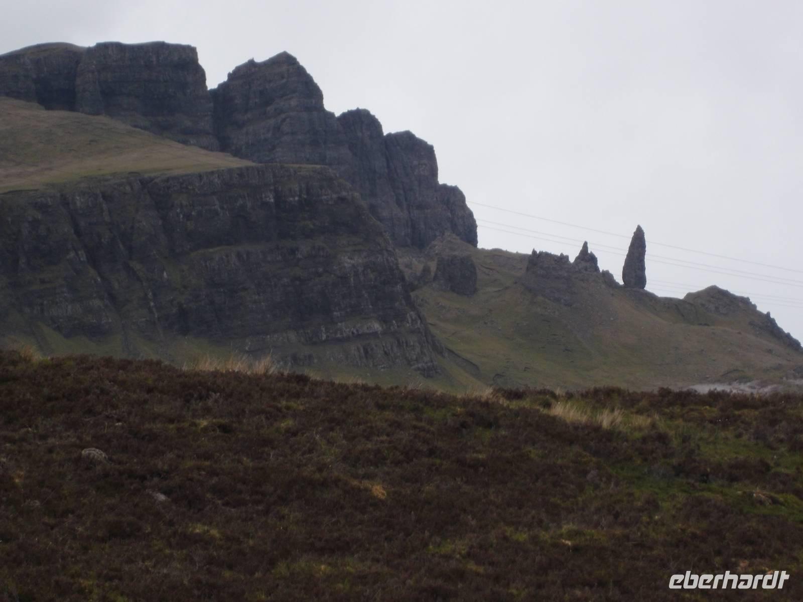 Vorbei an der Inselhauptstadt Portree, die wir ja gestern schon besucht hatten, führte unser Weg heute erneut durch Skye. Erster Stopp war in der Nähe eines der landschaftlichen Höhepunkte der Insel: Das Storr-Gebirge bildet den Übergang zur nordöstlich aus Skye herausragenden Halbinsel Trotternisch. Als markante Landmarke ragt hier die Felsnadel des „Old Man of Storr" etwa fünfzig Metern hoch schräg aus den Felsen heraus. Wir machten hier einen kleinen Fotostopp, denn neben dem Kilt Rock, einer anderen Felsenformation, ist dies das beliebteste Fotomotiv der Hebrideninsel.