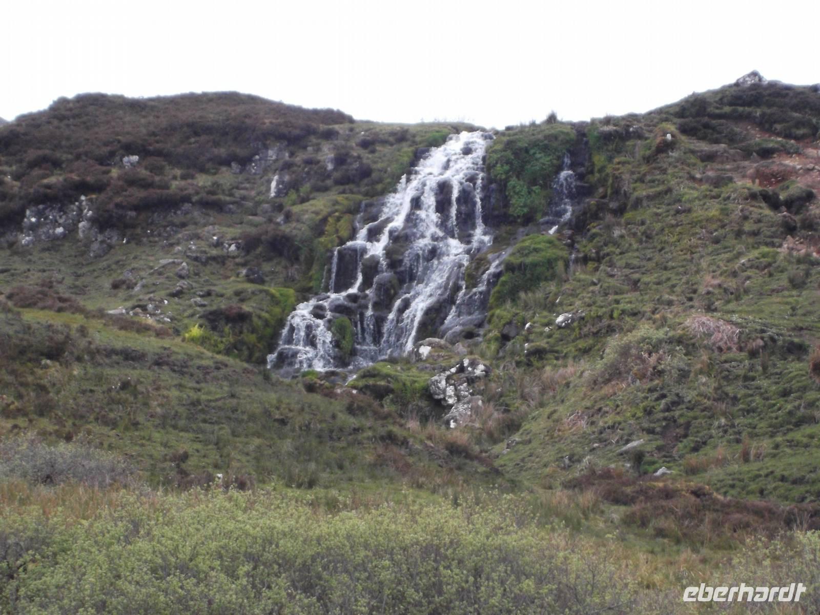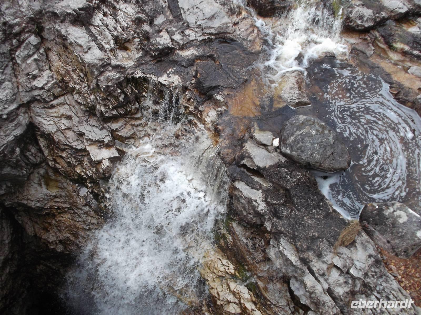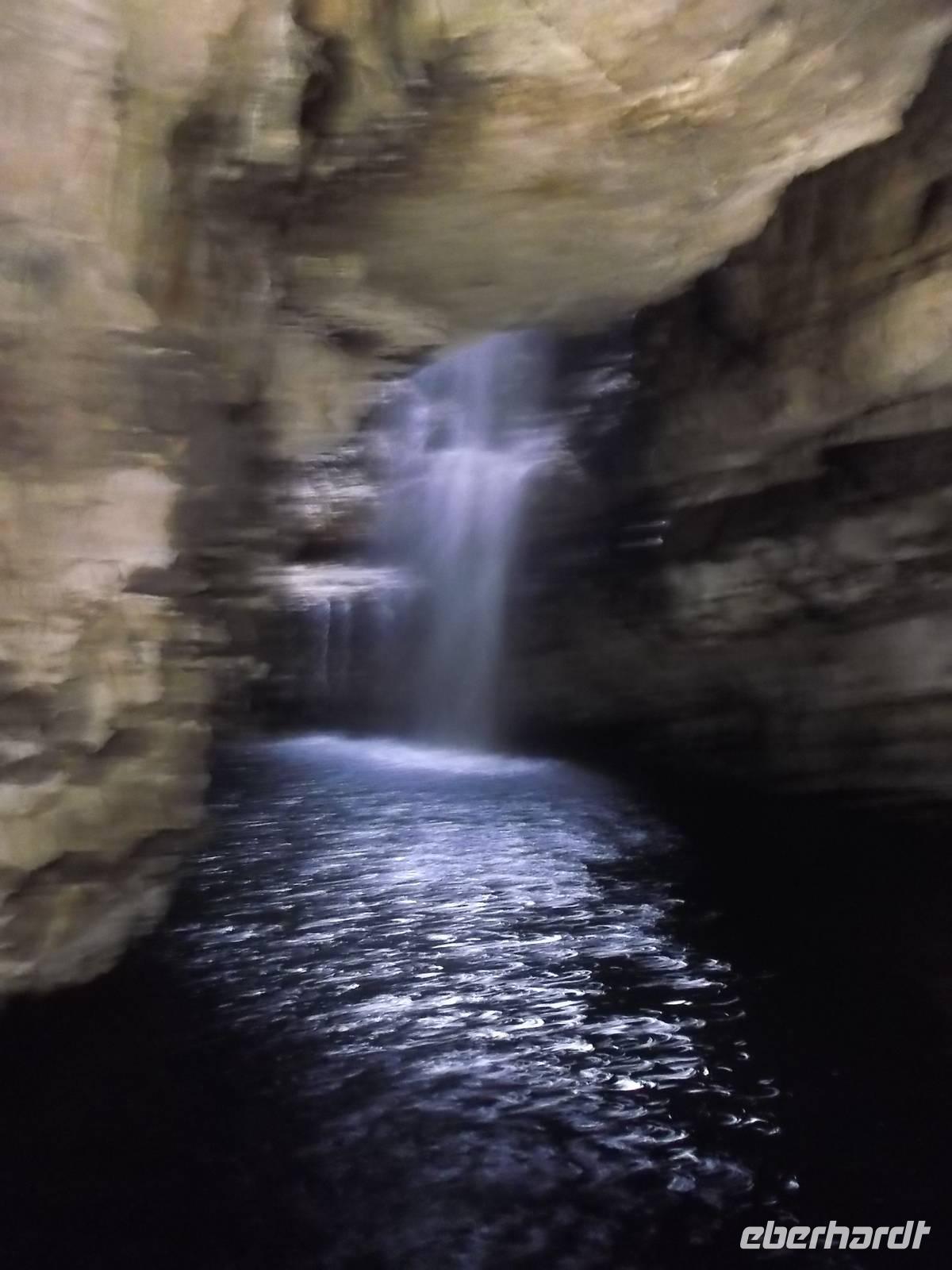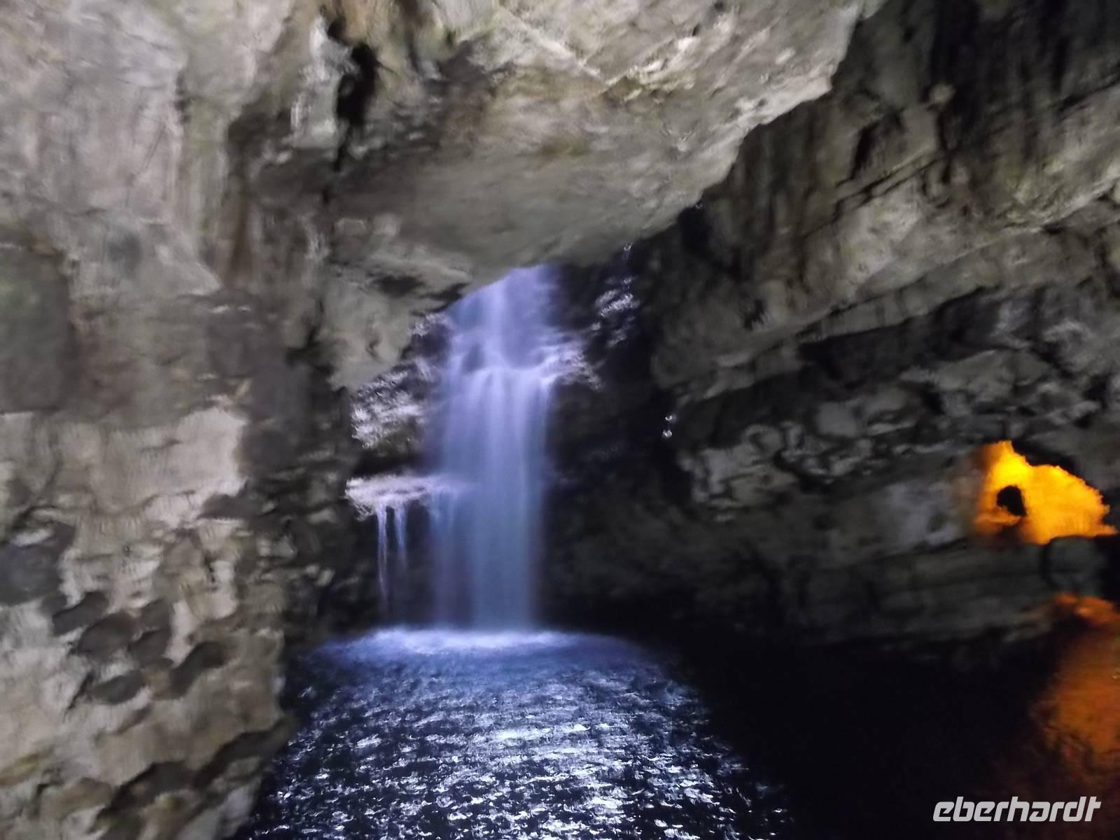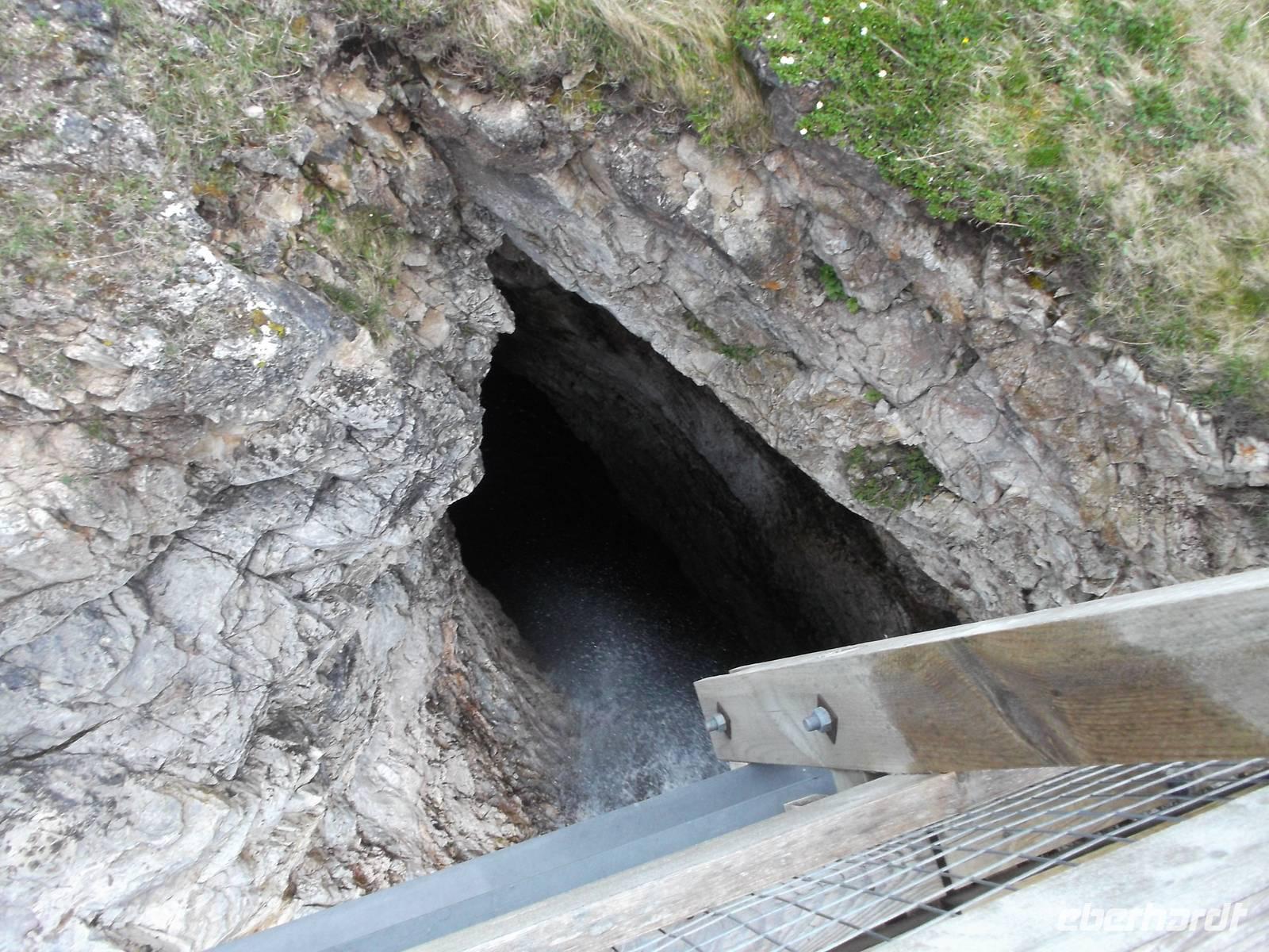 Auf dem weiteren Weg hielten wir an einer angeblich schon in der Antike bekannten Höhle. Die Griechen hätten die inzwischen für Touristen recht gut ausgebaute Smoo -Cave, ein recht ausgedehntes Kalksteinhöhlensystem, für einen Eingang zur Unterwelt gehalten. Ein Stück muss man auf etwas ausgetretenen Stufen hinunterklettern, bis man etwa das Flutniveau des Meeres erreicht hat. Nach Überqueren einer Brücke und nach einem kurzen Weg und Passieren eines überdachten Ganges, lüftet die Höhle ihr Geheimnis: denn in sie ergießt sich ein bei Regen oder nach der Schneeschmelze beeindruckender Wasserfall, dessen Schwall in den Höhlensee rauscht. Das Mundloch des Wasserfalls kann man dann beim Gang zum Busparkplatz sehen, wenn das kleine Bächlein plötzlich in einem Felsloch verschwindet.