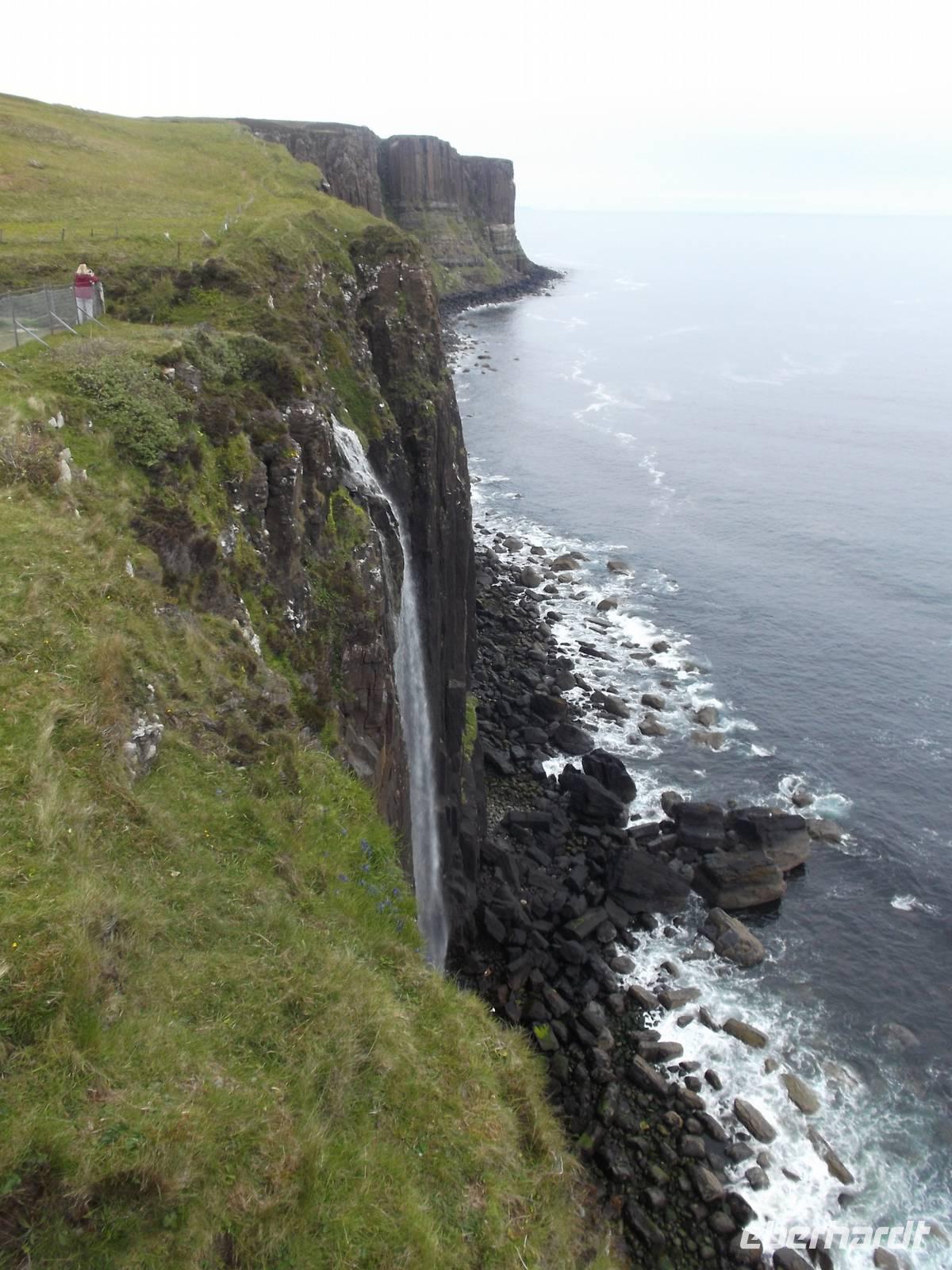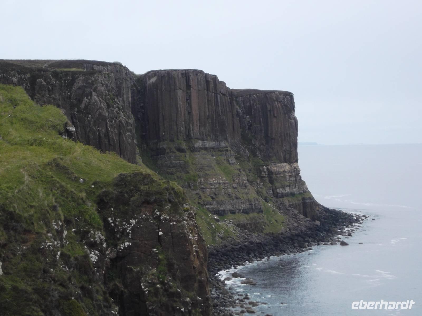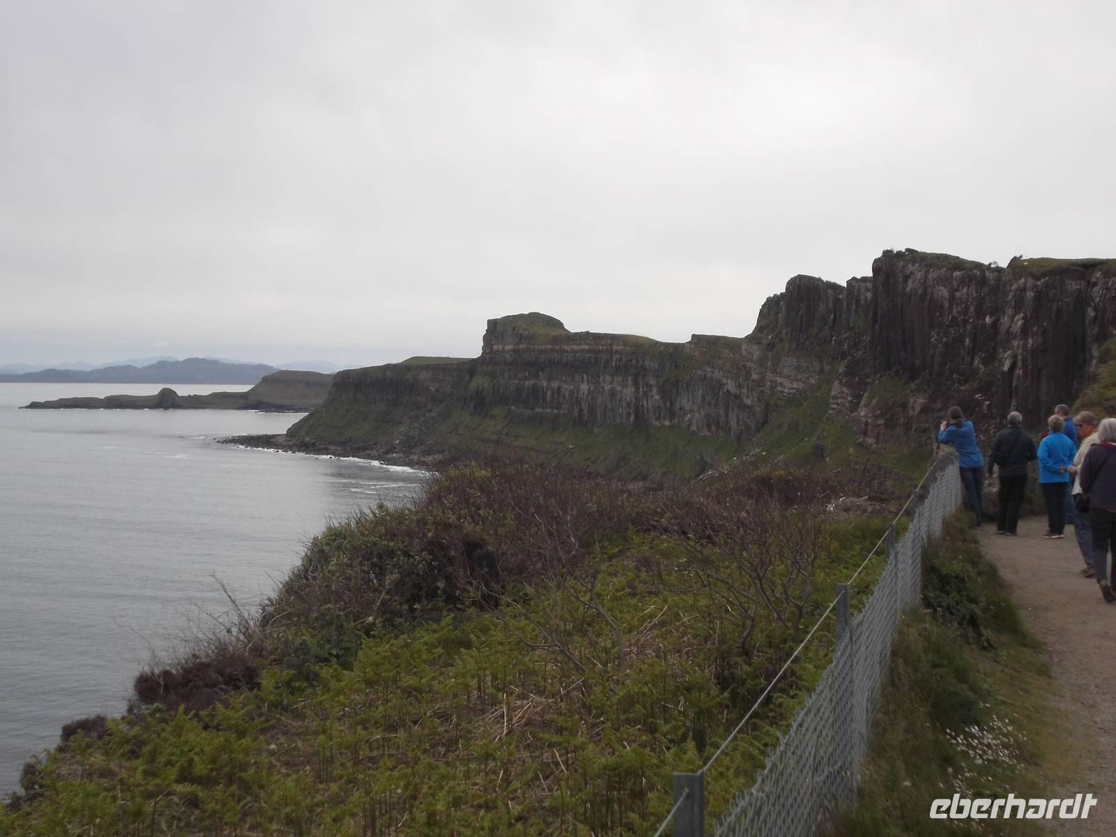 Weiter ging es zur vielleicht bekanntesten Steilküsten-Formation der Insel Skye: dem berühmten „Kilt-Rock", einer langgestreckten Lavaformation mit einem davor ins Meer stürzenden Wasserfall. Diese Felsen entstanden, als einstmals dünnflüssige Lava der damals noch tätigen Vulkane hier vor Jahrmillionen beim Erkalten dieses malerische, langgestreckte und über hundert Meter aus dem Meer aufragende Felsenparadies formten, das seinen Namen davon erhielt, dass die säulenartig erstarrte Lava an den Faltenwurf des traditionellen Schottenrocks erinnert.