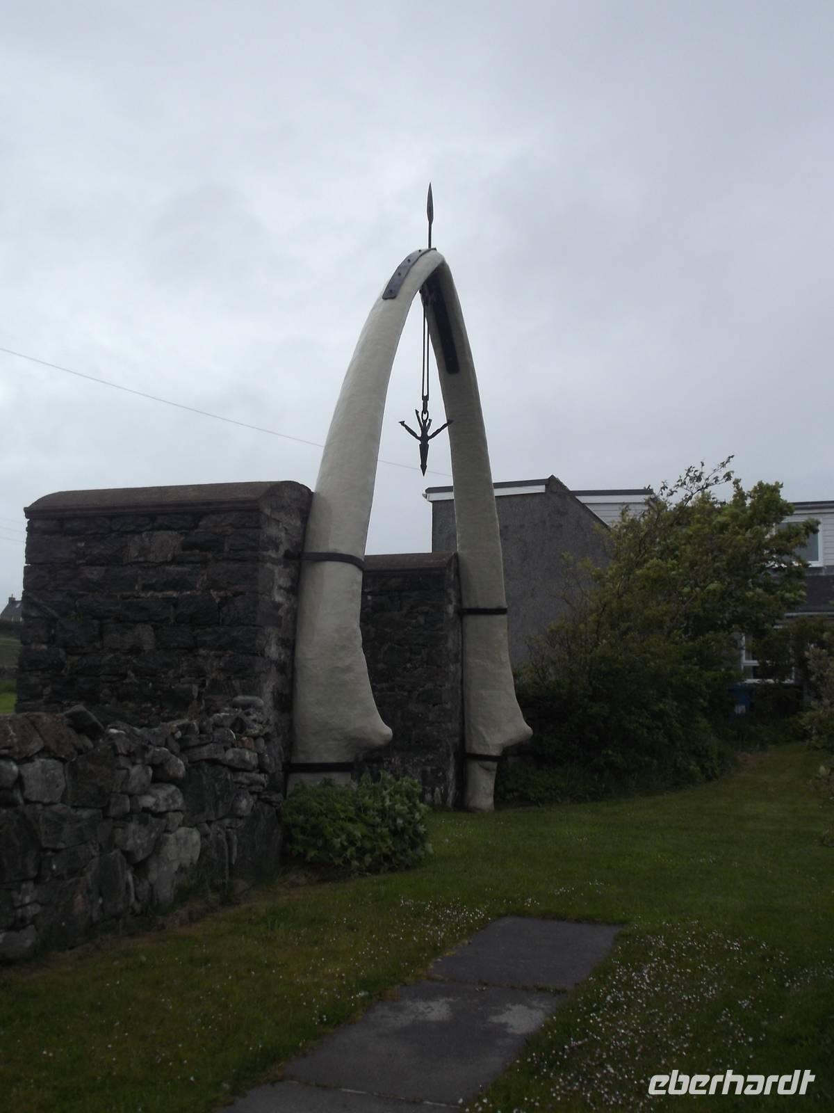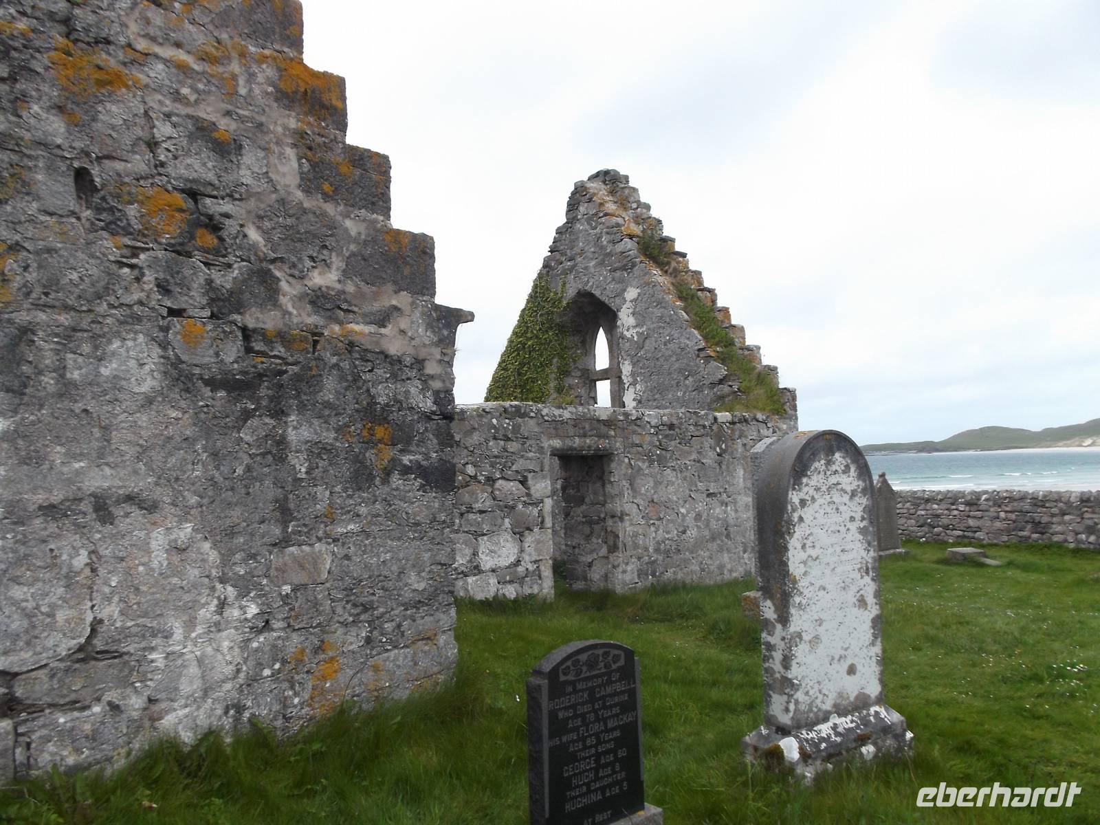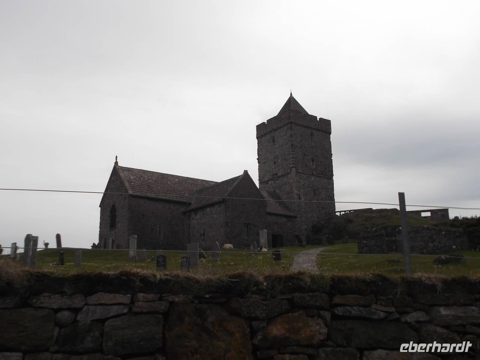 Die für ihre Schafzucht und die festen, aus Wolle gewebten Harris-Tweed-Stoffe bekannte Insel ist war mit über 400 km² fast so groß wie Usedom, mit knapp 2000 Einwohnern aber relativ dünn besiedelt. Hier gibt es verblüffend schöne Strände mit weißem Sand und kristallklarem türkisblauen Wasser, ansonsten eher Steinwüsten. Wir statteten der äußerst interessanten St.Clents-Kirche von Rogadhal an der Südspitze von Harris einen Besuch ab. Die aus dem 13. - 16. Jh. stammende Kirche hat einiges zu bieten: neben mehreren Grabmalen mit schönen Reliefs gibt es hier im Kircheninneren eine der sonst sehr seltenen steinernen Fensterfiguren des Gekreuzigten und an der Außenwand des wuchtigen Kirchturms eine Teufelsdarstellung.