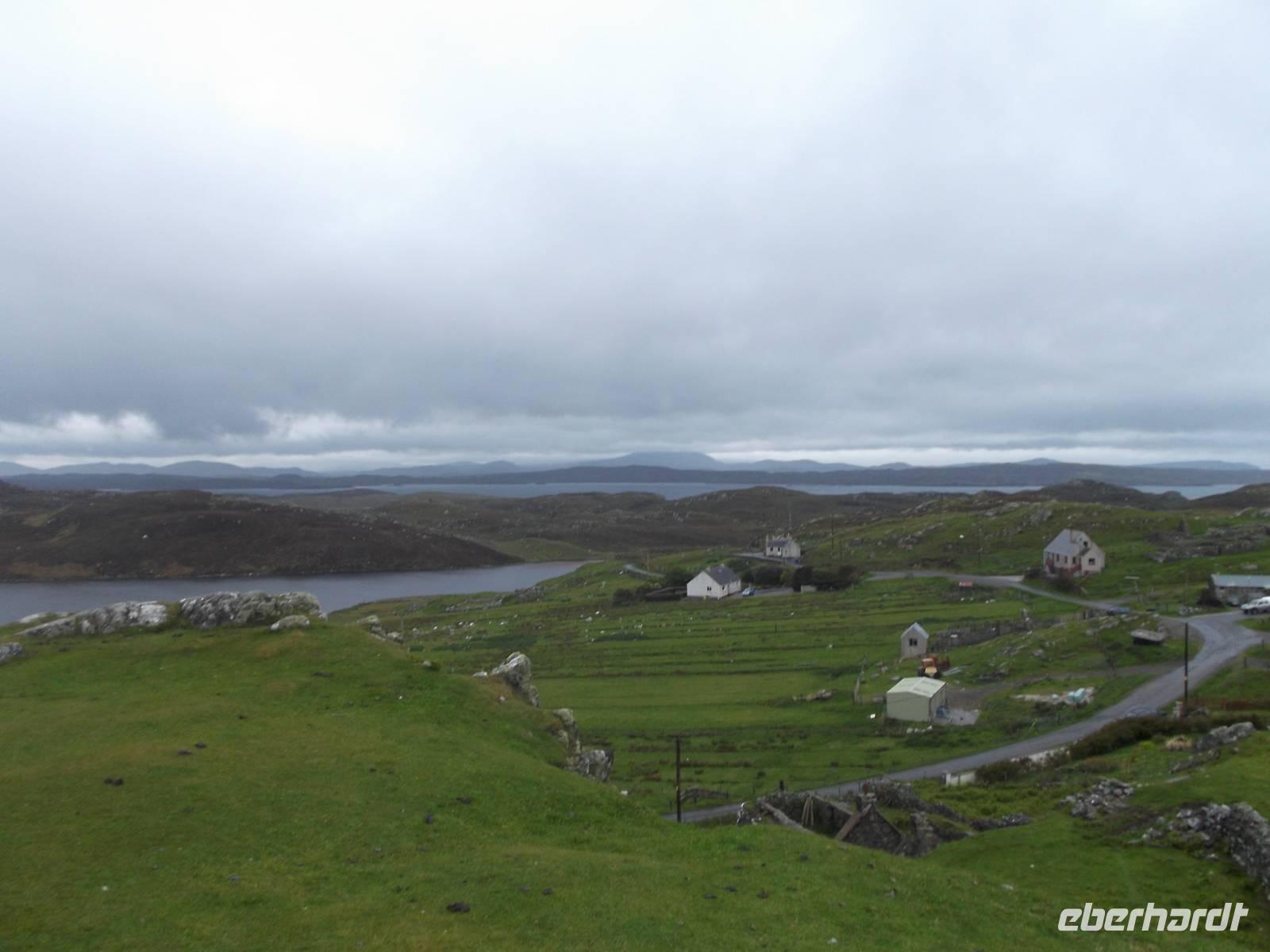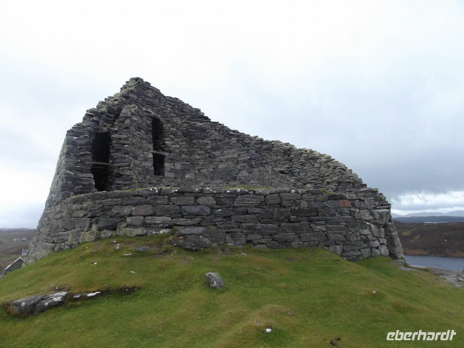 Vom malerischen Fischerdorf ging es weiter zu einem ehemaligen Clan- oder Adeligensitz. Das waren meist kegelstumpfartige Rundtürme, die man „Broch" nannte. Ihre Bauweise war ebenfalls doppelwandig, allerdings wurden hier die Hohlräume zwischen den Mauern als Gänge und Aufbewahrungsräume genutzt. Der besterhaltene dieser Türme ist der Dun Carloway Broch, der in seiner Bauart durchaus an Bauten im Mittelmeerraum wie den Nuraghen auf Sardinien und die Trulli in Süditalien erinnert..