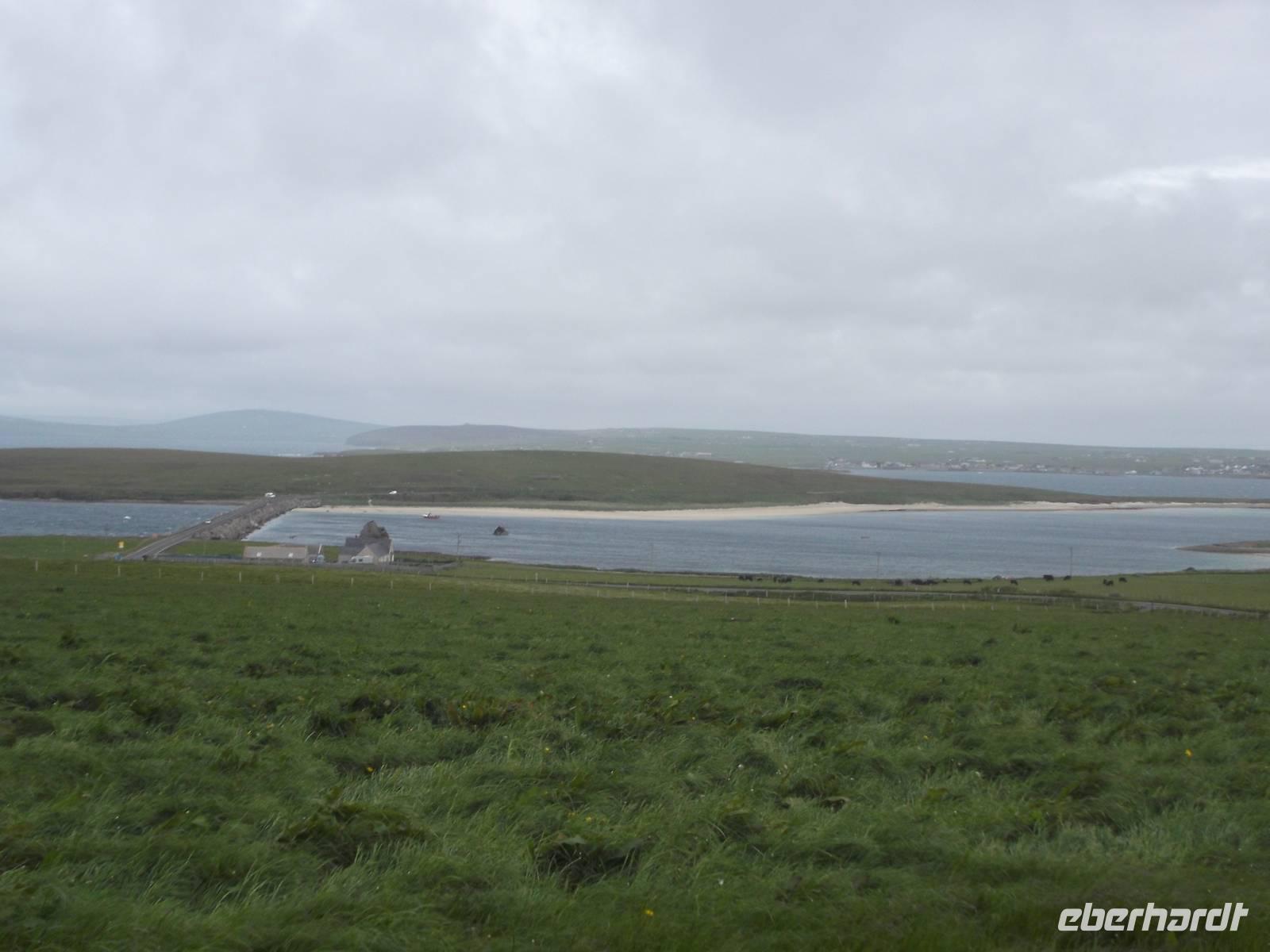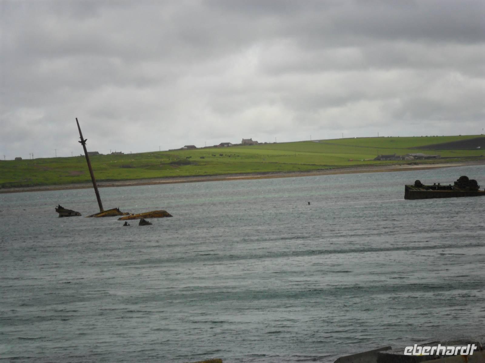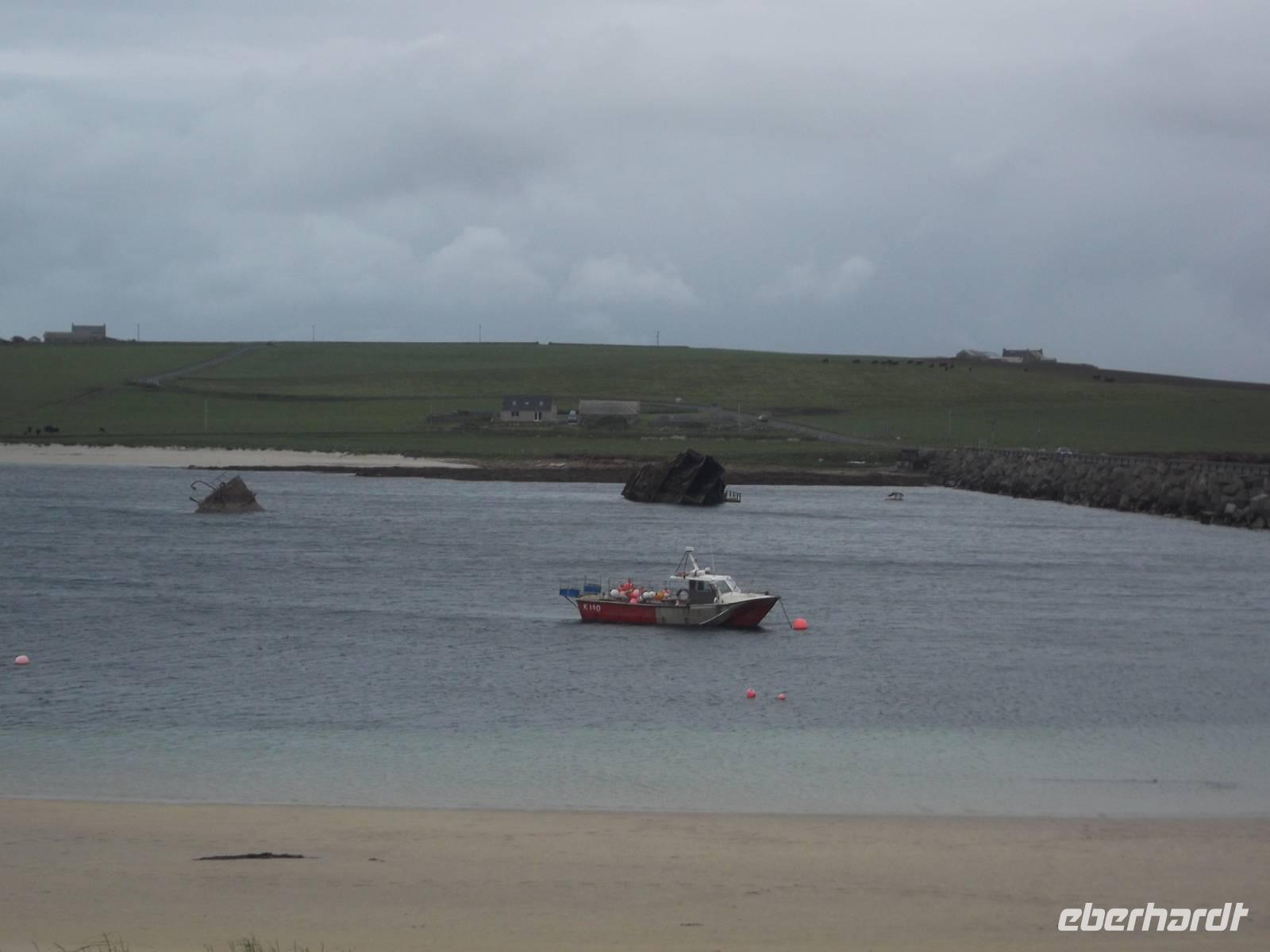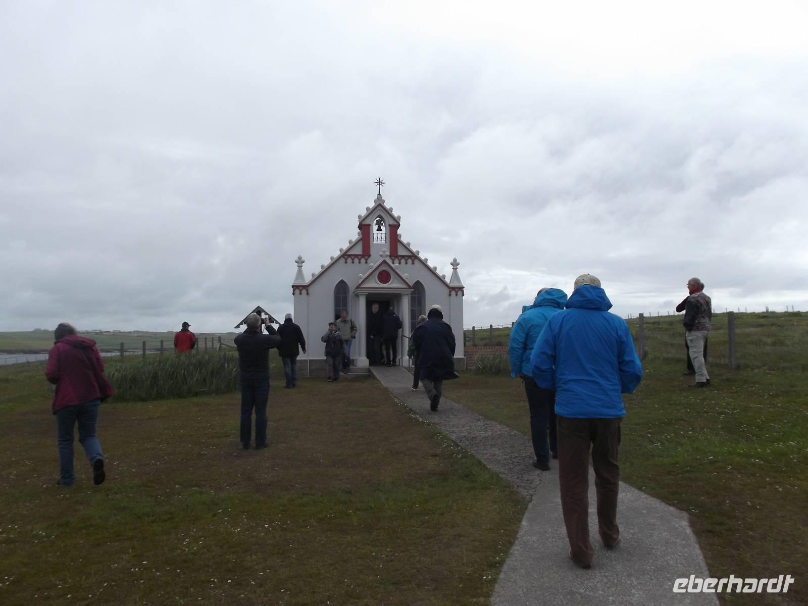 Zu Anfang unseres Programmes umrundeten wir die berühmte Bucht von Scapa Flow, die früher einer der wichtigsten Stationierungsorte der britischen Home Fleet war. In diesem riesigen, durch mehrere der umliegenden Inseln vor Stürmen und Unwetter geschützen Naturhafen wurde im ersten Weltkrieg der Hauptteil der besiegten deutschen Kriegsmarine interniert - mehr als siebzig Kampfschiffe. Am 21. Juni 1919 wurden die Orcadians, wie man die Einwohner der Orkneys nennt, Zeugen der spektakulären Selbstversenkung dieser deutschen Kriegsflotte. Wer aber vermutet, dass die beim Überqueren der die Inseln verbindenden Dammstraßen plötzlich aus dem Wasser ragenden Schiffswracks zu diesen versenkten Schiffen gehören, der irrt sich. Diese Wracks stammen aus der Zeit des zweiten Weltkriegs und sind Teile der sogenannten „Churchill Barriere". Der britische Premierminister hatte nach einem unerwarteten erfolgreichen deutschen U-Boot-Angriff, bei nach Eindringen des U-Bootes das britische Flaggschiff „Royal Oak" durch Torpedos versenkt worden war die sofortige Sperrung der Zufahrten nach Scapa Flow angeordnet. Man hatte hier zunächst alte Fracht- und Fischereischiffe als U-Boot-Sperren versenkt. Später hatten hier internierte italienische Kriegsgefangene mit dem Bau von Dämmen begonnen. Diese hatten mit Erlaubnis der Briten aus einer Wellblechbaracke in ihrem ehemaligen Lager auch eine katholische Kapelle errichtet, die heute zu den Besichtigungs-Höhepunkten der Orkneys gehört.