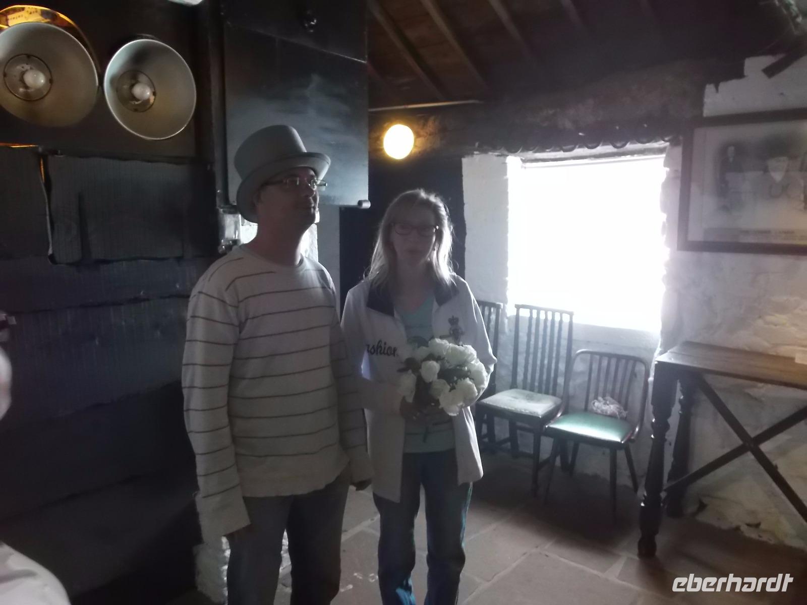 Gegen Mittag erreichten wir die englisch-schottische Grenze und legten gleich einen Stopp im Grenzort Gretna Green ein. Der erfreut sich großer Bekanntheit als Touristenziel, wegen eines eigentlich kuriosen historischen Umstandes: In der ehemaligen Schmiede des Ortes fanden früher zahlreiche „Eheschließungen auf dem Amboss" - sogenannte „Mock-weddings" - statt. Grund waren die früher unterschiedliche Gesetze in Schottland und England, die Hochzeit betreffend - in Schottland konnten junge Paare ohne Einwilligung der Eltern und noch sehr jung heiraten. Weil viele junge Liebespaare daher nach Schottland flohen, um hier heimlich zu heiraten, vollzog der Friedensrichter - im Zivilberuf der Schmied des Grenzortes - die Trauungen. Da es kein öffentliches Standesamt gab, nahm er die Zeremonie gleich in seiner Schmiede vor - er „schmiedete" zwei Liebende gleichsam zusammen, wobei noch zwei meist bezahlten Zeugen zugegen waren.