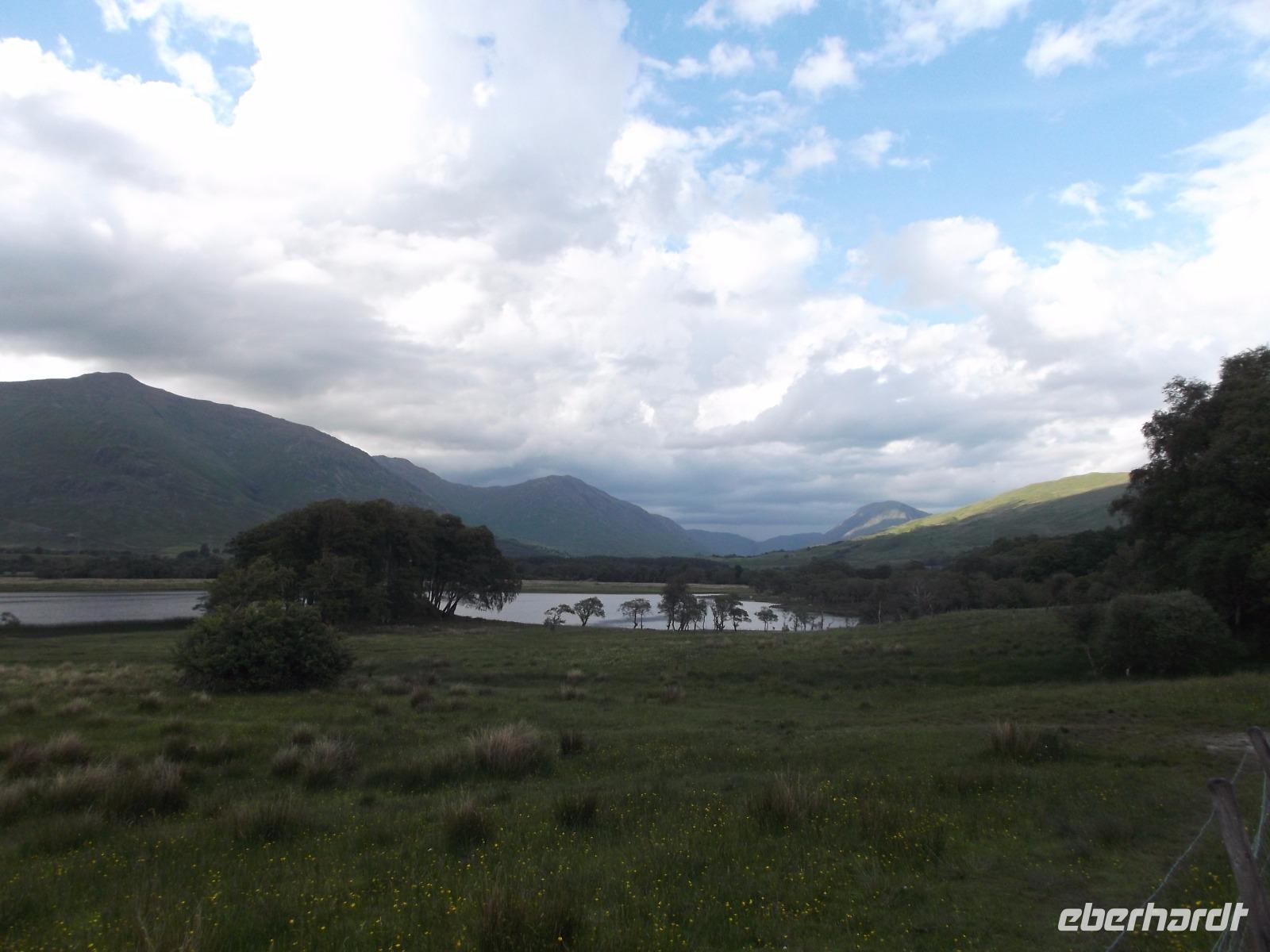 Von Gretna Green aus war es noch ein gutes Stück zu unserem Übernachtungsort, aber wir waren ja noch gar nicht komplett: sechs unserer Mitreisenden, mit dem Flugzeug nach Schottland gekommen, erwarteten uns am Flughafen Glasgow. Hier holten wir sie am Nachmittag ab und dann war die Gruppe beisammen! Auf der beeindruckenden Erskine Bridge ging es über den breiten Fluss Clyde zum vielbesungenen Loch Lomond, dem größten See Großbritanniens. Den malerischen Binnensee mit seinen vielen malerischen Inseln hatte der mit Schottland vielfältig verbundene große Romancier Theodor Fontane mal als „große noble Wasserfläche ... den König der Seen" bezeichnet. Auf einem Parkplatz an seinem Ufer machten wir einen ausgedehnten Fotostopp mit Kaffeepause.
