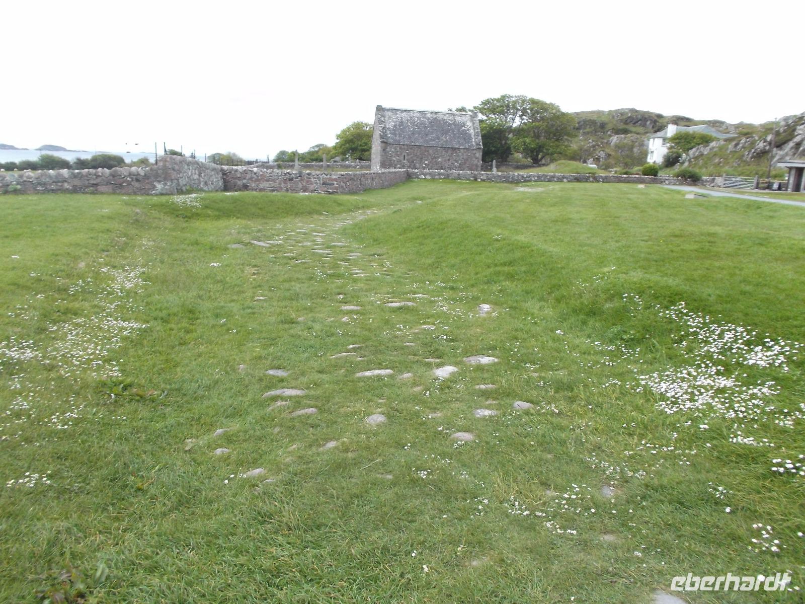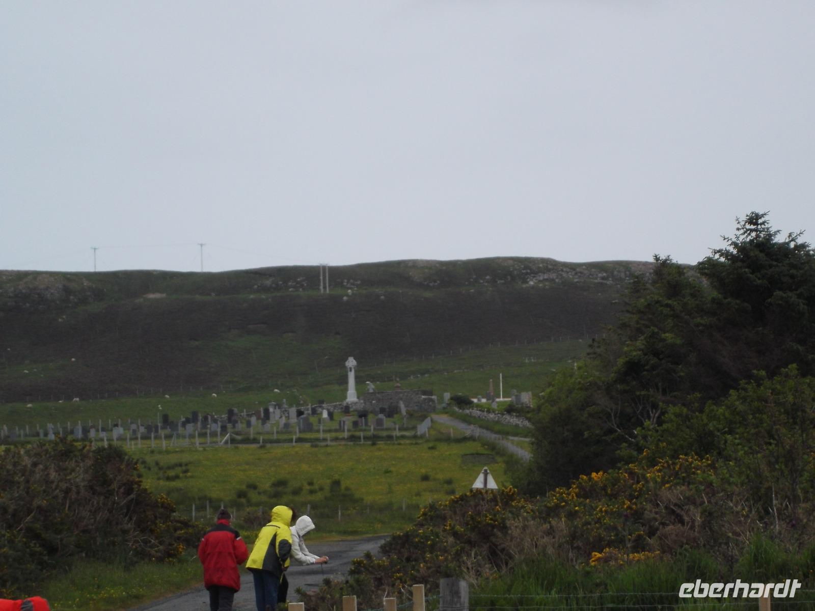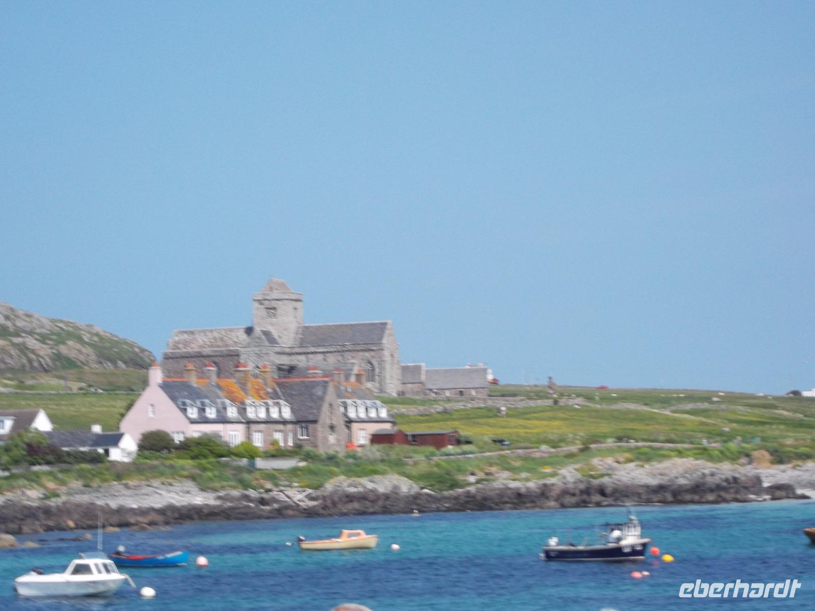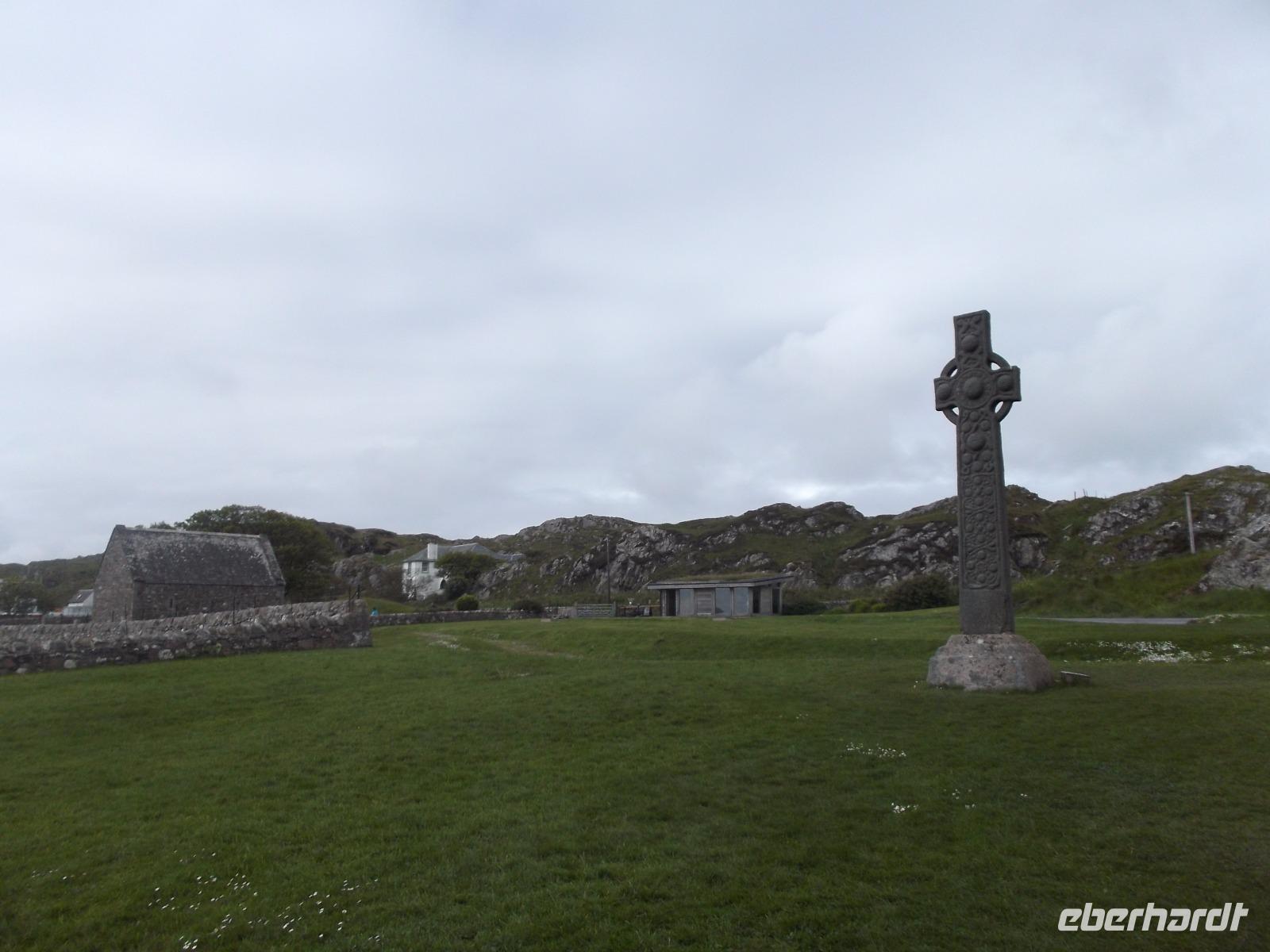 Schon recht früh - nach einem „kontinentalen" Frühstück - standen wir vor der Fähre zur Insel Mull. Nachdem ich die Tickets geholt hatte und alle durch das Terminal und über die Gangway an Bord gelangt waren, ging es los zur zweitgrößten Insel der Inneren Hebriden. Vorbei am malerisch gelegenen Duart Castle, im 16. Jh. Sitz des Clans der McLean, erreichten wir Mull und durchquerten die Insel zunächst, um zum Abfahrtsort der Fähre zur Insel Iona zu gelangen. Zur Musik der „Hebridenouvertüre" von Felix Mendelssohn-Bartholdy zogen die einsamen Landschaften der von Wiesen und Mooren bedeckten Täler und die Bergketten, dominiert vom 966 m hohen Ben More, an uns vorüber. Pünktlich kurz vor ihrer Abfahrt erreichten wir die kleine Fähre - die normalerweise nur Passagiere mitnimmt - nach und von Iona. Während der Bus im Fährhafen Fionnphort auf uns wartete, besuchten wir das nur knapp 9 km² große Eiland Iona, von dem die christliche Mission Schottland ausgegangen war. Denn einst hatte hier der Heilige Columban, der eigentlich aus Irland stammte, seine Abtei errichtet.