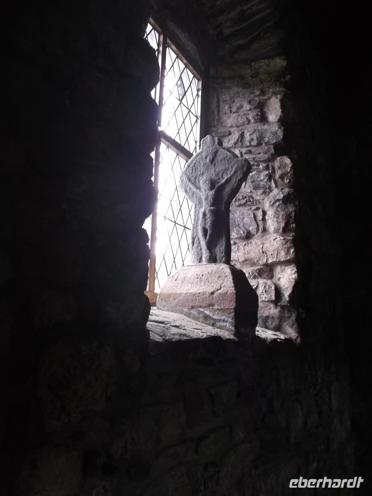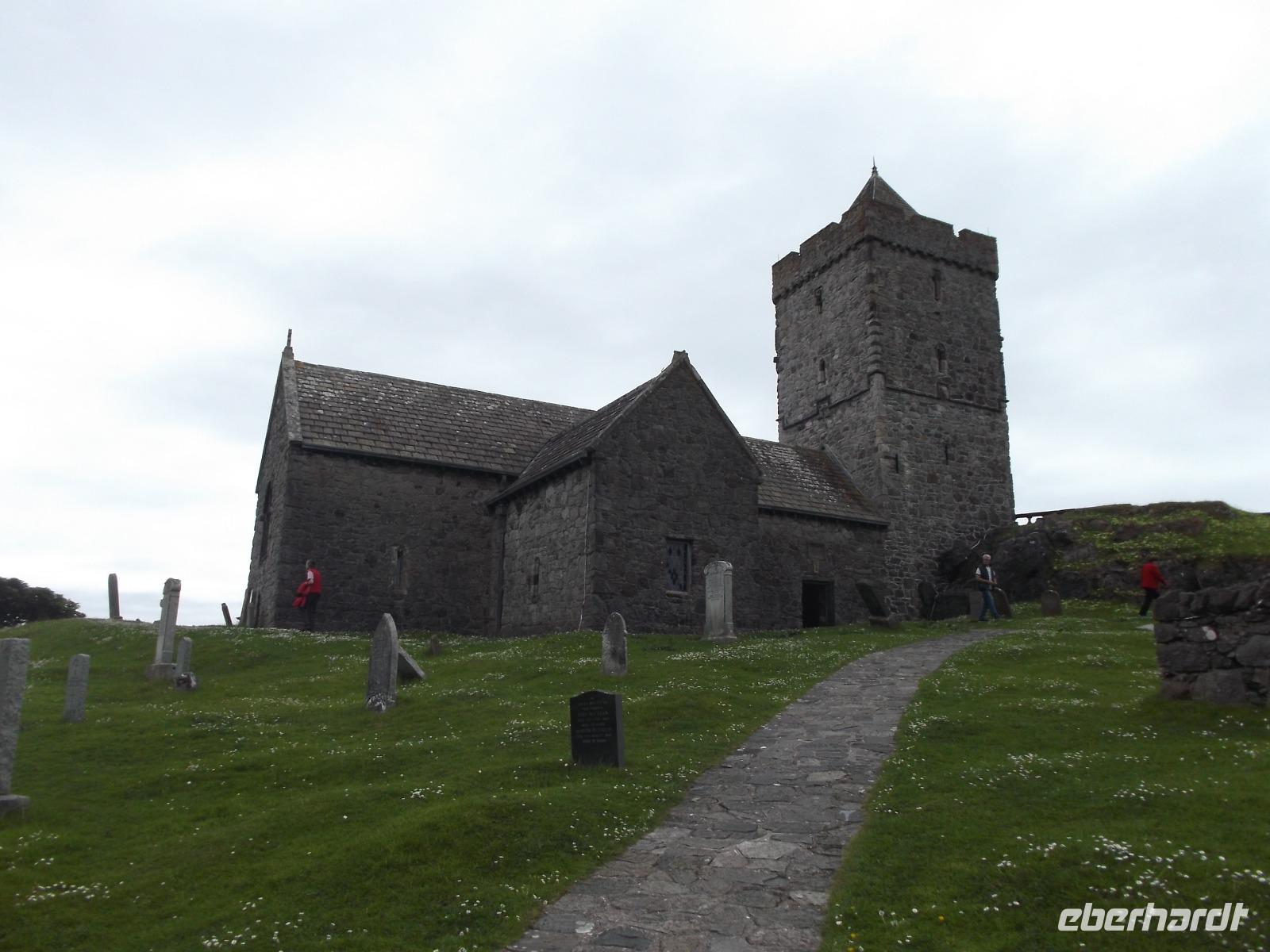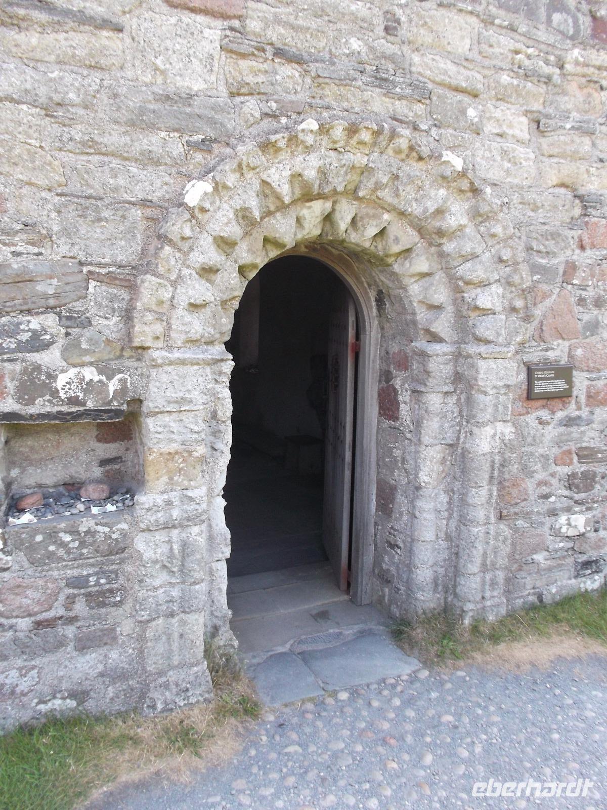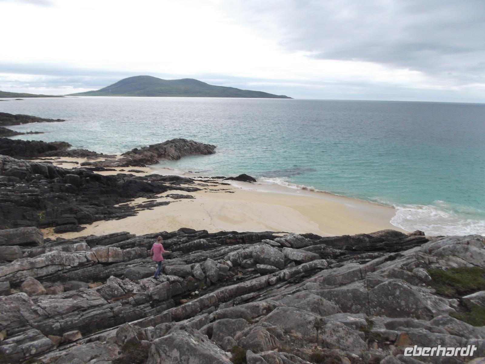 Von Callanish aus ging es - mit Fotostopp unterwegs am weit ins Land reichenden, langgestreckten fjordähnlicher Loch Seaforth - zur Nachbarinsel Harris, die landschaftlich ganz anders geartet und mit knapp 2000 Einwohnern sehr dünn besiedelt ist. Für ihre Schafzucht und die festen aus der Wolle gewebten Harris-Tweed-Stoffe sowie für verblüffend schöne Sandstrände mit schneeweißem Sand und kristallklarem türkisblauen Wasser ist Harris bekannt. Bei recht gutem Wetter konnten wir alles in uns aufnehmen und statteten schließlich der berühmten Kirche von Rogadhal an der Südspitze von Harris einen Besuch ab. St. Clement's gilt als das bedeutendste vorreformatorische Kirchengebäude auf den Äußeren Hebriden und wurde auch als Mausoleum für die Clanchiefs der McLeods genutzt. Zwei seiner skulpturierten Grabmale sowie eine geheimnisvoll wirkende und sehr seltene Fensterfigur des gekreuzigten Jesus im Inneren sowie seine Teufelsdarstellung außen am Kirchturm bilden die herausragenden Besonderheiten des Bauwerks.