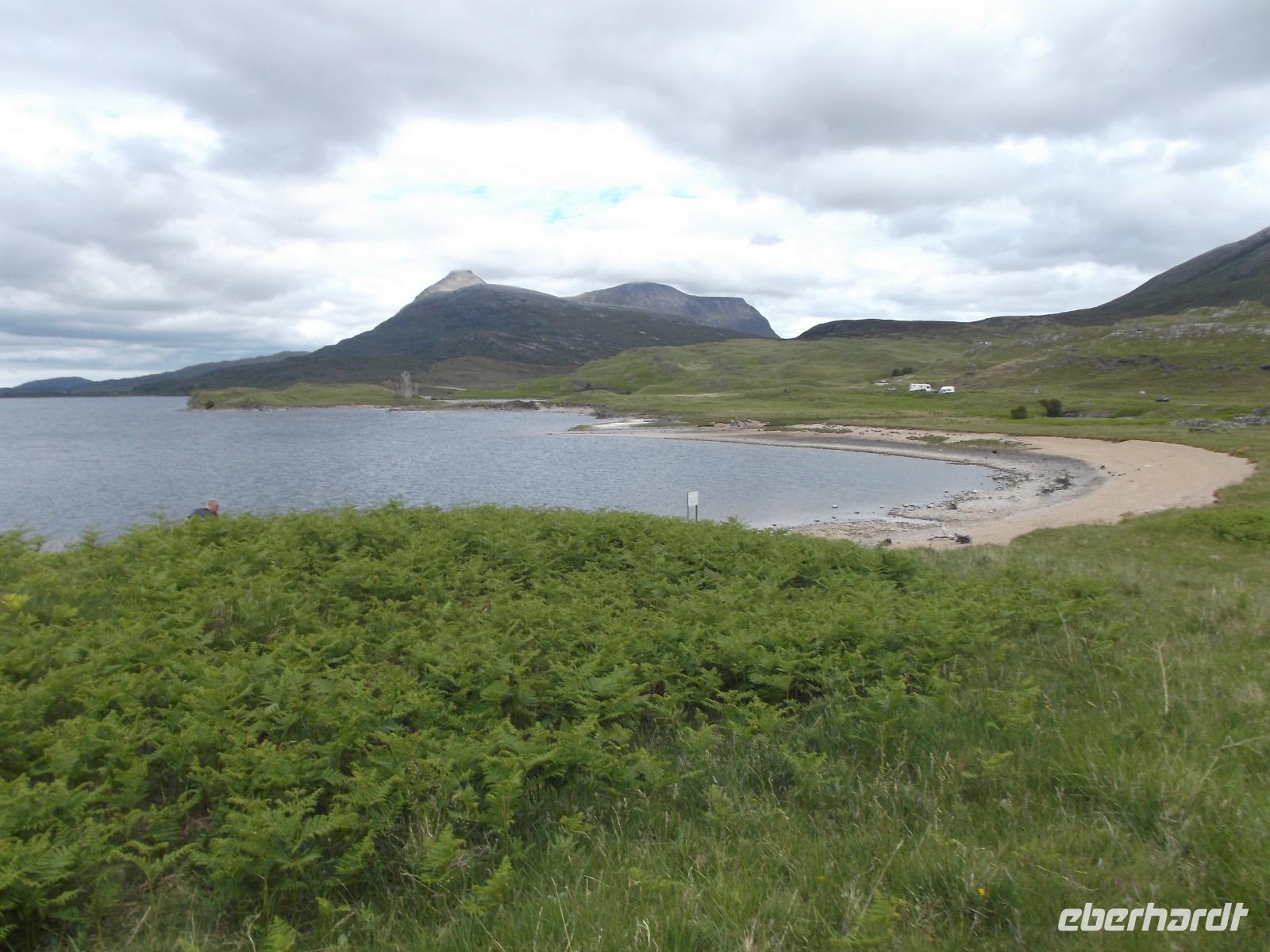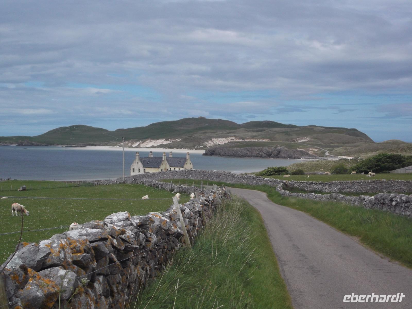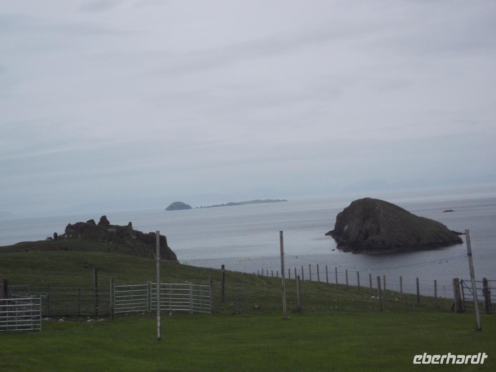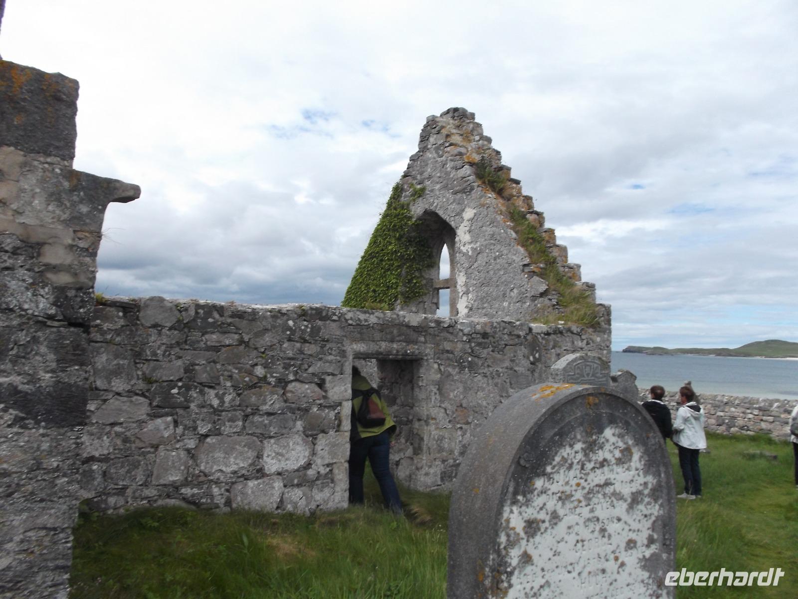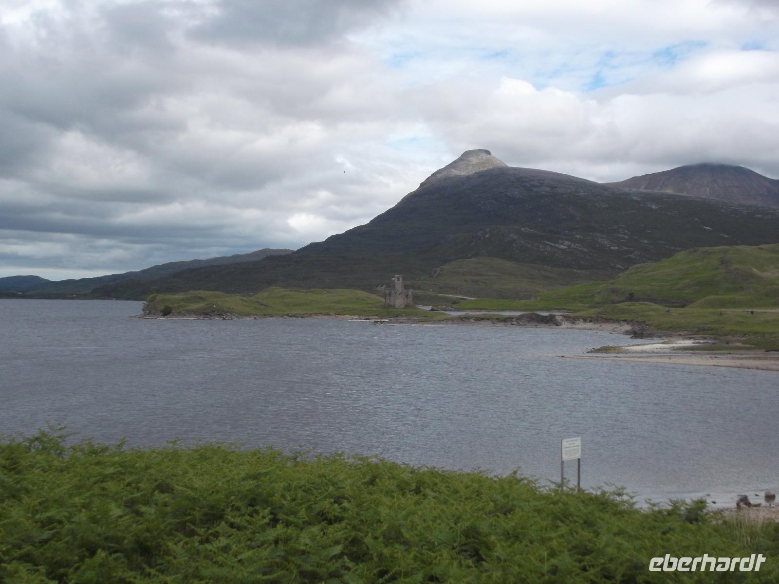 Nach zweieinhalbstündiger Überfahrt erreichten wir pünktlich Ullapool bei sich auflösendem Morgendunst. So konnten wir bei gutem Wetter den Nordwesten und Norden der schottischen Highlands genießen. Die präsentierten sich den ganzen Tag lang als Höhepunkte von Landschaft und Natur mit einer unendlichen Abfolge von Schönheiten. Wir legten Fotostopps ein an der Ruine des Ardvreck Castle und später der Brücke von Kylescu am tiefen und malerischen Fjord und hatten gegen Mittag einen längeren Stopp am Strand von Balnakeil - unweit vom nordwestlichsten Punkt der Insel Großbritannien, dem Kap Wrath. Hier besuchten wir nicht nur den Strand von Balnakeil sondern auch die malerissch gelegene Ruine des Kirchleins, das früher eines der Zentren der Christianisierung in Schottland war. Der Legende nach, die die Wichtigkeit dieser Pfarrei betont, ist die Kirche seit Jahrhunderten (obwohl schon seit langem nur noch Ruine) unmittelbar dem Heiligen Stuhl unterstellt und der Papst selbst der zuständige Geistliche.