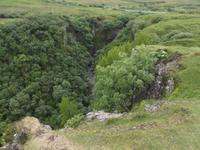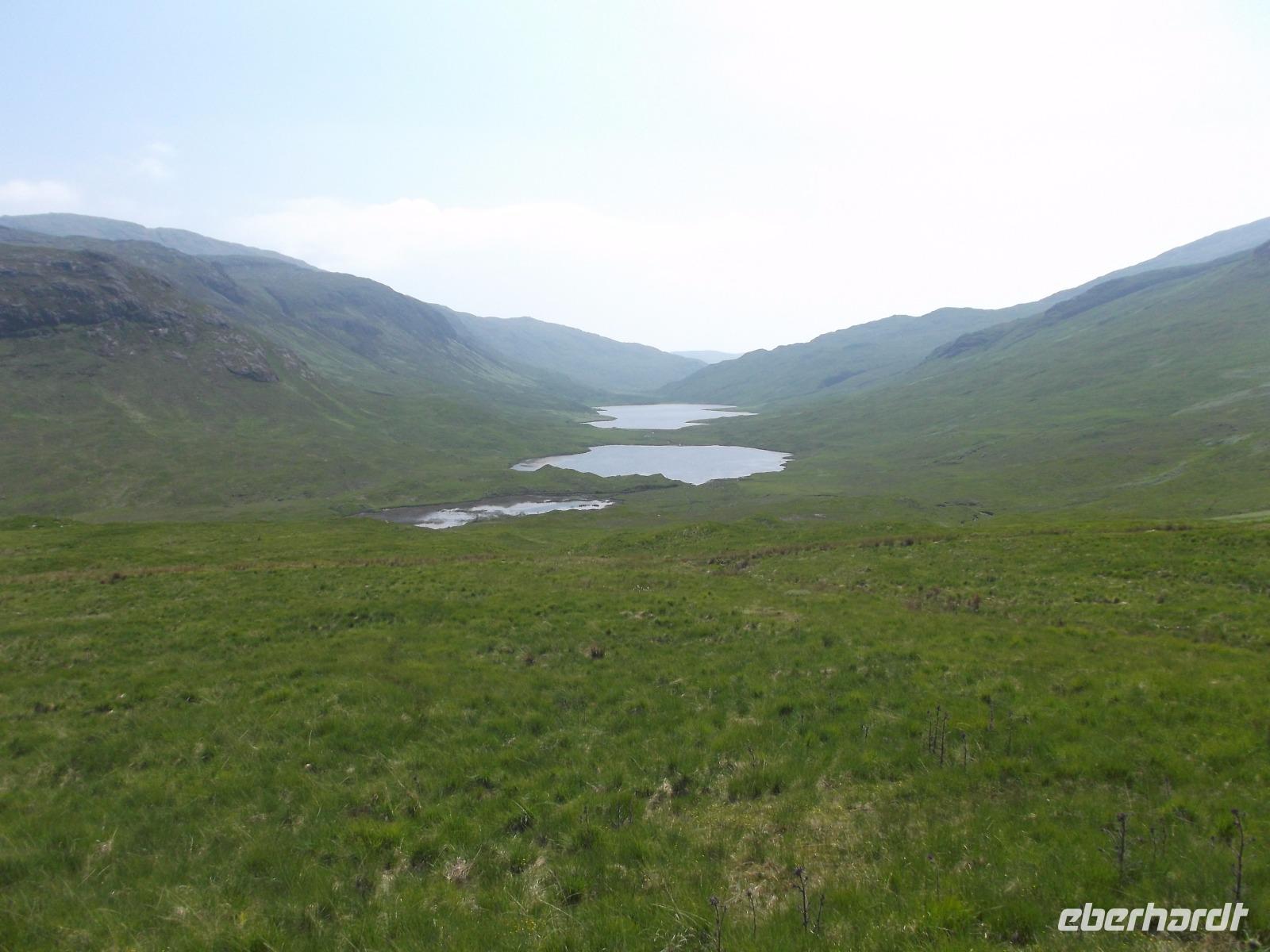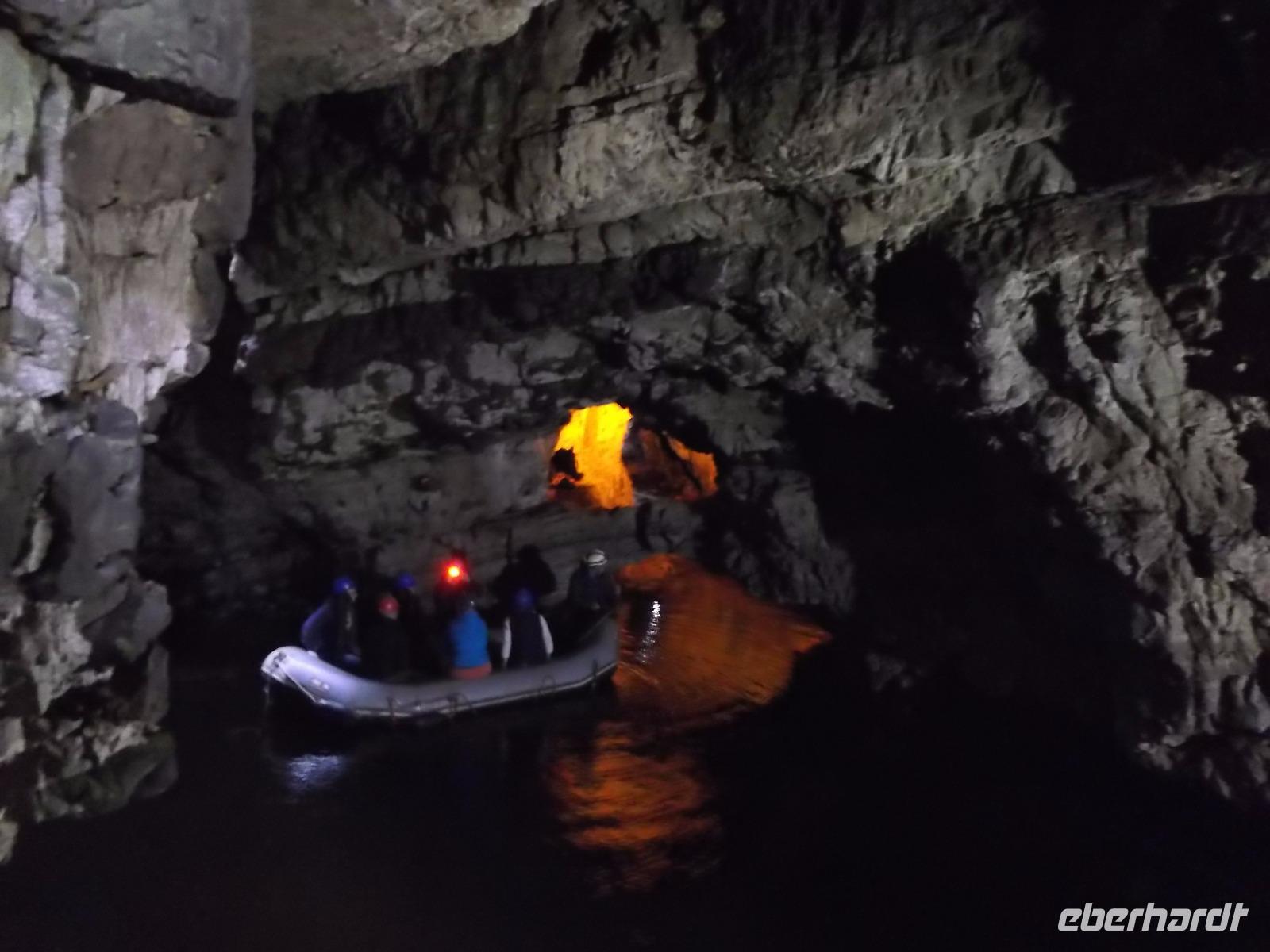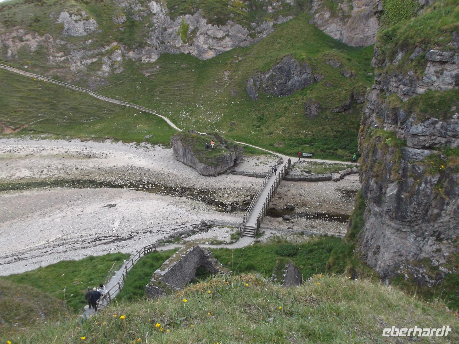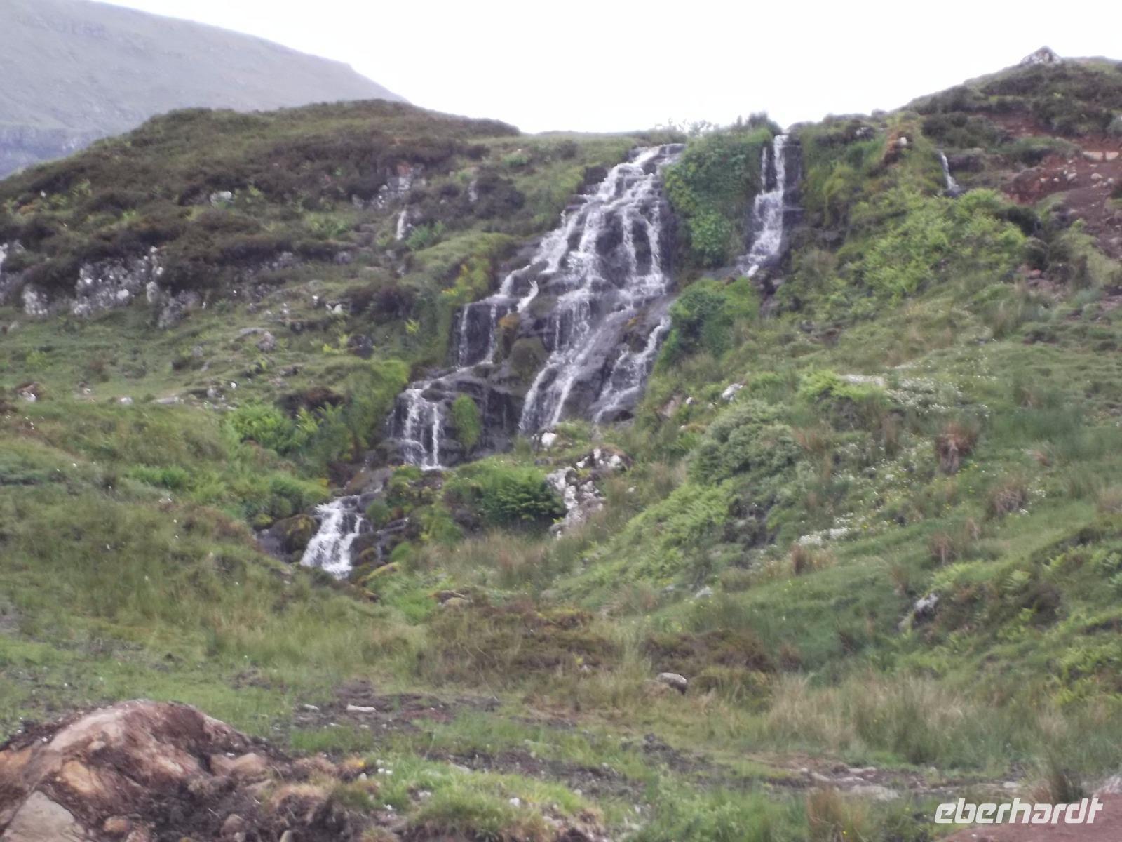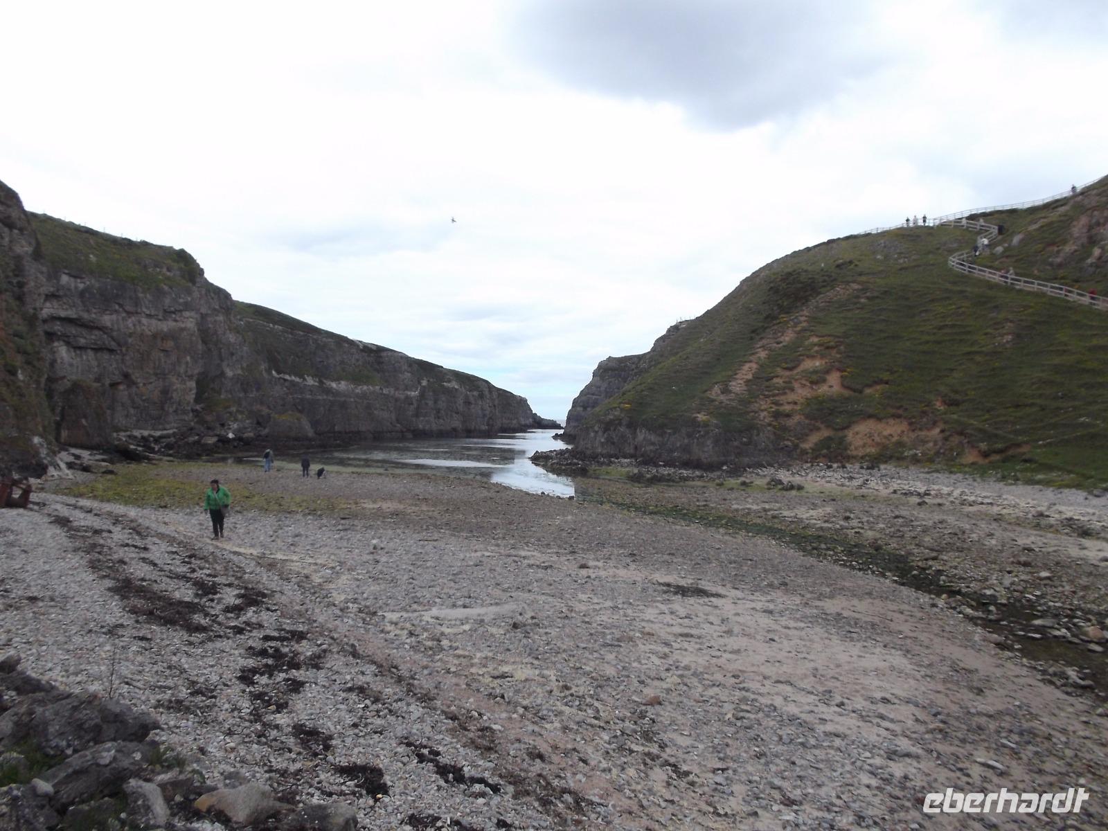 Von hier ging es weiter zu der inzwischen sehr gut ausgebauten Smoo -Cave weiter. Es ist eine Meeres und Süßwasserhöhle, relativ groß und relativ leicht zugänglich, um die sich seit Jahrhunderten Mythen und Legenden ranken. Das Kalksteinhöhlensystem, manchmal als „Eingang zur Unterwelt" apostrophiert, hat seinen Eingang etwa auf Meereshöhe. Man kann ihn über einen recht gut gangbaren Abstieg und eine Brücke erreichen. Er ist von schroffen Uferfelsen umgeben und sein Geheimnis sind die großen Höhlenkammern, in denen sich ein Süßwassersee befindet. Gespeist wird er normalerweise von einem Wasserfall, in dem sich der Bach Allt Smoo durch ein Blasloch in der Höhlendecke ergießt. Da es offenbar lange nicht geregnet hatte, führte der Bach bei unserem Besuch kein Wasser, so dass wir den Anblick des im Höhleninnern in den See tosenden Wasserfalles nicht hatten. Nach einger Zeit des Aufenthaltes und nachdem wir die knapp hundert Stufen wieder hinaufgeklettert waren, setzten wir unsere Fahrt durch die nördlichen Highlands fort.