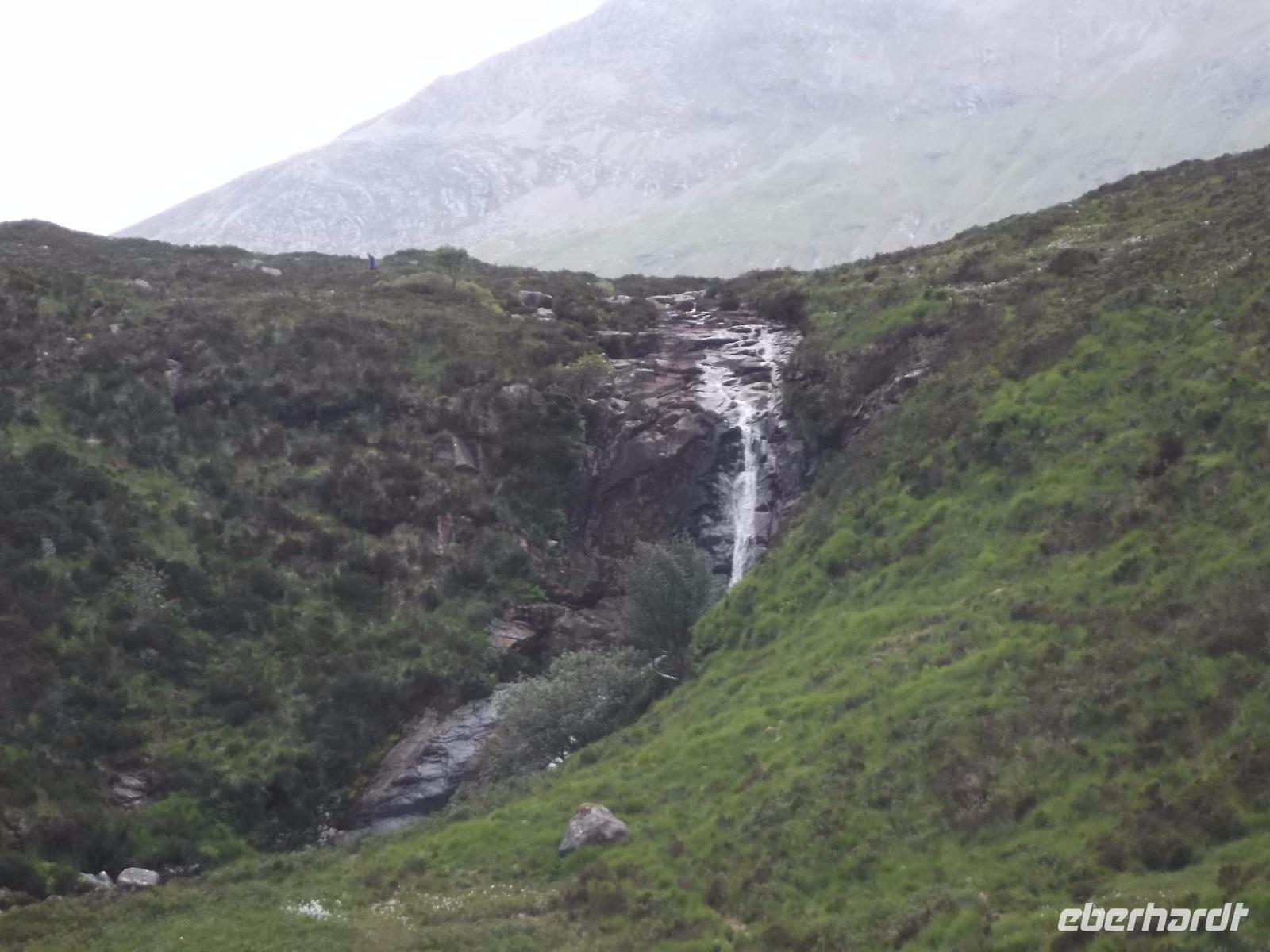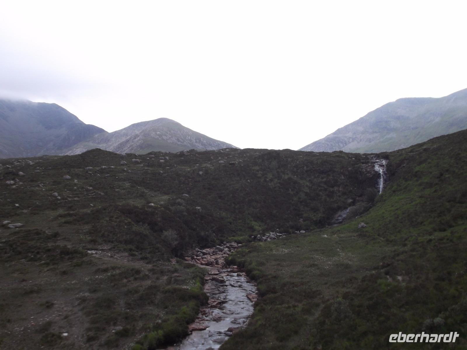 Wir waren rechtzeitig in Mallaig, um noch Zeit für einen kurzen Abstecher in den Ort zu haben und nahmen dann die Fähre nach Skye, das wir nach einer Fährüberfahrt von etwa 30 min erreichten. Wir durchquerten den Süden der größten Insel der Inneren Hebriden und gönnten uns einen Fotostopp am Ainort-Wasserfall und verbrachten dann die Mittagszeit in der Inselhauptstadt Portree. Die kleine Hafenstadt mit ihrem Marktplatz, vor allem aber ihren buntbemalten Häusern rund um die Hafenbucht ist ein oft und gern gezeigtes Fotomotiv. Auch wenn das Wetter es nicht ganz so gut mit uns meinte wie am gestrigen Tag konnten wir in der freien Zeit das Städtchen ganz gut kennenlernen. Neben seinem Markt mit dem kleinen historischen Marktkreuz gehört vor allem der Aussichtspunkt über den Hafen zu den Attraktionen.
