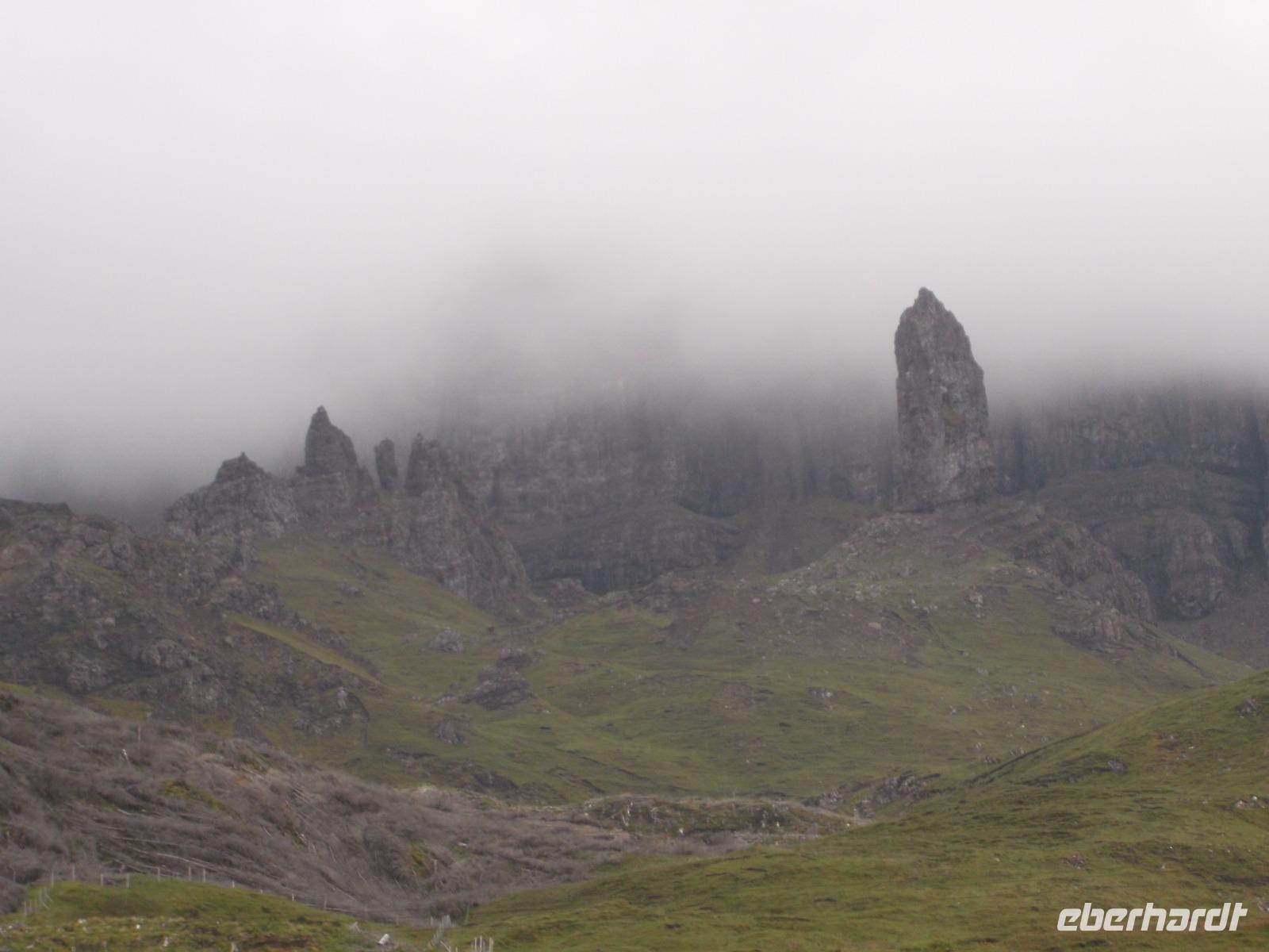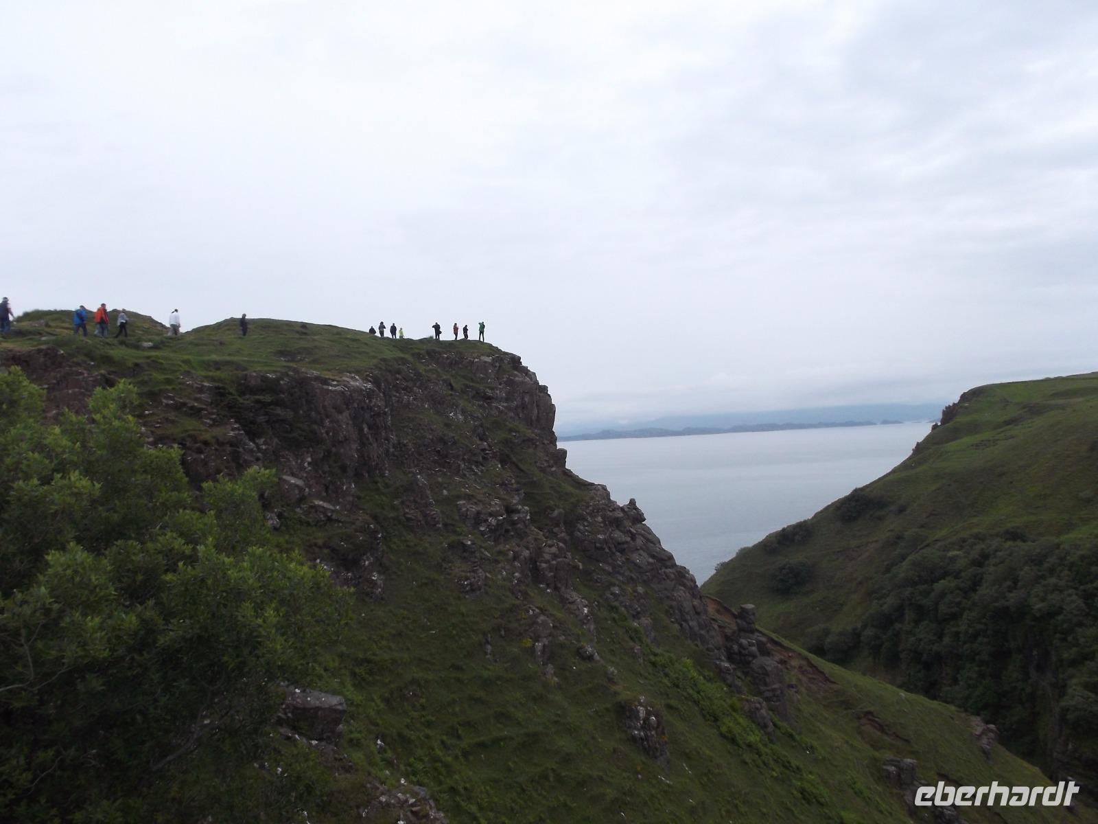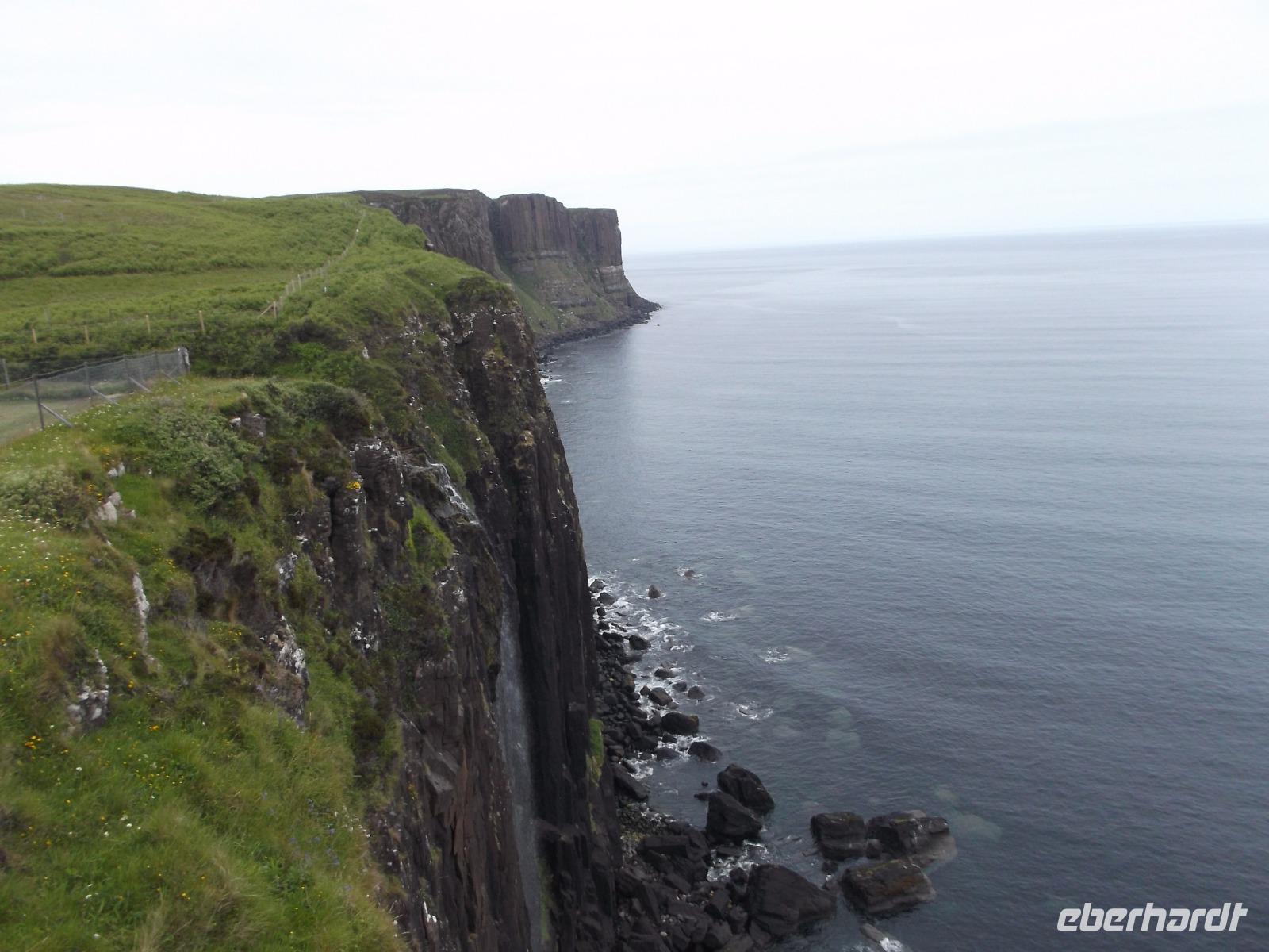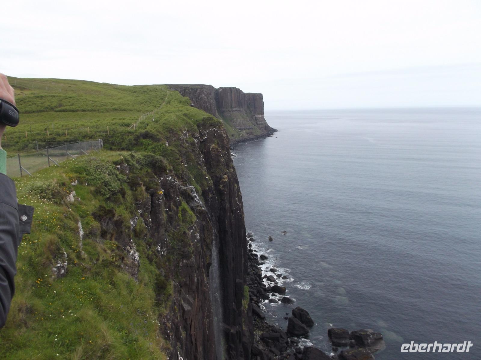 Nach etwas Aufenthalt hier erreichten wir wiederum den Inselhauptort Portree, in dem wir zwar gestern schon gewesen waren, wo wir aber auch heute etwas Zeit verbrachten, denn unsere Fähre zu den Äußeren Hebriden ging erst am Abend. Später brachte uns der Bus nach Norden, entlang dem Storr-Gebirge, wo wir einen Fotostopp mit Blick zur Felsnadel des „Old Man of Storr" einlegten, einem seltsam geformten Felsen. Er ragt etwa fünfzig Meter hoch bemerkenswert aus dem Mittelgebirge heraus und ist eines der beliebtesten Fotomotive der auch sonst außerordentlich malerischen Hebrideninsel Skye. An der Steilküste, die wir bald darauf erreichten, gab es einen weiteren Stopp an den Klippen und am Flusstal mit kleinen Wasserfällen, den „Lealt Falls". Es folgte die wohl berühmteste Steilküsten-Formation der Insel, das berühmten Felsengebiet von „Kilt-Rock" und einem davor ins Meer stürzenden Wasserfall. Hier lässt sich die vulkanische Vergangenheit der Insel gut erkennen: einstmals formten die Eruptionen tätiger Vulkane vor Jahrmillionen diese markante Felsenszenerie, als dünnflüssige Lava hier - wohl durch Kontakt mit dem Meer - plötzlich erkaltete und stangenförmig erstarrte. Diese hunderte Meter aus dem Meer aufragendem Vulkanklippen gelten neben dem „Old Man of Storr" als bekannteste Sehenswürdigkeiten der Halbinsel Trotternish, des nordöstlichen Teils von Skye.
