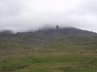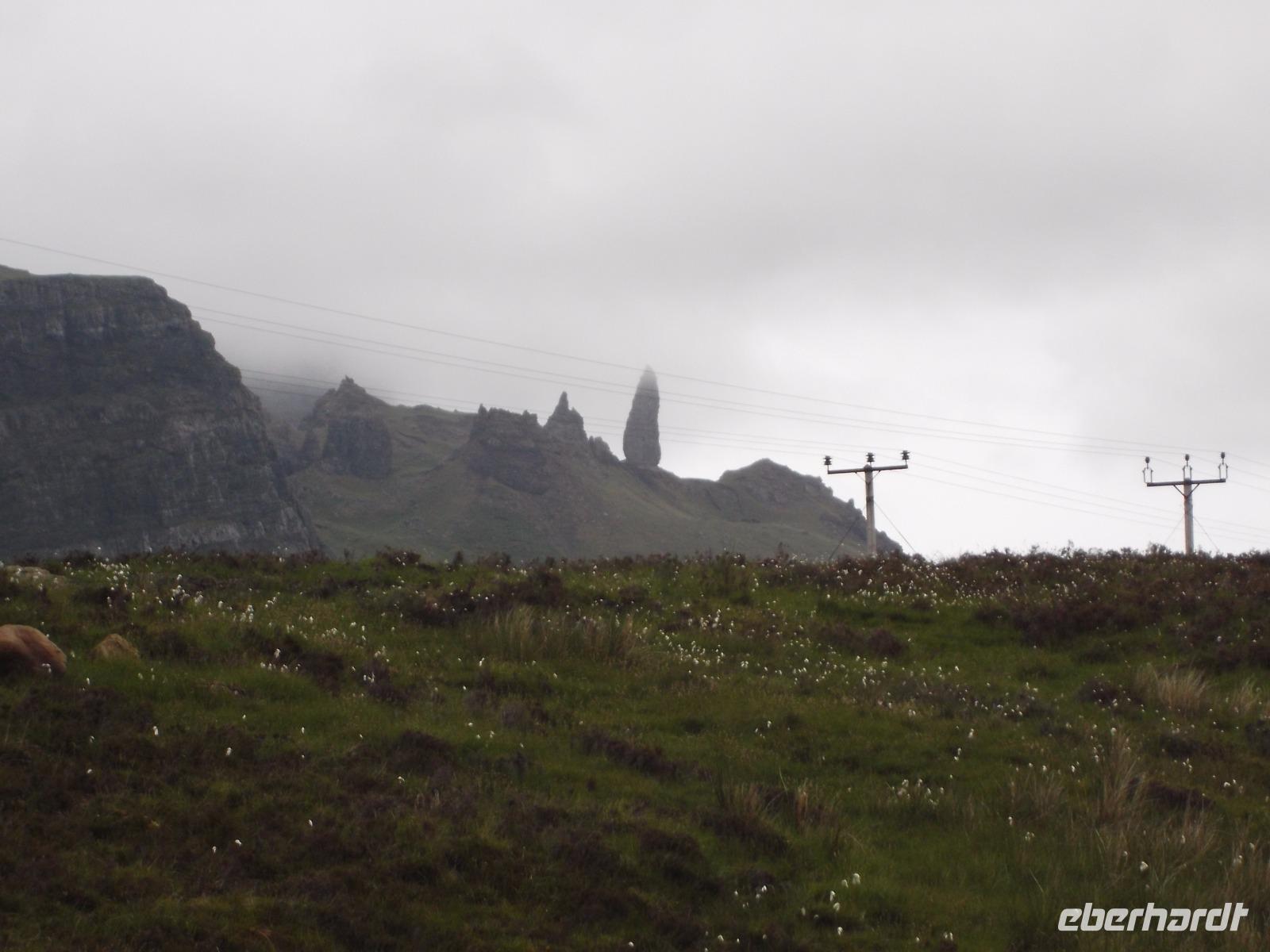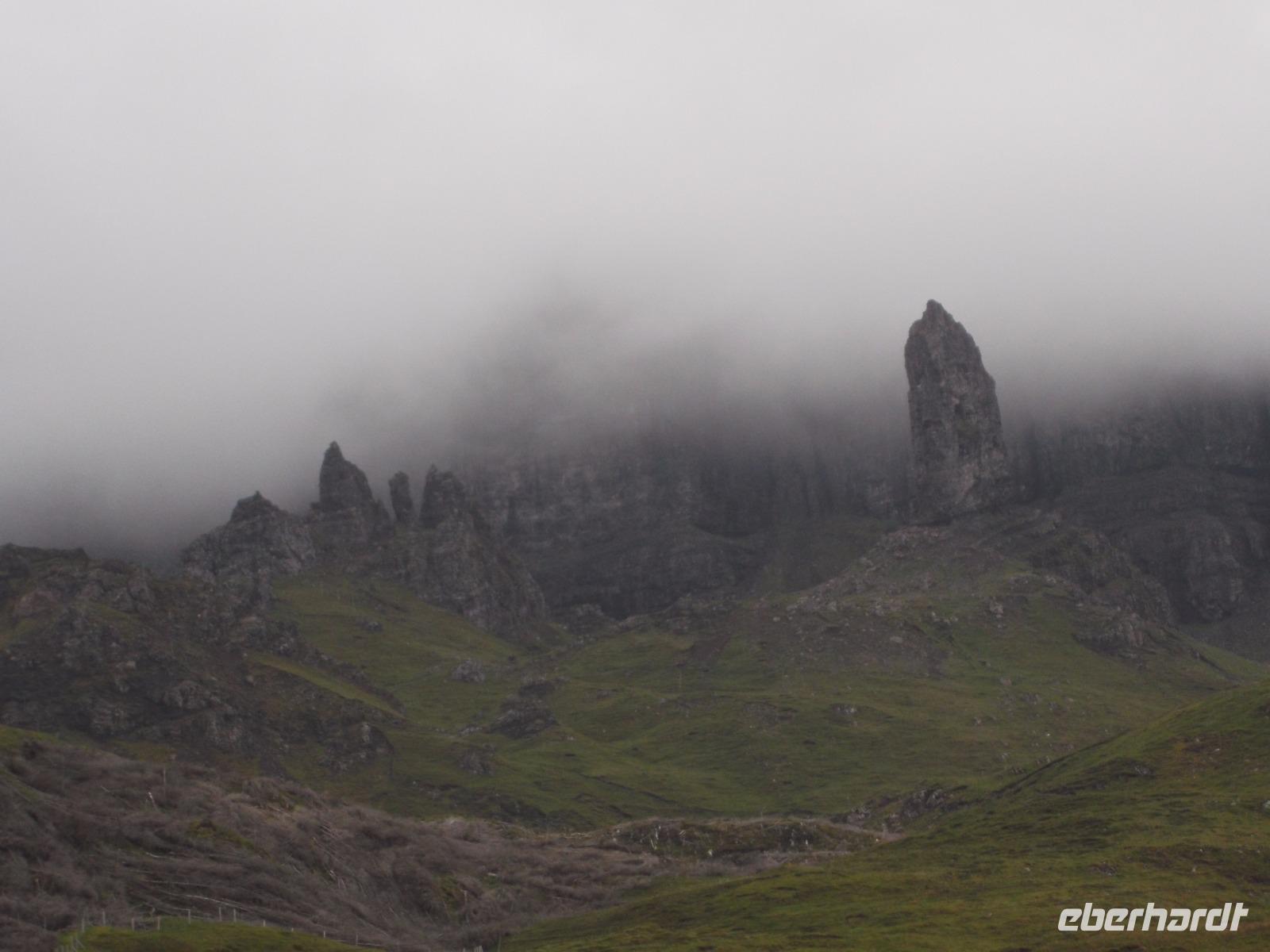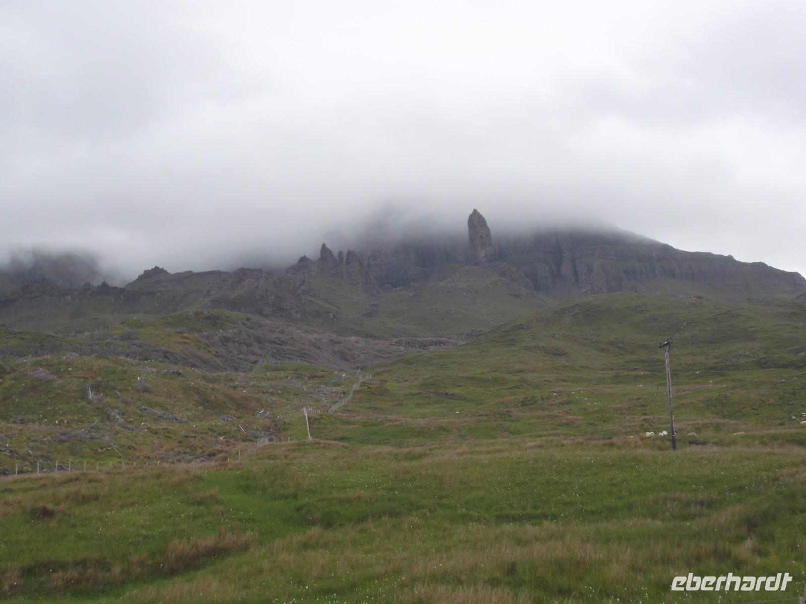 Nach etwas Aufenthalt hier erreichten wir wiederum den Inselhauptort Portree, in dem wir zwar gestern schon gewesen waren, wo wir aber auch heute etwas Zeit verbrachten, denn unsere Fähre zu den Äußeren Hebriden ging erst am Abend. Später brachte uns der Bus nach Norden, entlang dem Storr-Gebirge, wo wir einen Fotostopp mit Blick zur Felsnadel des „Old Man of Storr" einlegten, einem seltsam geformten Felsen. Er ragt etwa fünfzig Meter hoch bemerkenswert aus dem Mittelgebirge heraus und ist eines der beliebtesten Fotomotive der auch sonst außerordentlich malerischen Hebrideninsel Skye. An der Steilküste, die wir bald darauf erreichten, gab es einen weiteren Stopp an den Klippen und am Flusstal mit kleinen Wasserfällen, den „Lealt Falls". Es folgte die wohl berühmteste Steilküsten-Formation der Insel, das berühmten Felsengebiet von „Kilt-Rock" und einem davor ins Meer stürzenden Wasserfall. Hier lässt sich die vulkanische Vergangenheit der Insel gut erkennen: einstmals formten die Eruptionen tätiger Vulkane vor Jahrmillionen diese markante Felsenszenerie, als dünnflüssige Lava hier - wohl durch Kontakt mit dem Meer - plötzlich erkaltete und stangenförmig erstarrte. Diese hunderte Meter aus dem Meer aufragendem Vulkanklippen gelten neben dem „Old Man of Storr" als bekannteste Sehenswürdigkeiten der Halbinsel Trotternish, des nordöstlichen Teils von Skye.