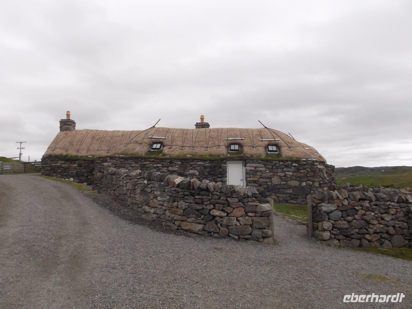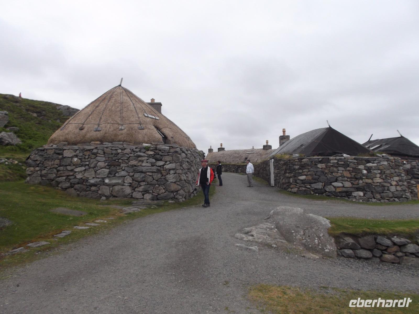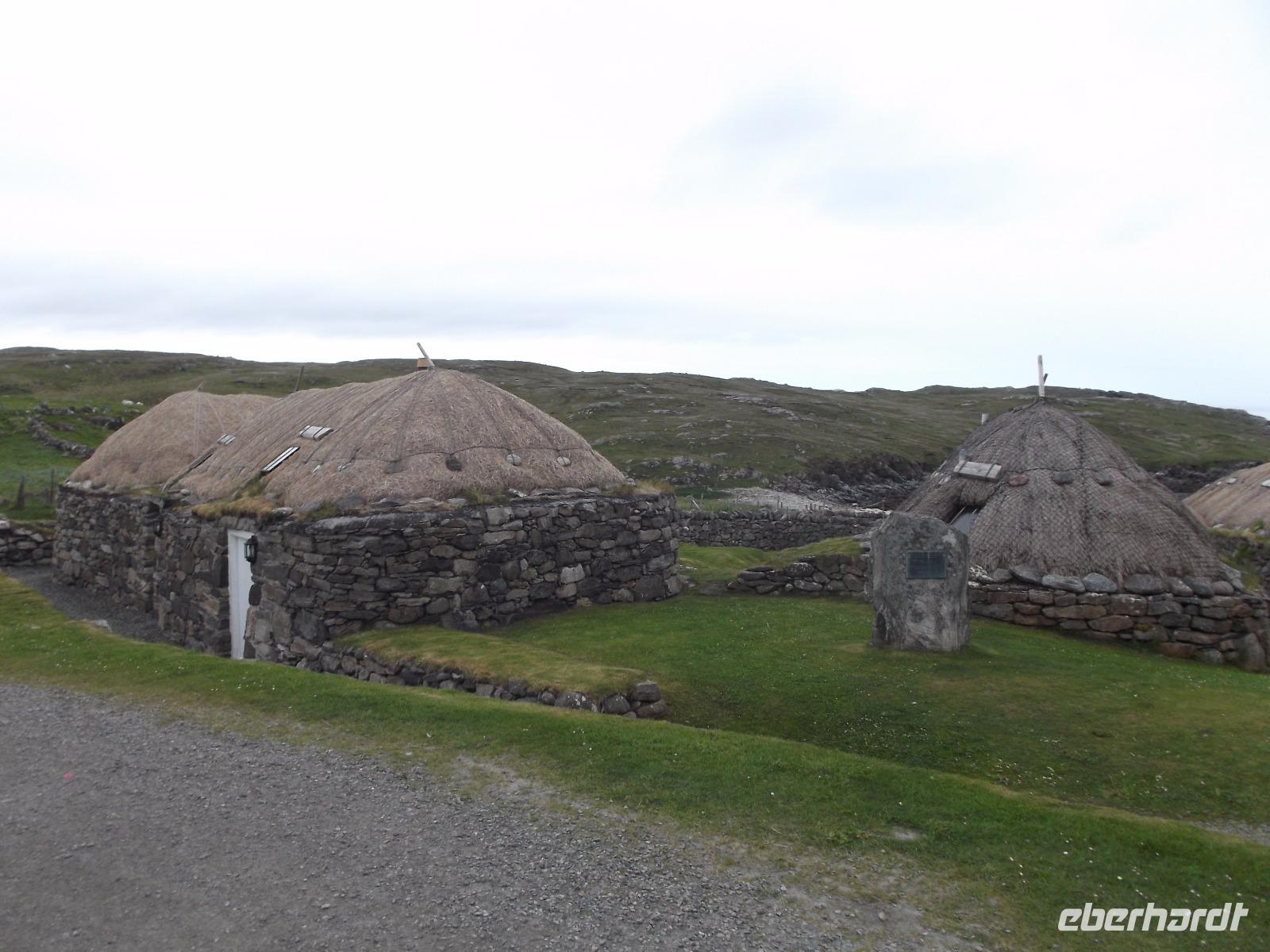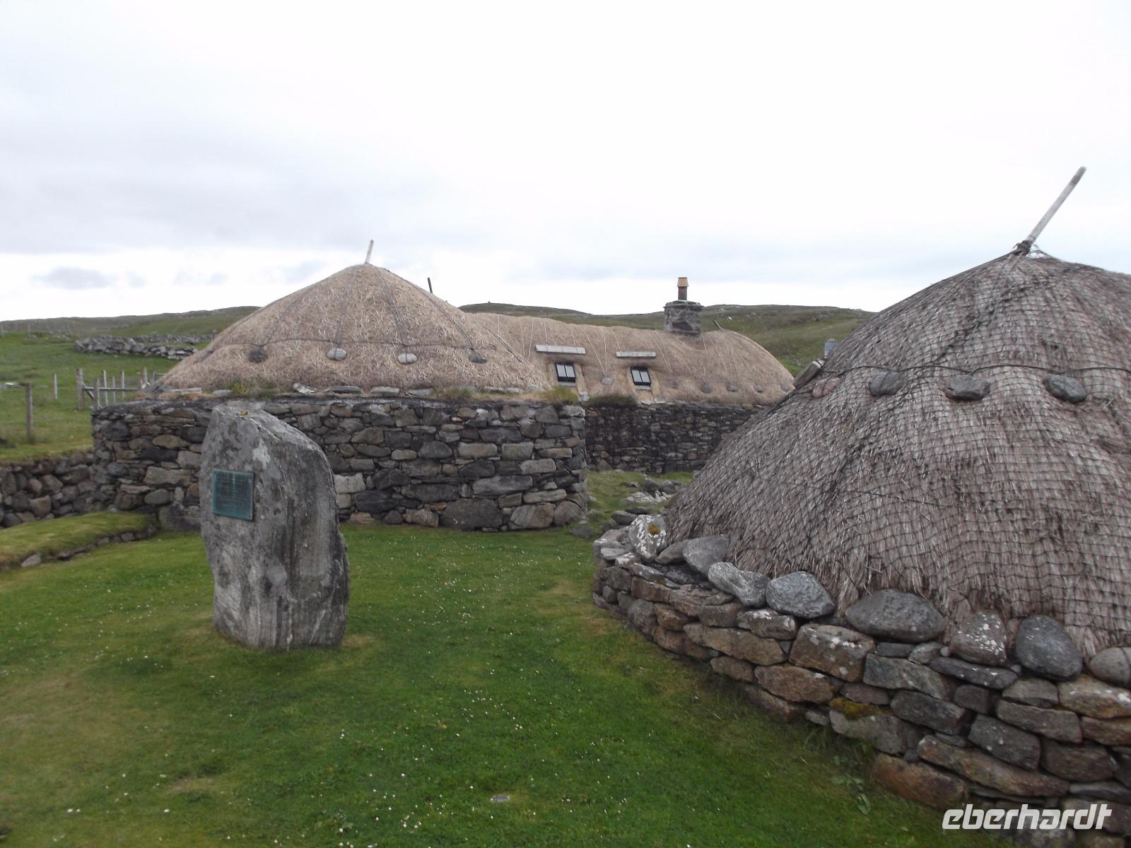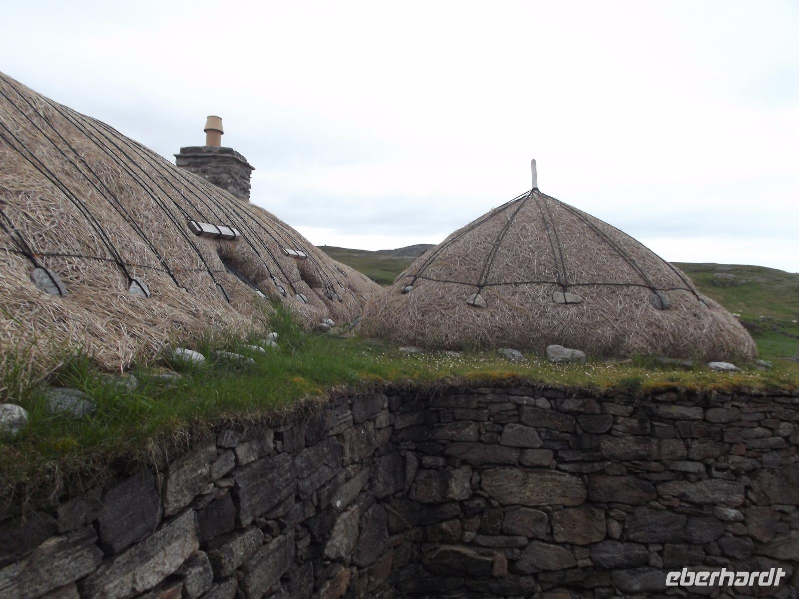 Lewis trägt, trotz seines rauhen Klimas, zahlreiche Spuren prähistorischer und mittelalterlicher Besiedlung. Wir begannen unsere heutige Rundfahrt hier im Norden und folgten einer Art Rundweg von der Inselhauptstadt Stornoway aus. Nach einem Fotostopp am „Whalebone Archway", dem originellen Hauseingang aus dem Kiefer eines Blauwals, statteten wir dem Hebridendorfes An Gerannean einen Besuch ab. Die alte Fischersiedlung besteht aus (restaurierten) Hebriden-Hütten, sogenannten „Blackhouses" und liegt direkt am Ozean. Der einst für nahezu alle Hebridendörfer traditionelle Haustyp wurde auf den Inseln, im Norden Schottland bis hin nach Irland verwendet. Ursprünglich lebten Menschen und Haustiere, nur durch eine Wand getrennt, unter einem Stroh- oder Grasdach zusammen. Auf Trockenmauerwerk, das mit Gras und Moos abgedichtet wurde, legte man hölzerne Dachbalken und bedeckte sie mit Grassoden und Schilfrohr oder Stroh. Gegen den stets wehenden Wind befestigte man das Dach mit übergeworfenen alten Fischernetzen, die alles zusammenhielten und mit dicken Steinen beschwert wurden. In der Hütte gab es zwar eine Feuerstelle, aber keinen Rauchabzug im Dach - so machte der direkt durch das Dach abziehende Qualm des Herdfeuers alles rußig - was den Häusern ihren Namen eintrug - konservierte aber gleichzeitig die oberhalb aufbewahrten Nahrungsmittel.