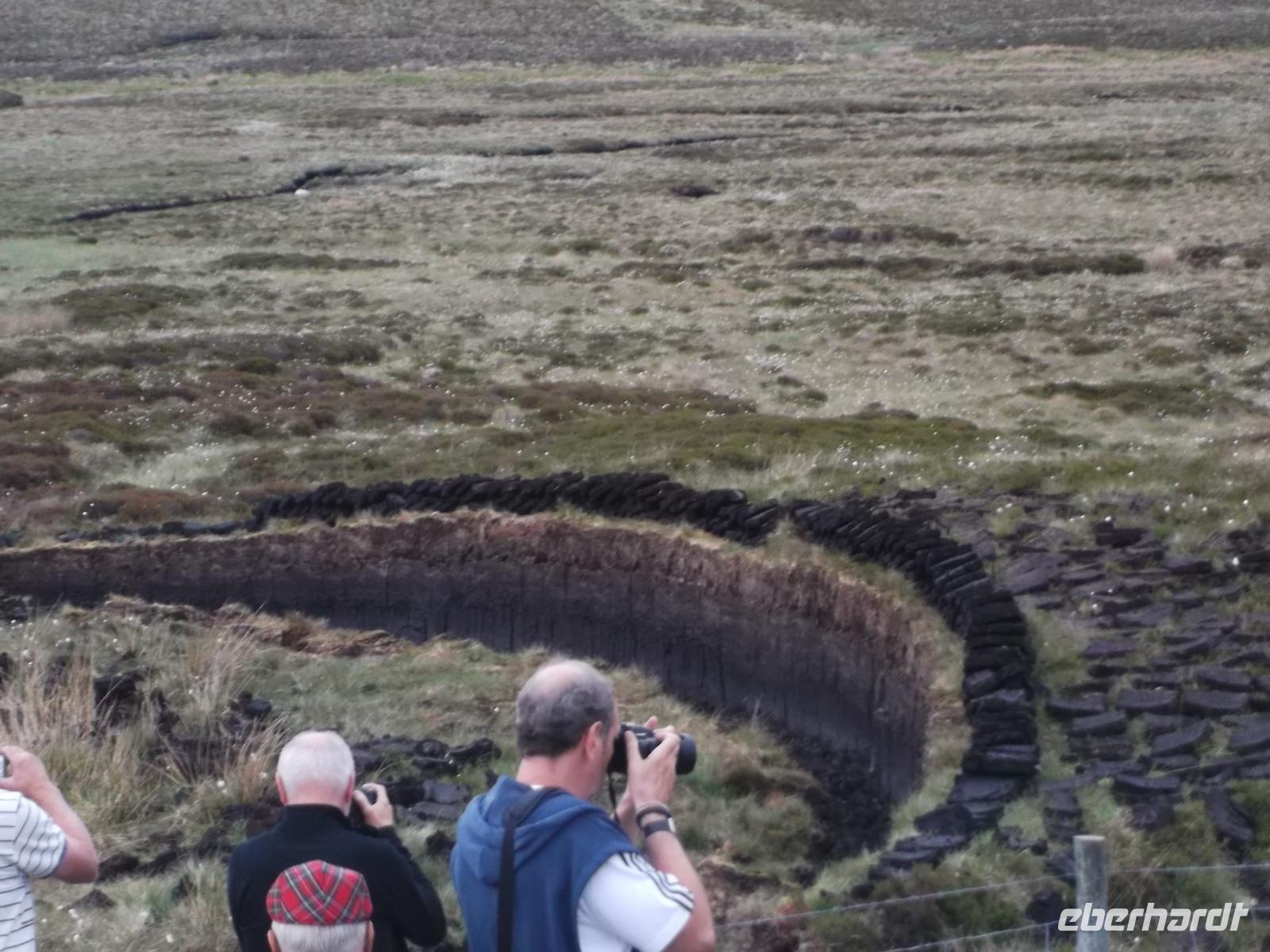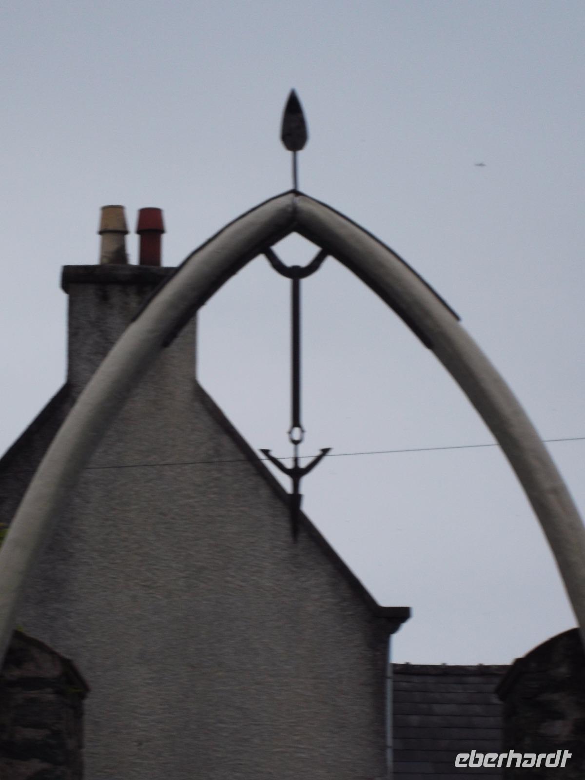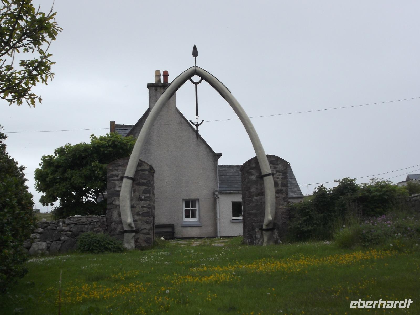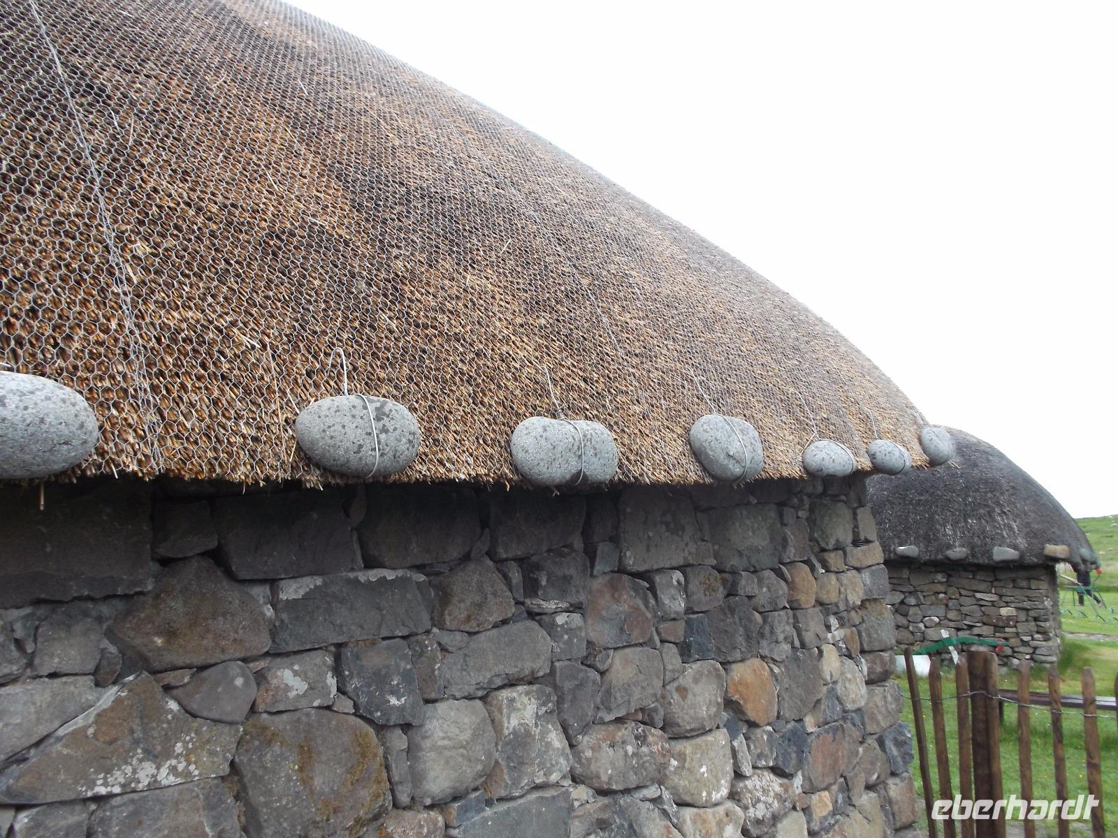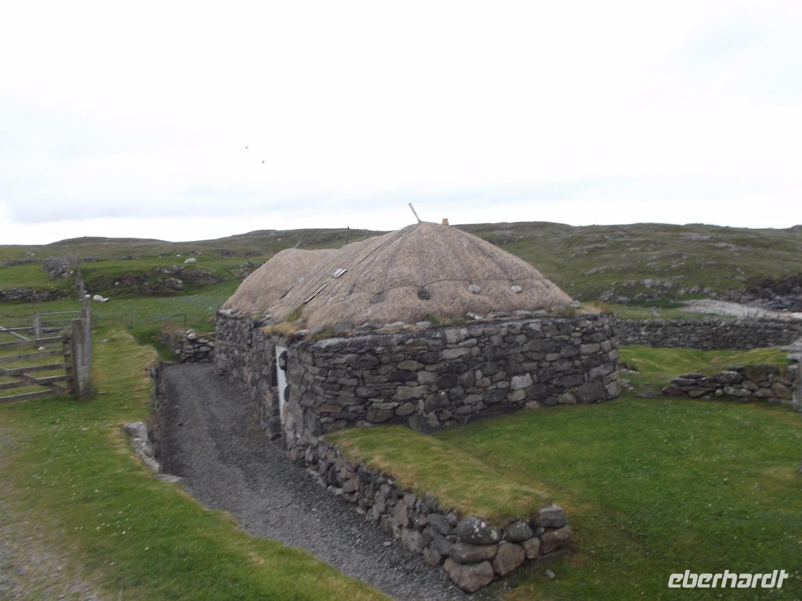 Lewis trägt, trotz seines rauhen Klimas, zahlreiche Spuren prähistorischer und mittelalterlicher Besiedlung. Wir begannen unsere heutige Rundfahrt hier im Norden und folgten einer Art Rundweg von der Inselhauptstadt Stornoway aus. Nach einem Fotostopp am „Whalebone Archway", dem originellen Hauseingang aus dem Kiefer eines Blauwals, statteten wir dem Hebridendorfes An Gerannean einen Besuch ab. Die alte Fischersiedlung besteht aus (restaurierten) Hebriden-Hütten, sogenannten „Blackhouses" und liegt direkt am Ozean. Der einst für nahezu alle Hebridendörfer traditionelle Haustyp wurde auf den Inseln, im Norden Schottland bis hin nach Irland verwendet. Ursprünglich lebten Menschen und Haustiere, nur durch eine Wand getrennt, unter einem Stroh- oder Grasdach zusammen. Auf Trockenmauerwerk, das mit Gras und Moos abgedichtet wurde, legte man hölzerne Dachbalken und bedeckte sie mit Grassoden und Schilfrohr oder Stroh. Gegen den stets wehenden Wind befestigte man das Dach mit übergeworfenen alten Fischernetzen, die alles zusammenhielten und mit dicken Steinen beschwert wurden. In der Hütte gab es zwar eine Feuerstelle, aber keinen Rauchabzug im Dach - so machte der direkt durch das Dach abziehende Qualm des Herdfeuers alles rußig - was den Häusern ihren Namen eintrug - konservierte aber gleichzeitig die oberhalb aufbewahrten Nahrungsmittel.