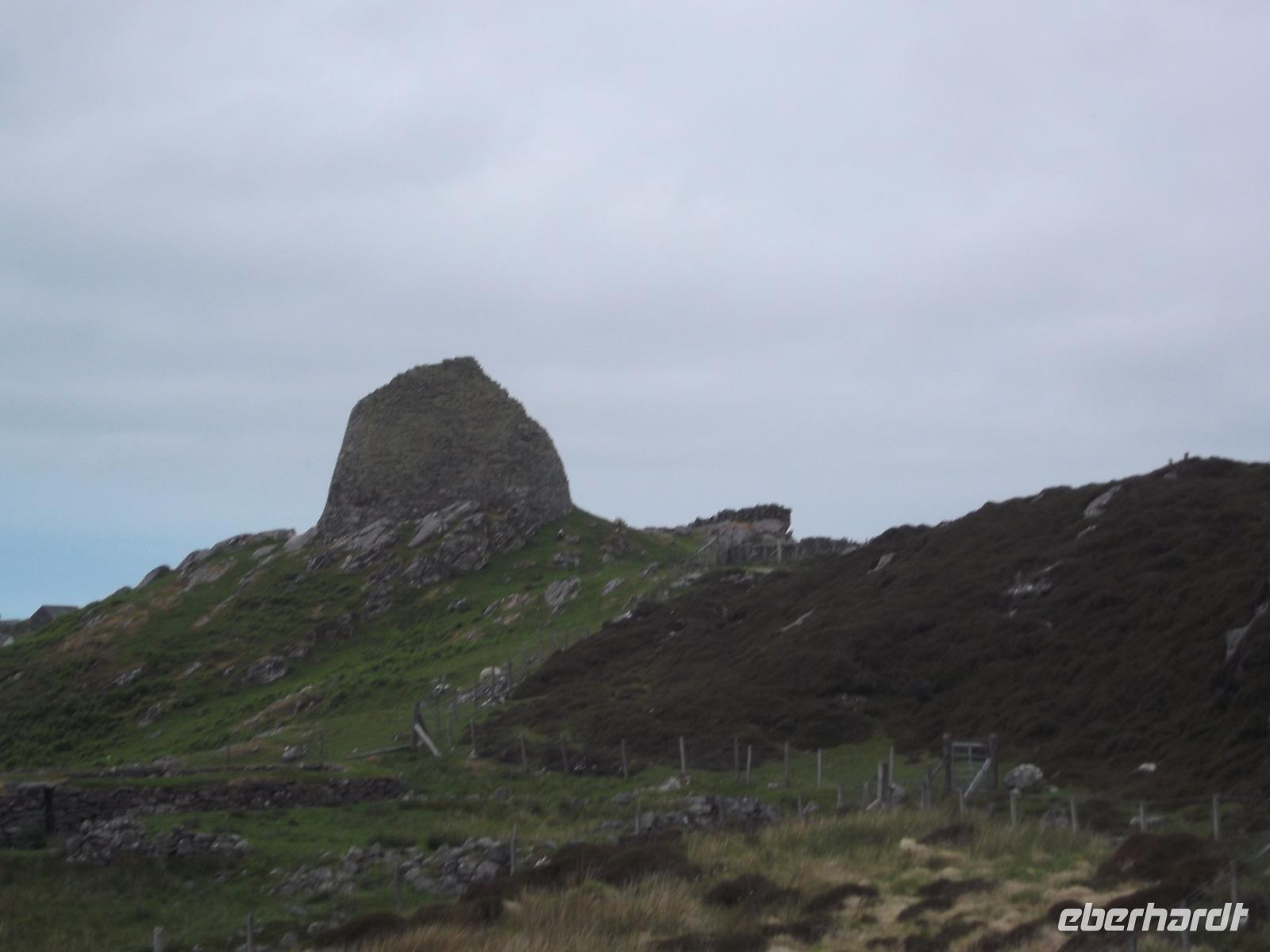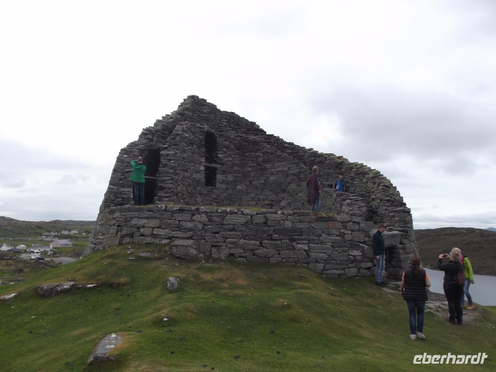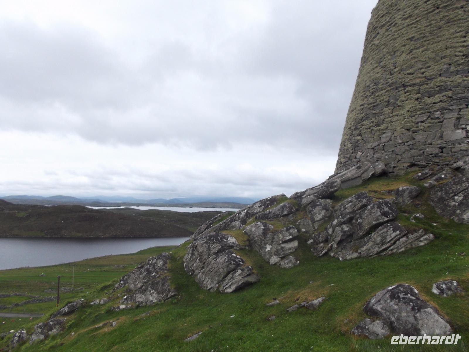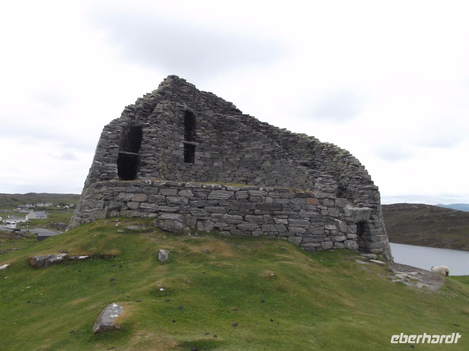 Nach einem Bummel durch das Dörfchen, dessen Häuser man teilweise als Ferienwohnungen mieten kann, fuhren wir zu einem weiteren typischen Wohnsitz, demDun Carloway Broch. Solche „Brochs", runde kegelstumpfartige Clansitze, ebenfalls aus Trockenmauerwerk, findet man bis auf wenige Ausnahmen nur im Norden Schottlands. Die bis zu 15 m hohen Rundtürme waren doppelwandig, wobei der Hohlraum zwischen den Mauern für Gänge, Wohn- und Aufbewahrungsräume genutzt wurde. Von den etwa 500 bekannten Brochs sind einige gut erhalten, darunter der von uns besuchte Dun Carloway Broch.