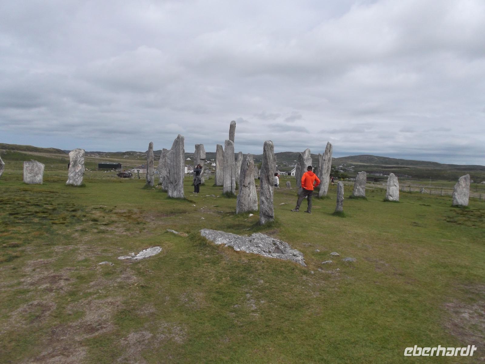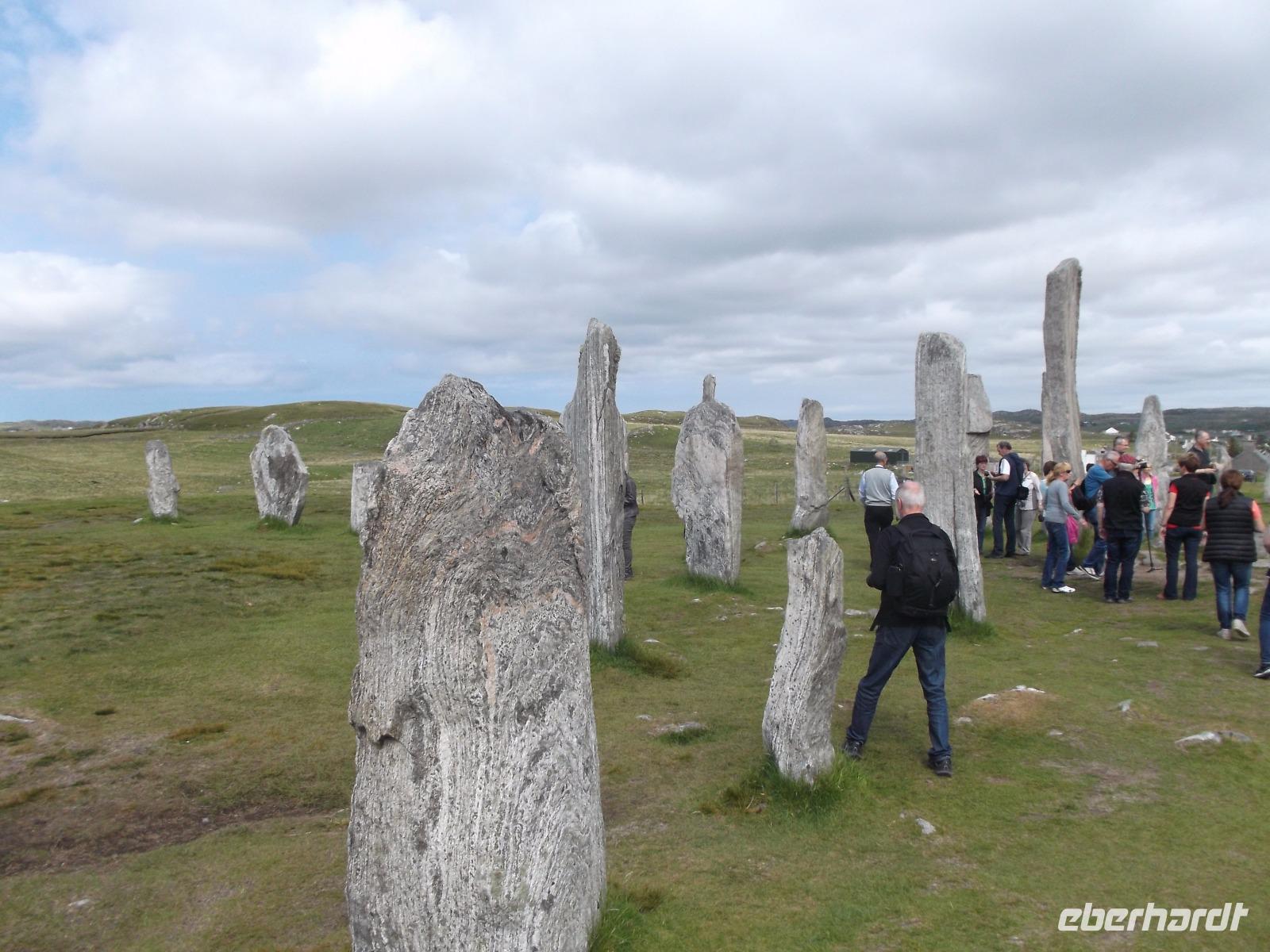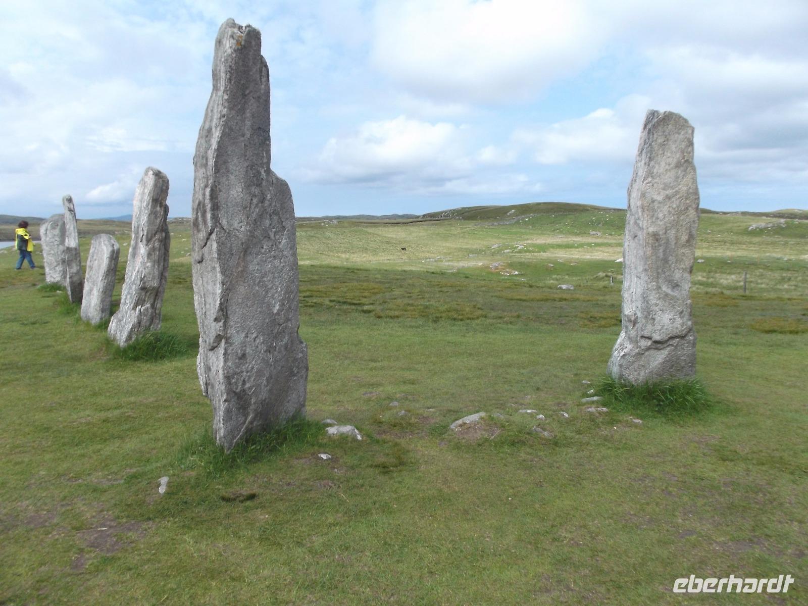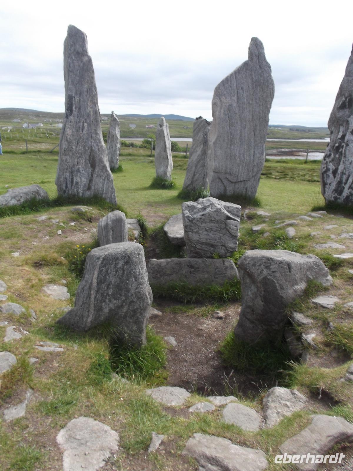 Als Höhepunkt eines jeden Besuchs der Insel Lewis darf man aber die Besichtigung des Großsteinkreises Standing Stones of Callanish empfinden. Um seine Bedeutung hervorzuheben, wird der Ort mitunter auch als „Stonehenge Schottlands" bezeichnet, was aber nur Art Wertung sein kann und vielleicht der Tastsache geschuldet, dass beide Monumente aus etwa derselben Erbauungszeit stammen. Ansonsten ist die Ähnlichkeit eher gering, vielleicht sind sie in ihrer Funktion vergleichbarer, die aber bis heute nicht komplett enträtselt ist. Auf jeden Fall zählt die kreuzförmige gewaltige Steinsetzung von Callanish zu den besterhaltenen Megalithanlagen Schottlands und wohl in ganz Europa. Der Großsteinbau aus zwei einander kreuzenden Steinreihen ist exakt nach den Himmelsrichtungen ausgerichtet und am Kreuzungspunkt von einem Steinkreis umgeben. Zudem finden sich im Inneren des Kreises Überreste eines Dolmens, eines jungsteinzeitlichen Großsteingrabes. Die Wissenschaftler weisen der Anlage heute die Funktion sowohl als Begräbnisstätte zu, aber auch - wie Stonehenge in Südengland - als Kalender sowie zur Berechnung von Stern- und vor allem Mondbewegungen. Ob man will oder nicht - beim Besuch des Denkmals aus der Steinzeit mit seiner Aura des Geheimnisvollen und Mystischen kann man sich seiner Wirkung kaum entziehen.