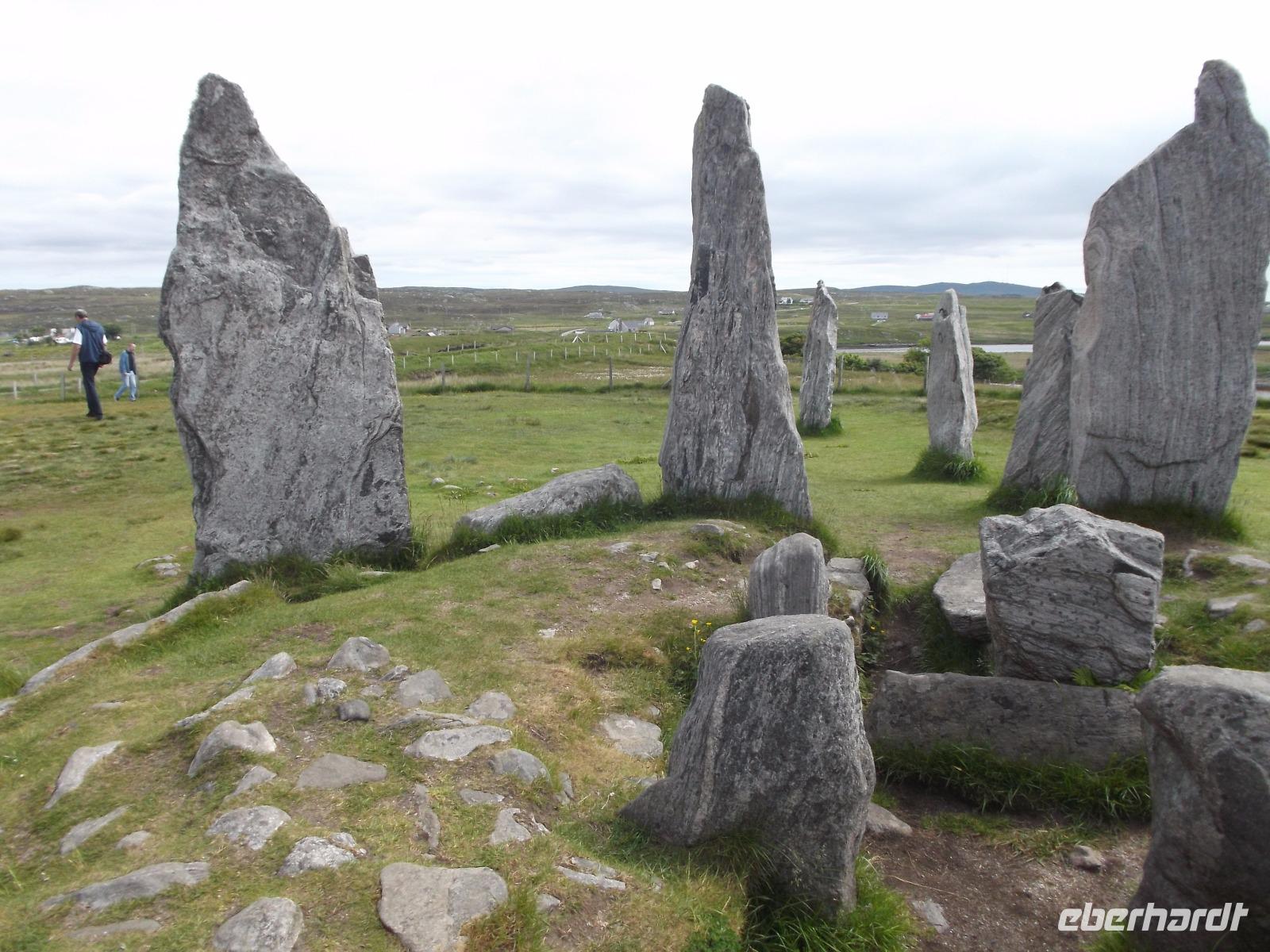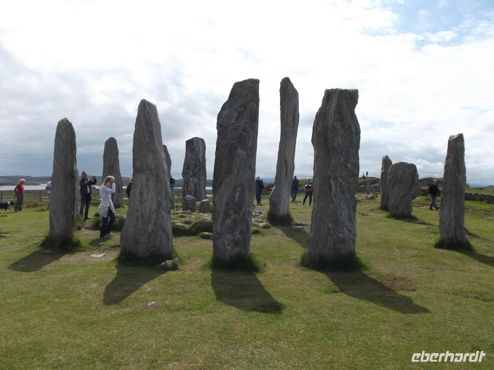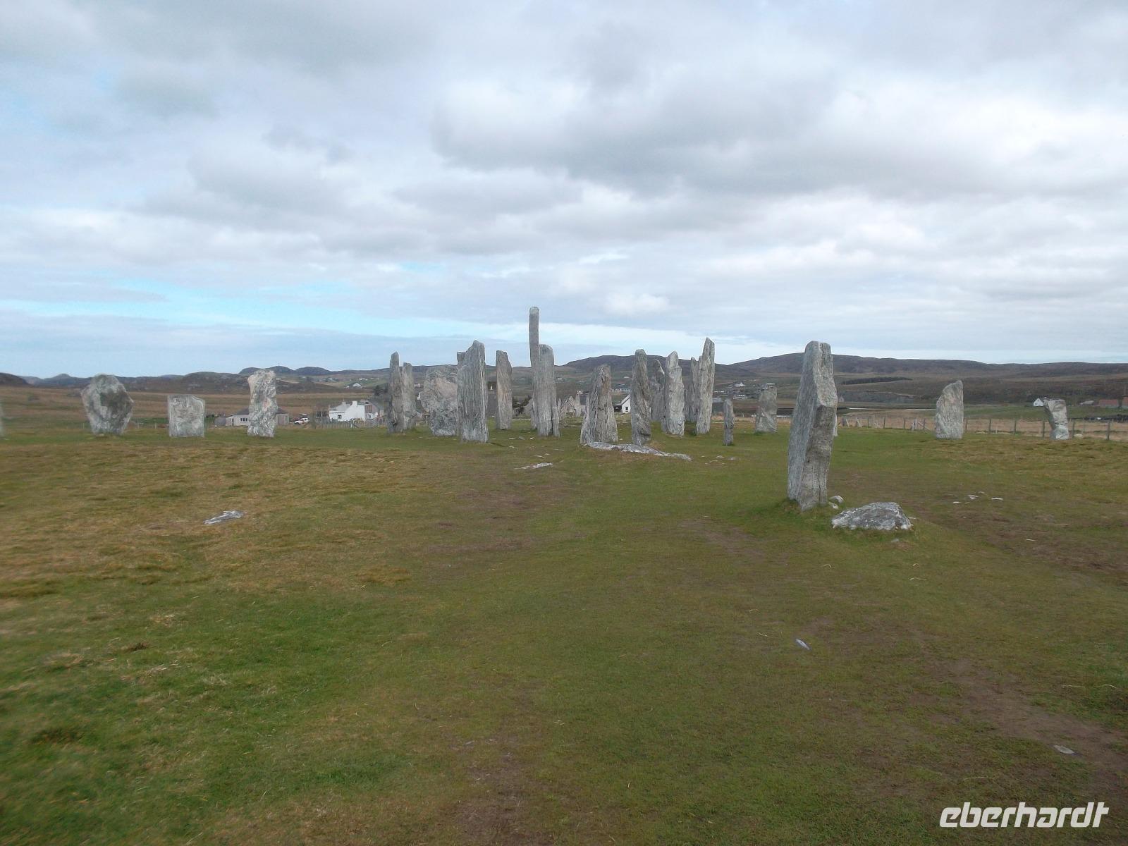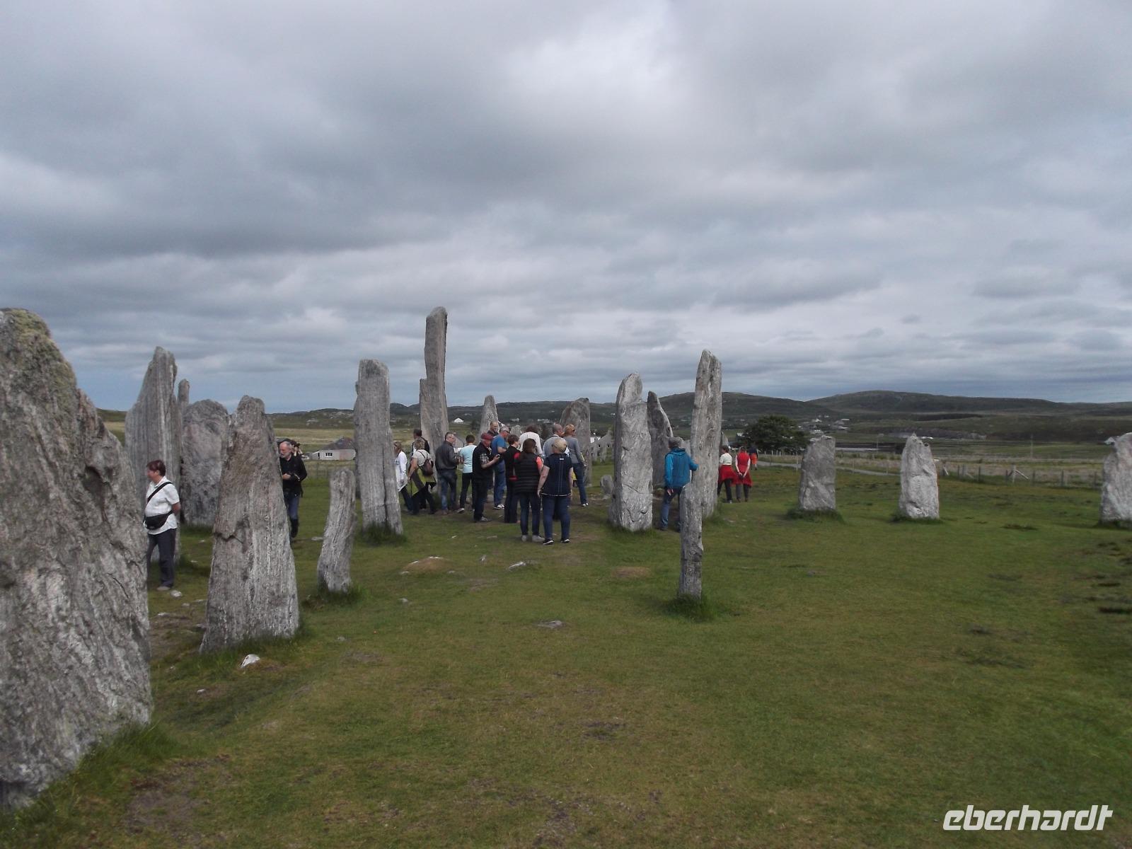 Als Höhepunkt eines jeden Besuchs der Insel Lewis darf man aber die Besichtigung des Großsteinkreises Standing Stones of Callanish empfinden. Um seine Bedeutung hervorzuheben, wird der Ort mitunter auch als „Stonehenge Schottlands" bezeichnet, was aber nur Art Wertung sein kann und vielleicht der Tastsache geschuldet, dass beide Monumente aus etwa derselben Erbauungszeit stammen. Ansonsten ist die Ähnlichkeit eher gering, vielleicht sind sie in ihrer Funktion vergleichbarer, die aber bis heute nicht komplett enträtselt ist. Auf jeden Fall zählt die kreuzförmige gewaltige Steinsetzung von Callanish zu den besterhaltenen Megalithanlagen Schottlands und wohl in ganz Europa. Der Großsteinbau aus zwei einander kreuzenden Steinreihen ist exakt nach den Himmelsrichtungen ausgerichtet und am Kreuzungspunkt von einem Steinkreis umgeben. Zudem finden sich im Inneren des Kreises Überreste eines Dolmens, eines jungsteinzeitlichen Großsteingrabes. Die Wissenschaftler weisen der Anlage heute die Funktion sowohl als Begräbnisstätte zu, aber auch - wie Stonehenge in Südengland - als Kalender sowie zur Berechnung von Stern- und vor allem Mondbewegungen. Ob man will oder nicht - beim Besuch des Denkmals aus der Steinzeit mit seiner Aura des Geheimnisvollen und Mystischen kann man sich seiner Wirkung kaum entziehen.
