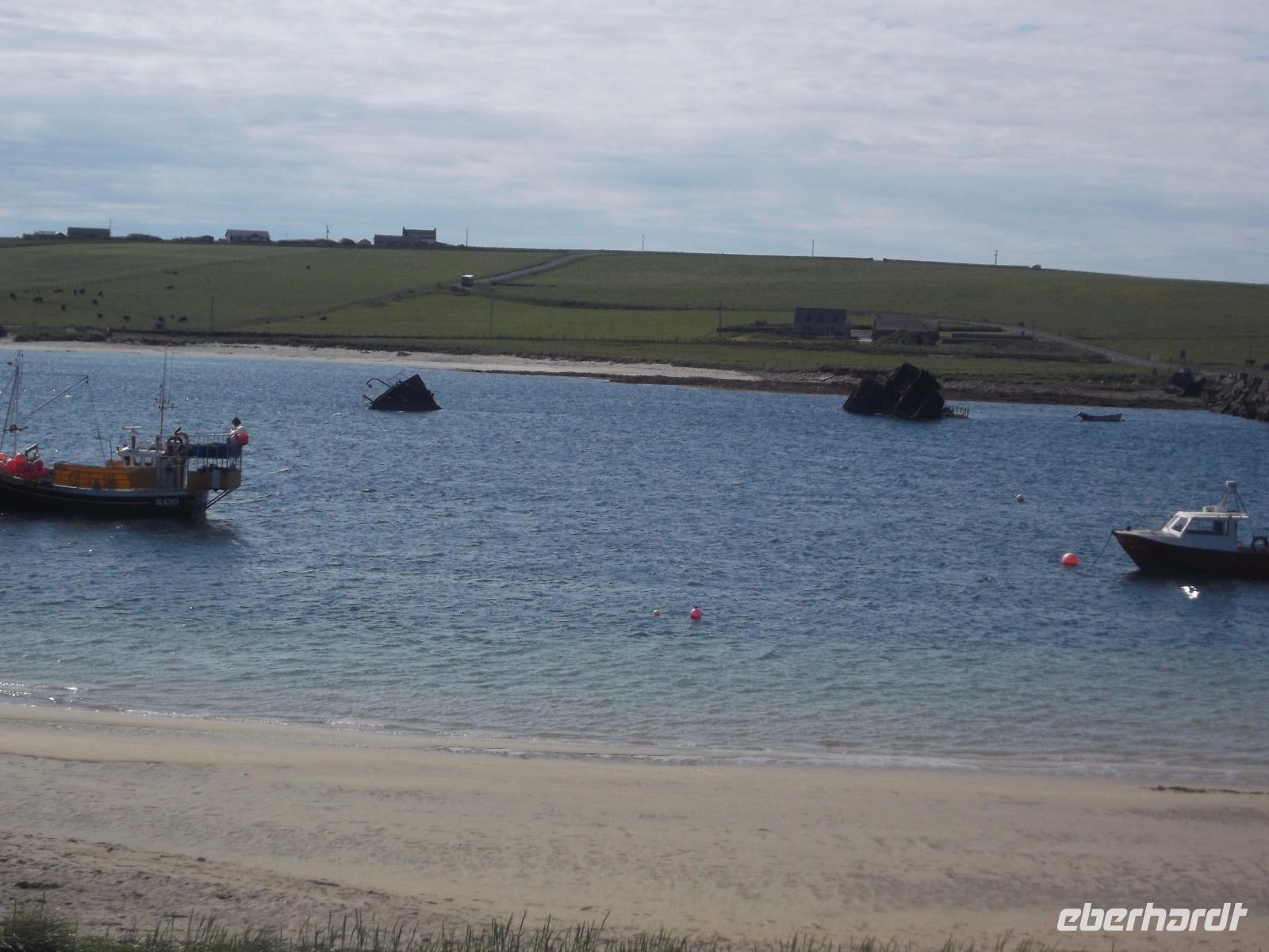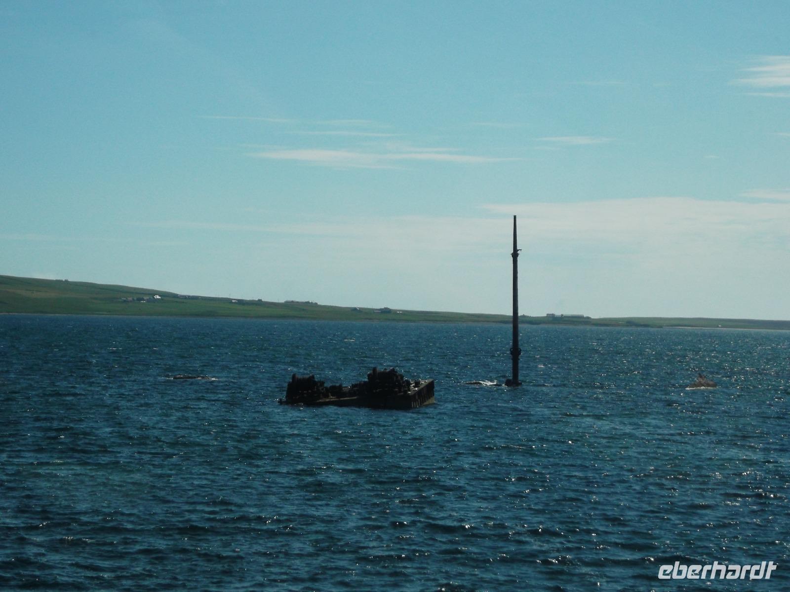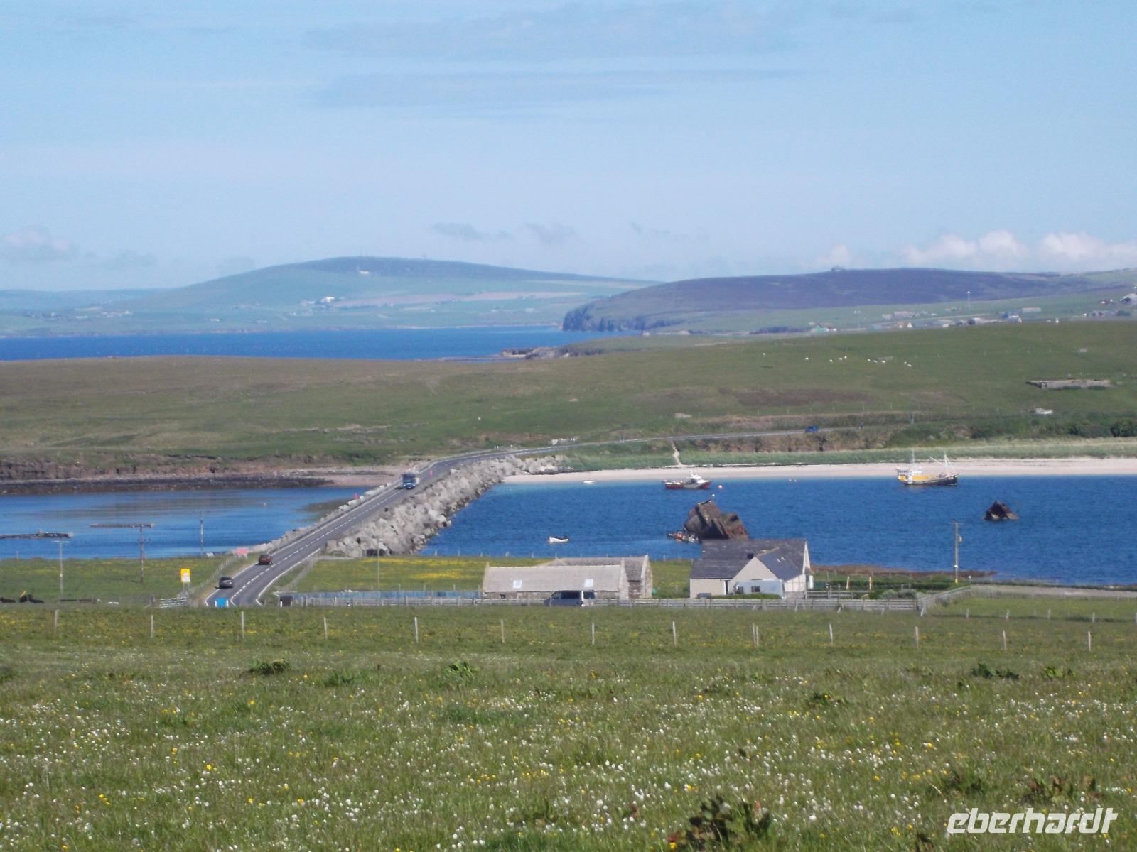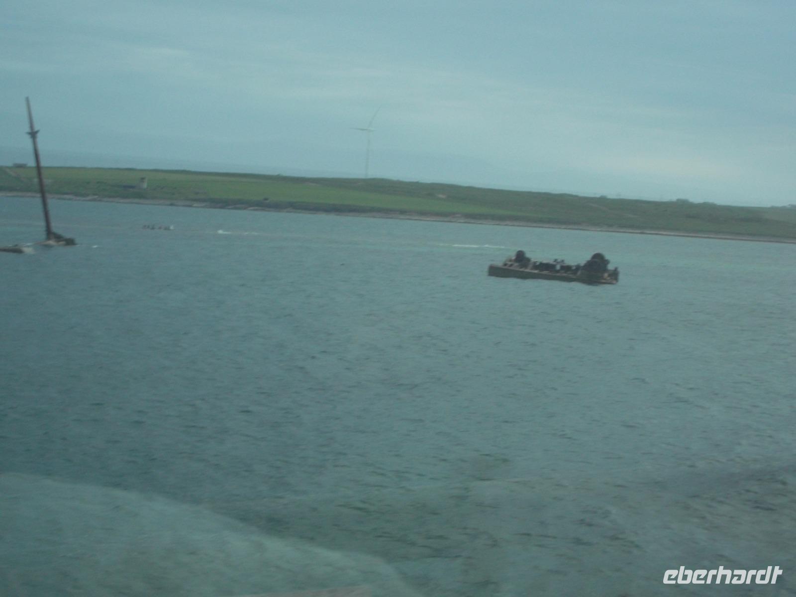 Unser Bus brachte uns frühmorgens zum winzigen Fährhafen von John O'Groats, dem nordöstlichsten Ort der britischen Hauptinsel. Hier überquert eine Passagierfähre den Pentland Firth, der Großbritannien von den nördlich gelegenen Orkney-Inseln trennt. Die Inselgruppe, die aus insgesamt etwa 70 Eilanden und der Hauptinsel Mainland besteht, hat mehr skandinavischen als schottischen Charakter, denn sie stand bis zum 15. Jh. unter dem Einfluß des norwegischen Königreichs. Die kleine Passagierfähre brachte uns nach Burwick auf South Ronaldsay, wo im Hafen schon ein einheimischer Bus auf uns, gesteuert von dem sehr kooperativen Fahrer Keith, wartete. Wir umrundeten mit mehreren Fotostopps - als Programm für den ganzen Vormittag - die berühmte Bucht von Scapa Flow. Diese größte komplett von Inseln eingekreiste Meeresfläche Großbritanniens war viele Jahrhunderte lang ein als riesiger Tiefwasserhafen genutzter Flottenstützpunkt. So wurde er in beiden Weltkriegen nicht nur Stationierungsort der britischen Home Fleet, sondern wurde im ersten Weltkrieg Schauplatz der spektakulären Selbstversenkung der hier internierten deutschen Kriegsflotte. Über siebzig Schiffe gingen damals vor den staunenden Augen der Orkadians - wie Orkneys Bewohner genannt werden - und der Seeleute der britischen Flotte auf Grund, während die Besatzungen in den Beibooten an Land ruderten. Bis auf wenige kleinere noch auf dem Grund liegende sind alle Schiffe seither gehoben worden. Die Wracks allerdings, deren rostende Überreste wir auf unserem sehen und fotografieren konnten, gehörten zur „Schiffssperre" aus dem zweiten Weltkrieg. Nach dem unerwarteten und erfolgreichen Angriff eines deutschen U-Bootes auf das hier vor Anker liegende britische Flaggschiff „Royal Oak", das kurz nach seiner Torpedierung mit über 800 Besatzungsmitgliedern in den Fluten von Scapa Flow versank, hatte der britische Premierminister Winston Churchill die sofortige Sperrung fast aller Zufahrten nach Scapa Flow angeordnet. Alte Fracht- und Fischereischiffe wurden erst einmal als U-Boot-Sperre versenkt, später errichteten italienische Kriegsgefangene Stein- und Betondämme. Diese sogenannte „Churchill Barriere" verbindet heute mehrere der kleinen Inseln mit der Hauptinsel Mainland und auf ihnen fuhren wir weiter. Der erste Besuch galt dann der „italienischen Kapelle", von Kriegsgefangenen im zweiten Weltkrieg hier während ihrer Internierung errichtet. Eine Wellblechbaracke wurde zu einem kunsthistorisch wertvollen und in seiner unerwarteten Kunstfertigkeit imposanten katholischen Kirchlein umgebaut. Nach der Besichtigung hier gab uns ein Aufenthalt in der zweitgrößten Stadt des Orkney-Archipels, Stromness, die Möglichkeit zur Versorgung in der Mittagspause Mittagszeit.