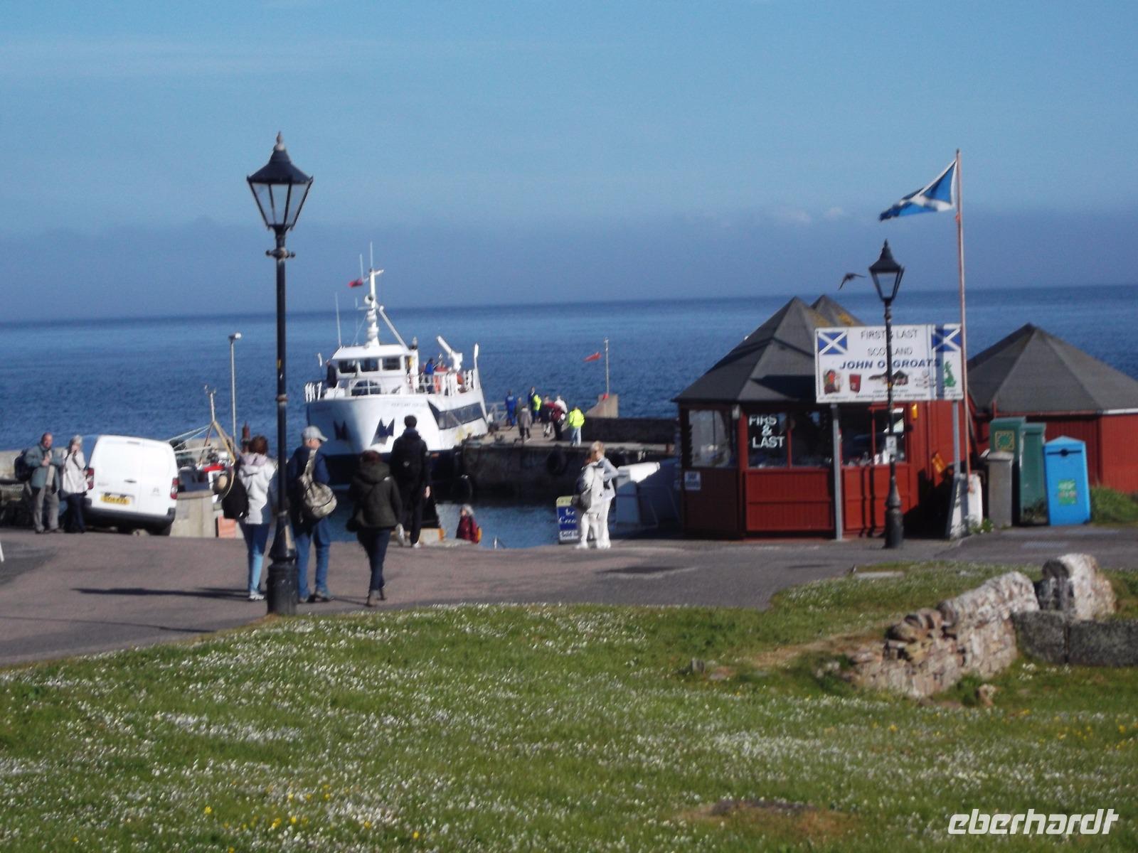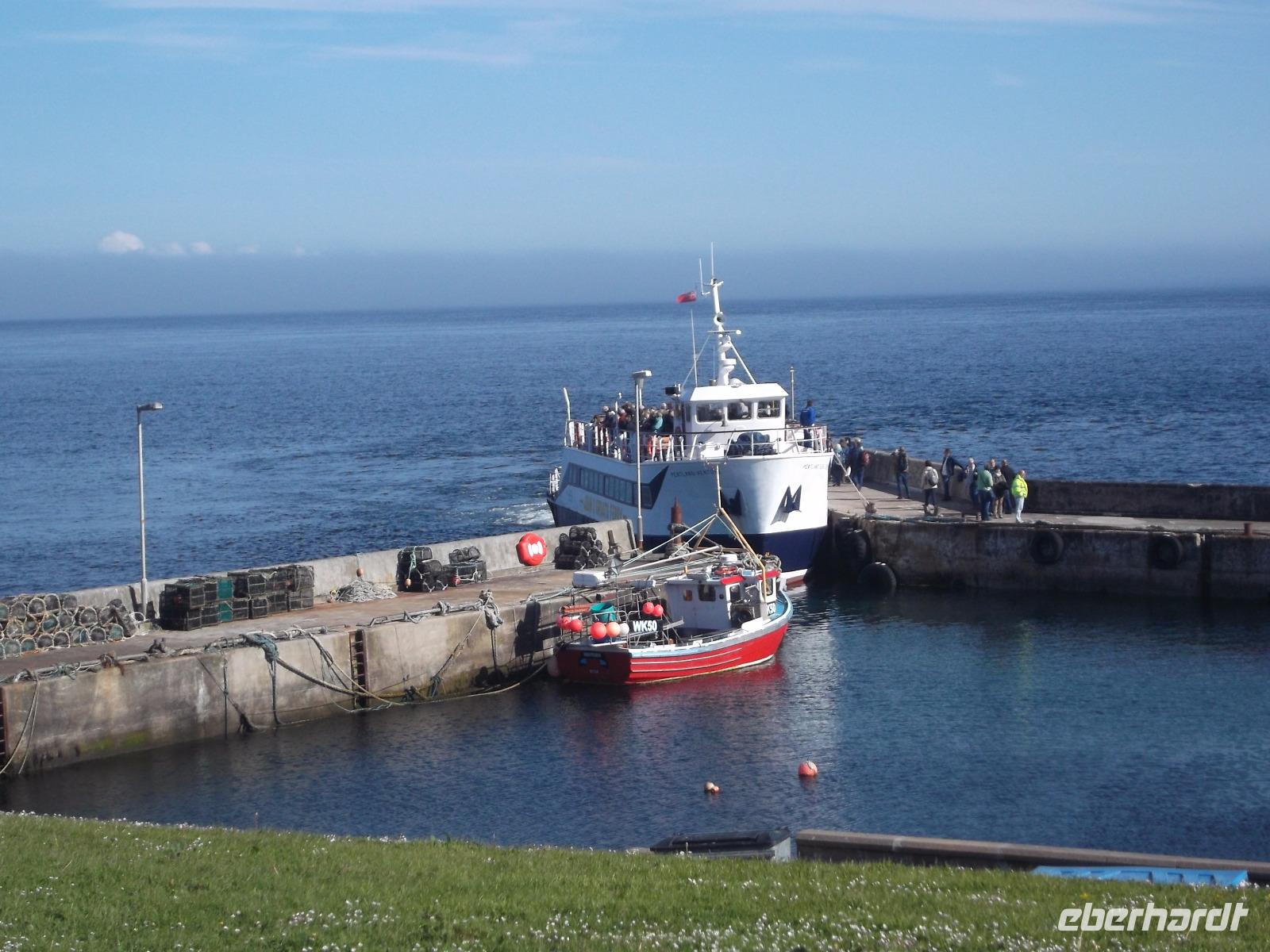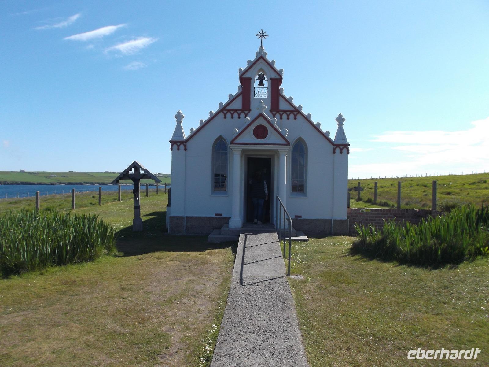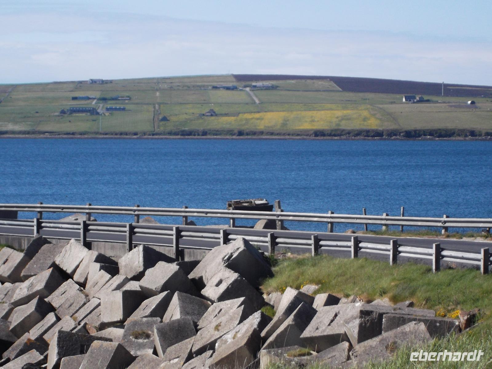 Unser Bus brachte uns frühmorgens zum winzigen Fährhafen von John O'Groats, dem nordöstlichsten Ort der britischen Hauptinsel. Hier überquert eine Passagierfähre den Pentland Firth, der Großbritannien von den nördlich gelegenen Orkney-Inseln trennt. Die Inselgruppe, die aus insgesamt etwa 70 Eilanden und der Hauptinsel Mainland besteht, hat mehr skandinavischen als schottischen Charakter, denn sie stand bis zum 15. Jh. unter dem Einfluß des norwegischen Königreichs. Die kleine Passagierfähre brachte uns nach Burwick auf South Ronaldsay, wo im Hafen schon ein einheimischer Bus auf uns, gesteuert von dem sehr kooperativen Fahrer Keith, wartete. Wir umrundeten mit mehreren Fotostopps - als Programm für den ganzen Vormittag - die berühmte Bucht von Scapa Flow. Diese größte komplett von Inseln eingekreiste Meeresfläche Großbritanniens war viele Jahrhunderte lang ein als riesiger Tiefwasserhafen genutzter Flottenstützpunkt. So wurde er in beiden Weltkriegen nicht nur Stationierungsort der britischen Home Fleet, sondern wurde im ersten Weltkrieg Schauplatz der spektakulären Selbstversenkung der hier internierten deutschen Kriegsflotte. Über siebzig Schiffe gingen damals vor den staunenden Augen der Orkadians - wie Orkneys Bewohner genannt werden - und der Seeleute der britischen Flotte auf Grund, während die Besatzungen in den Beibooten an Land ruderten. Bis auf wenige kleinere noch auf dem Grund liegende sind alle Schiffe seither gehoben worden. Die Wracks allerdings, deren rostende Überreste wir auf unserem sehen und fotografieren konnten, gehörten zur „Schiffssperre" aus dem zweiten Weltkrieg. Nach dem unerwarteten und erfolgreichen Angriff eines deutschen U-Bootes auf das hier vor Anker liegende britische Flaggschiff „Royal Oak", das kurz nach seiner Torpedierung mit über 800 Besatzungsmitgliedern in den Fluten von Scapa Flow versank, hatte der britische Premierminister Winston Churchill die sofortige Sperrung fast aller Zufahrten nach Scapa Flow angeordnet. Alte Fracht- und Fischereischiffe wurden erst einmal als U-Boot-Sperre versenkt, später errichteten italienische Kriegsgefangene Stein- und Betondämme. Diese sogenannte „Churchill Barriere" verbindet heute mehrere der kleinen Inseln mit der Hauptinsel Mainland und auf ihnen fuhren wir weiter. Der erste Besuch galt dann der „italienischen Kapelle", von Kriegsgefangenen im zweiten Weltkrieg hier während ihrer Internierung errichtet. Eine Wellblechbaracke wurde zu einem kunsthistorisch wertvollen und in seiner unerwarteten Kunstfertigkeit imposanten katholischen Kirchlein umgebaut. Nach der Besichtigung hier gab uns ein Aufenthalt in der zweitgrößten Stadt des Orkney-Archipels, Stromness, die Möglichkeit zur Versorgung in der Mittagspause Mittagszeit.